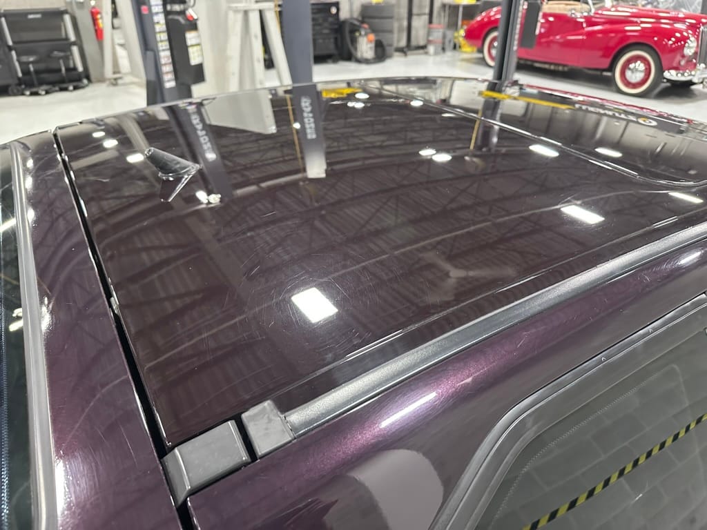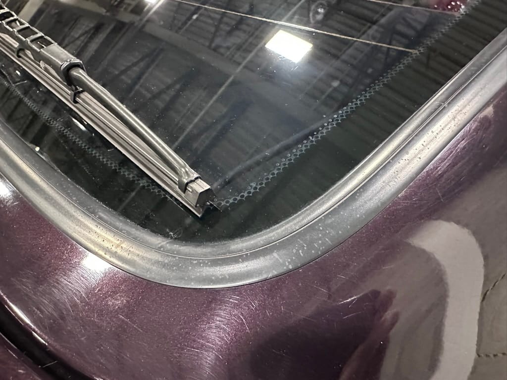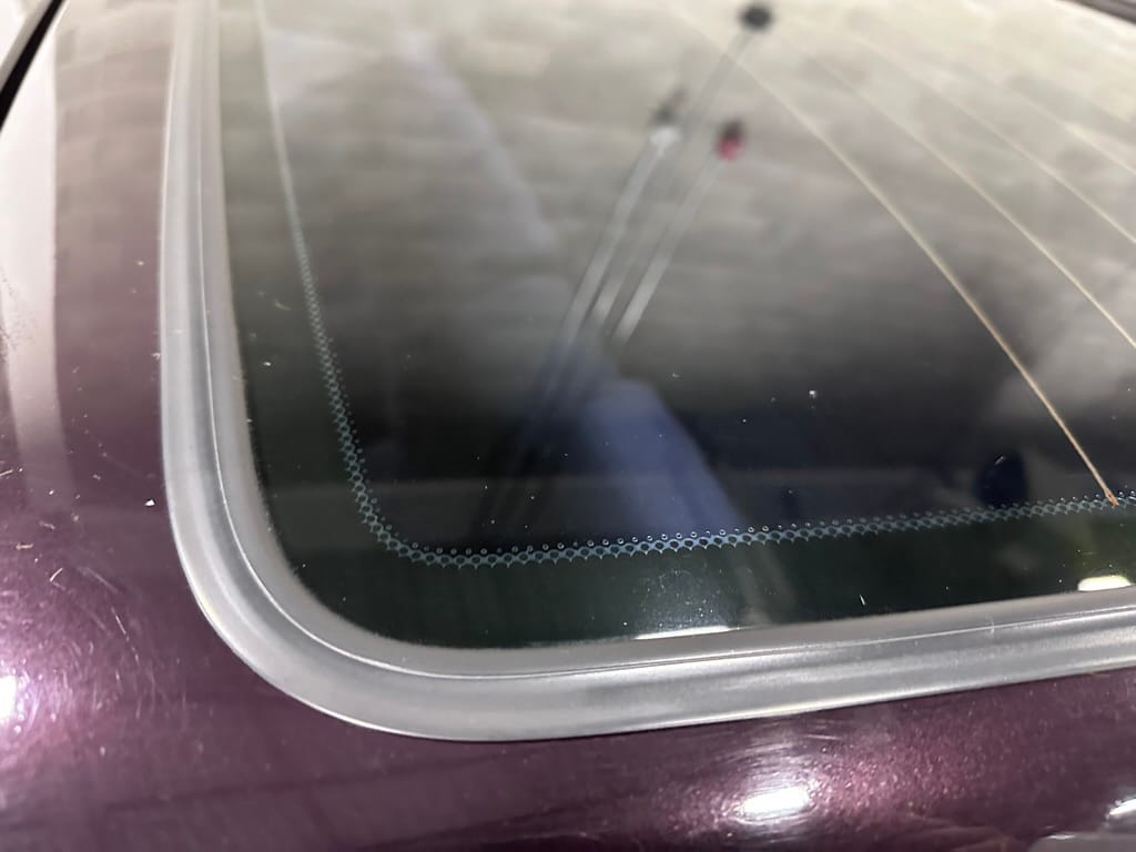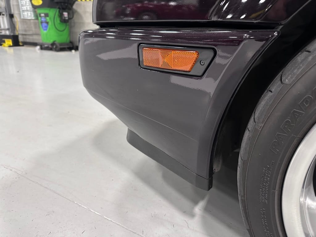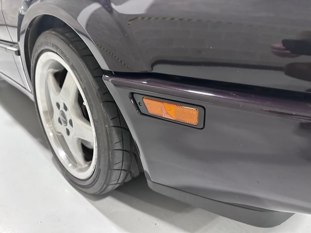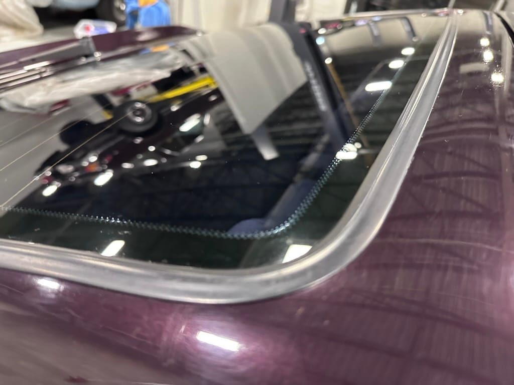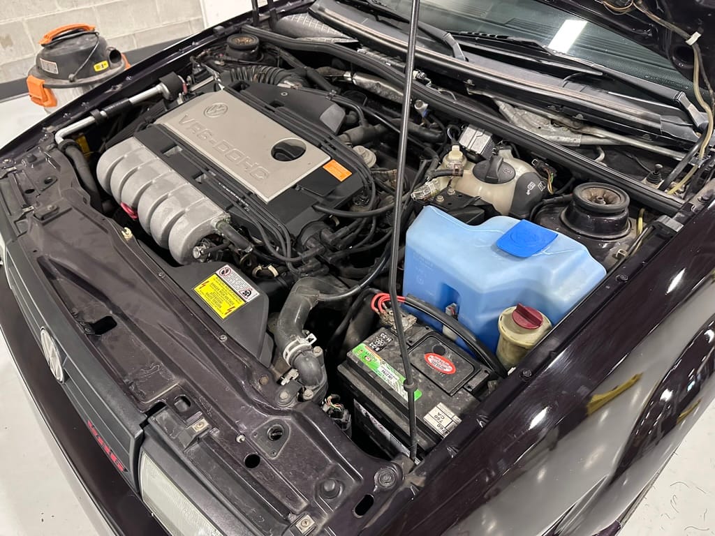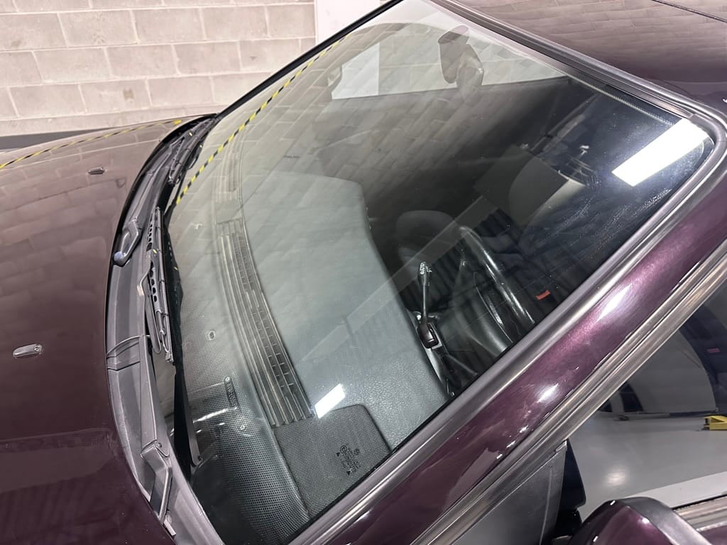 This Corrado has its original Burgundy Pearl Effect paint showing paint depth between 90 and 180 micrometers throughout. The paint is extremely nice, and could only benefit from a polish to look almost new. There is a ding on the top of the drivers door. There is a minor amount of corrosion starting beneath the seal on the hatchback glass.