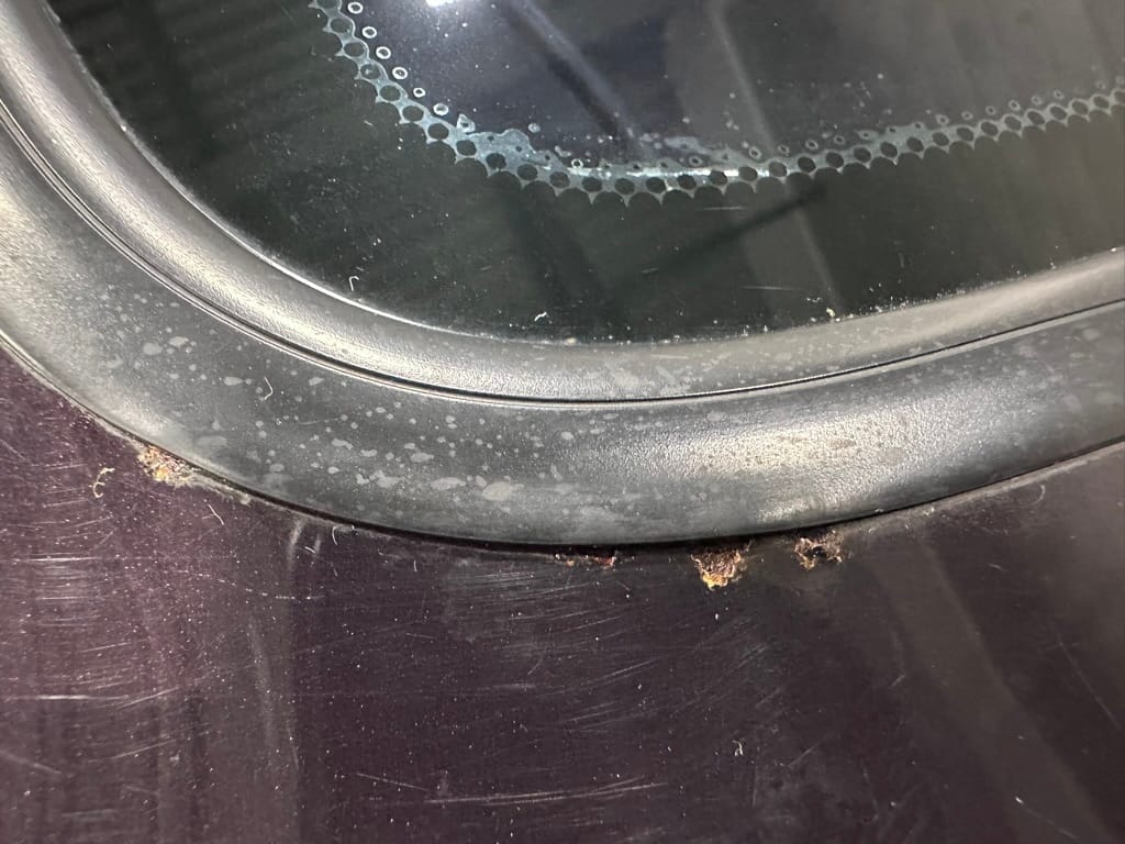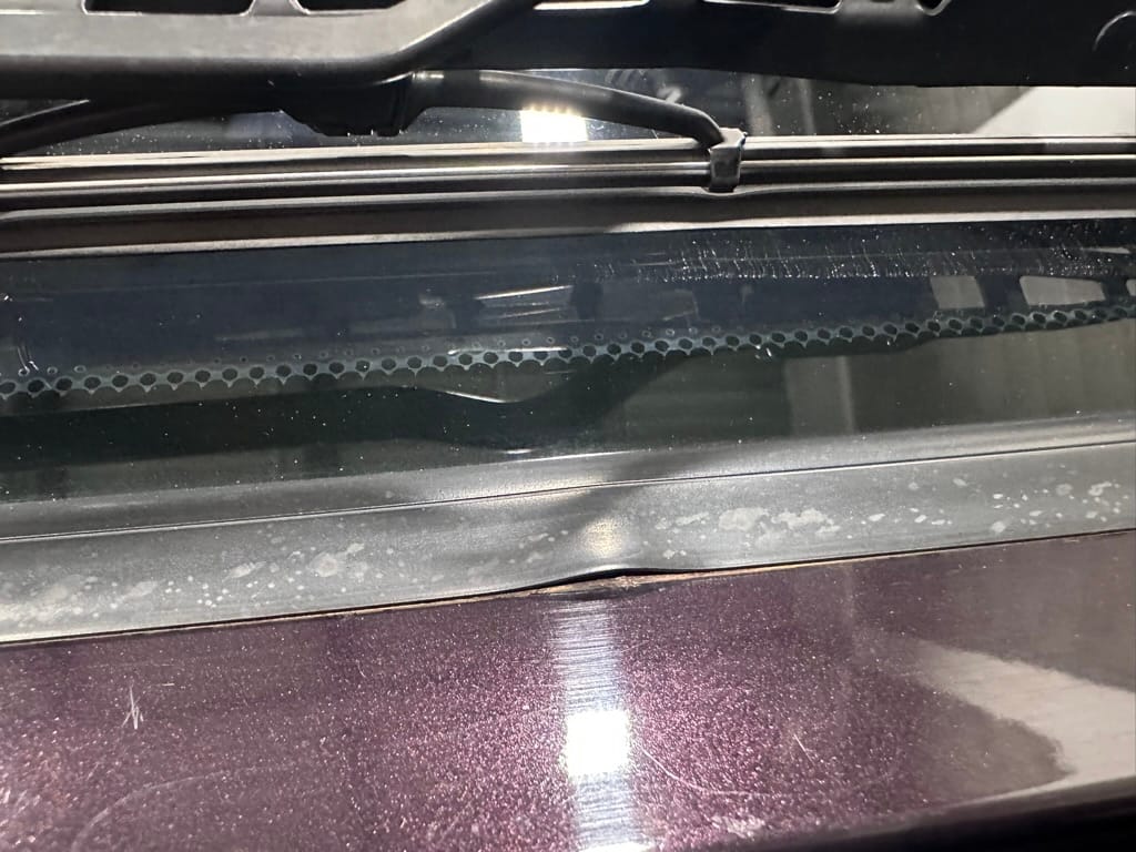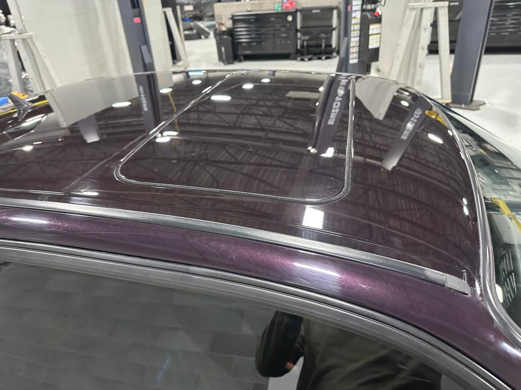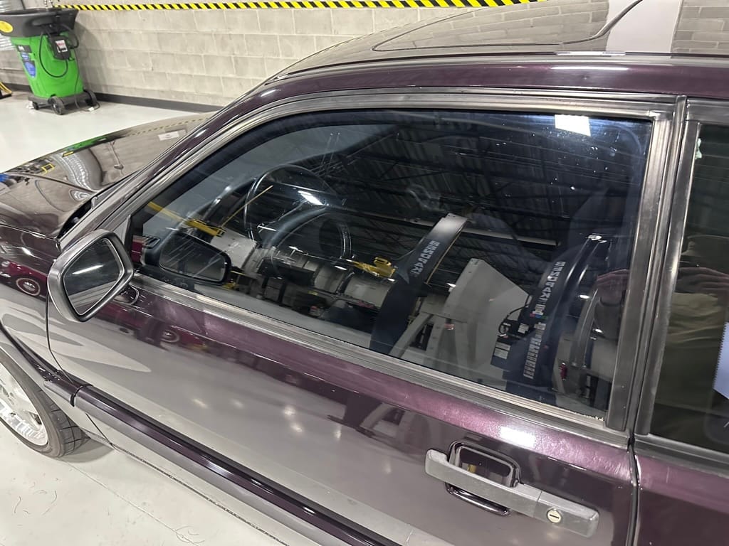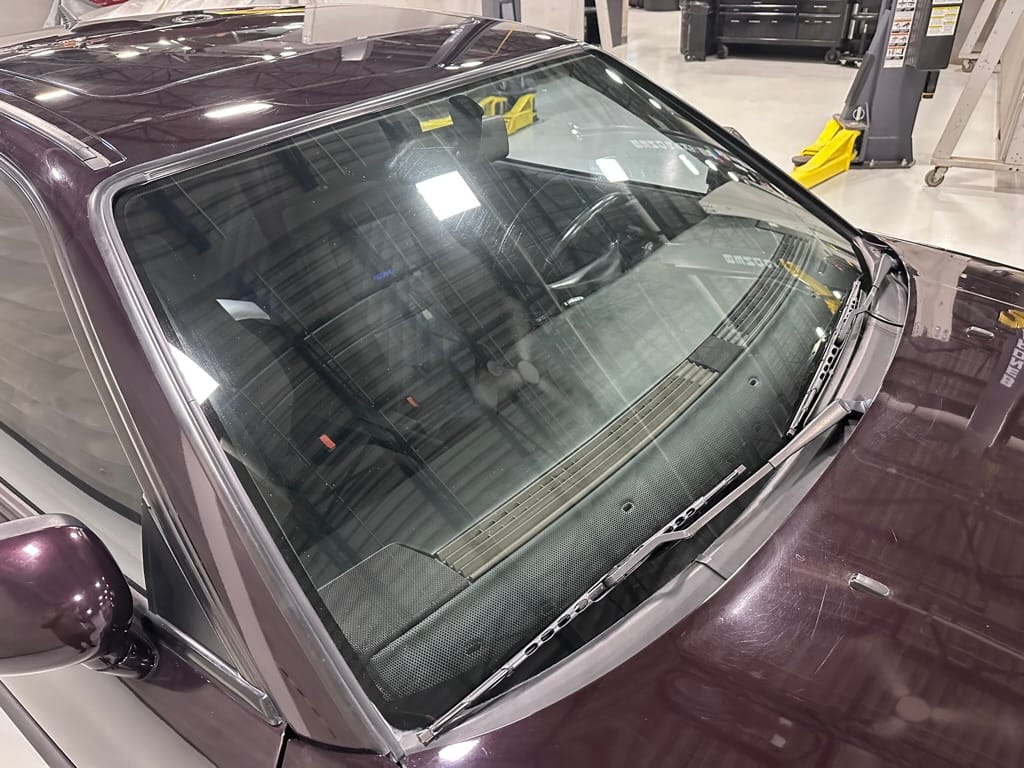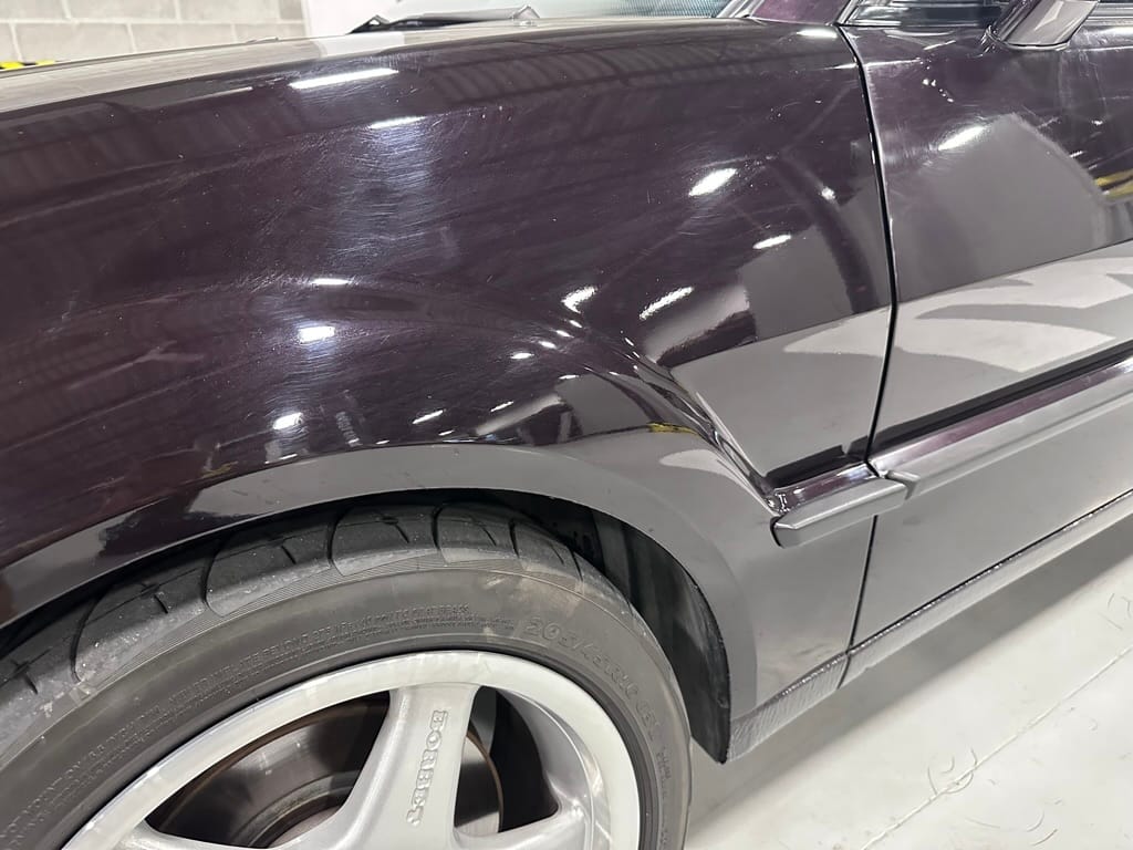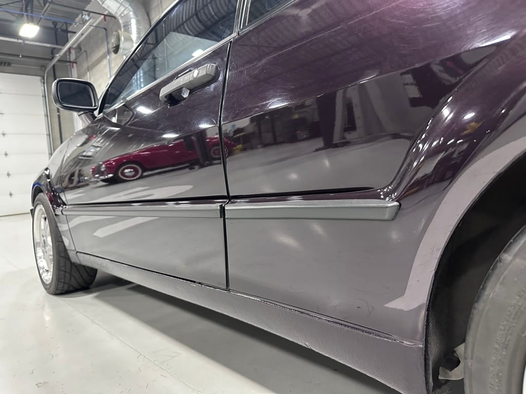 This Corrado has its original Burgundy Pearl Effect paint showing paint depth between 90 and 180 micrometers throughout. The paint is extremely nice, and could only benefit from a polish to look almost new. There is a ding on the top of the drivers door. There is a minor amount of corrosion starting beneath the seal on the hatchback glass.