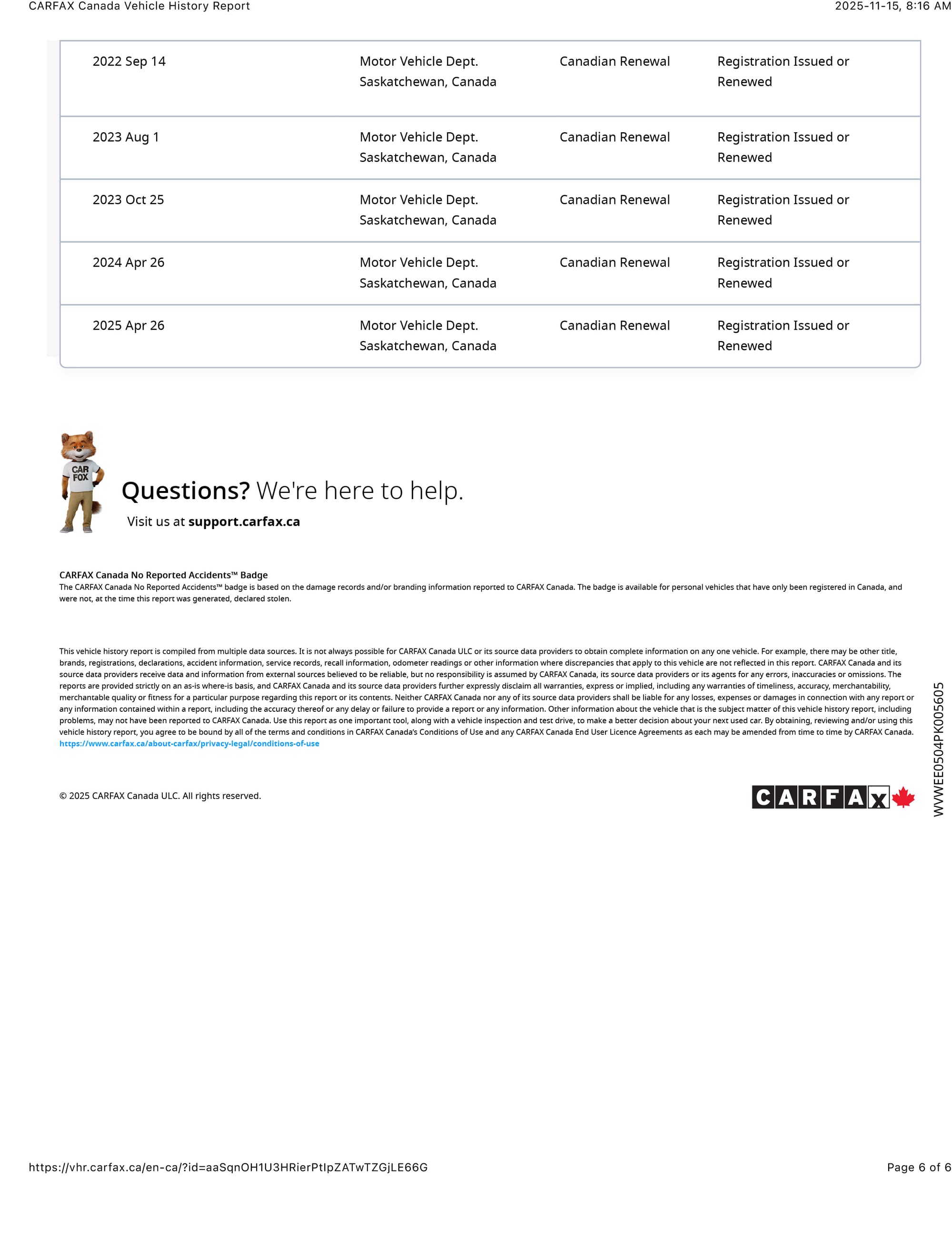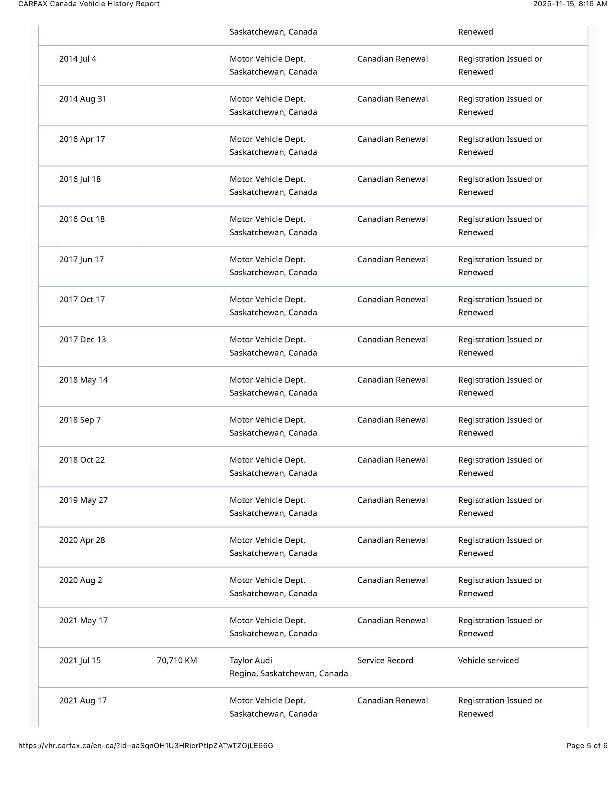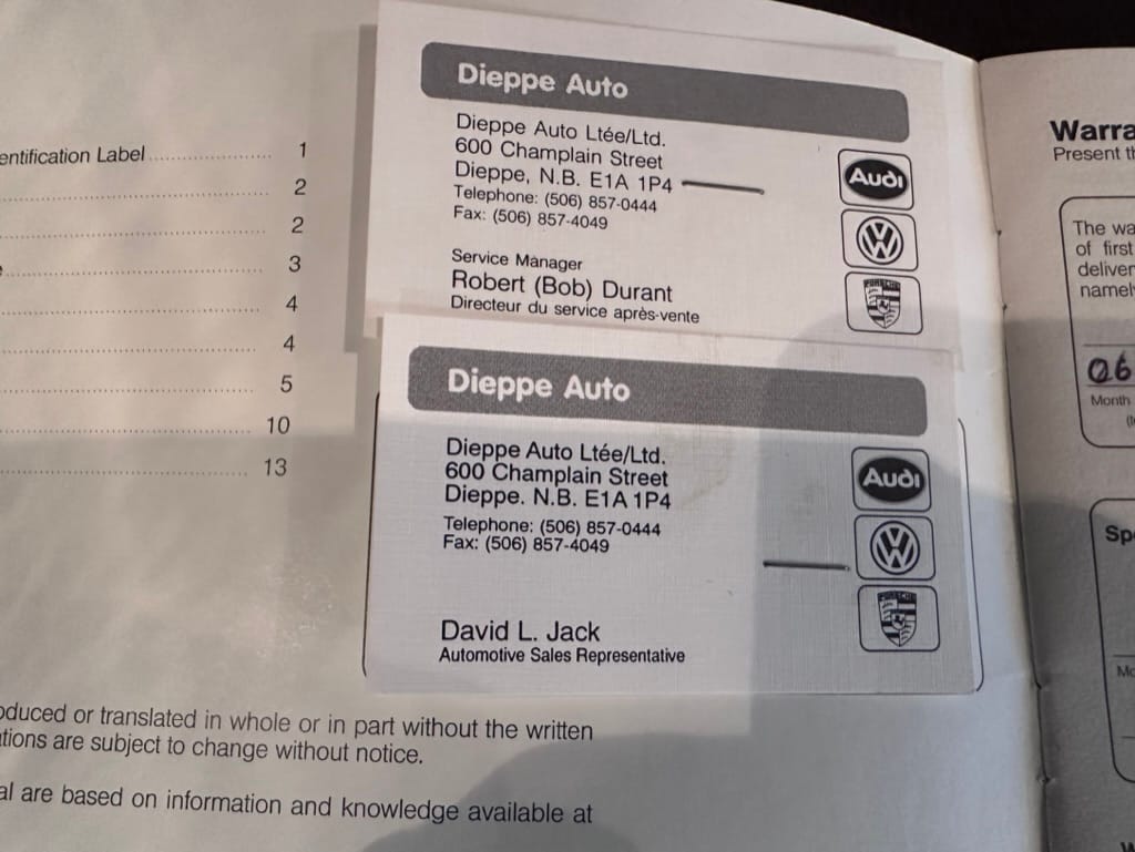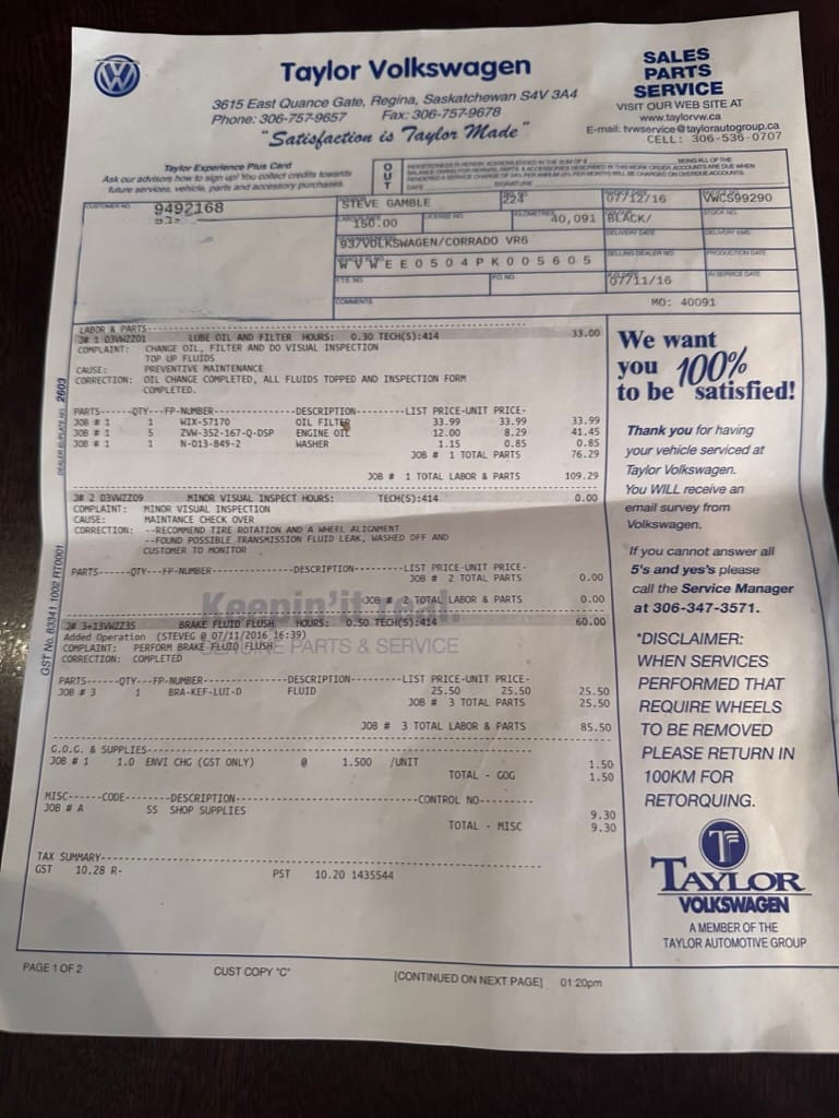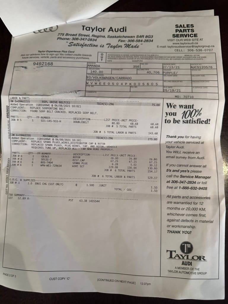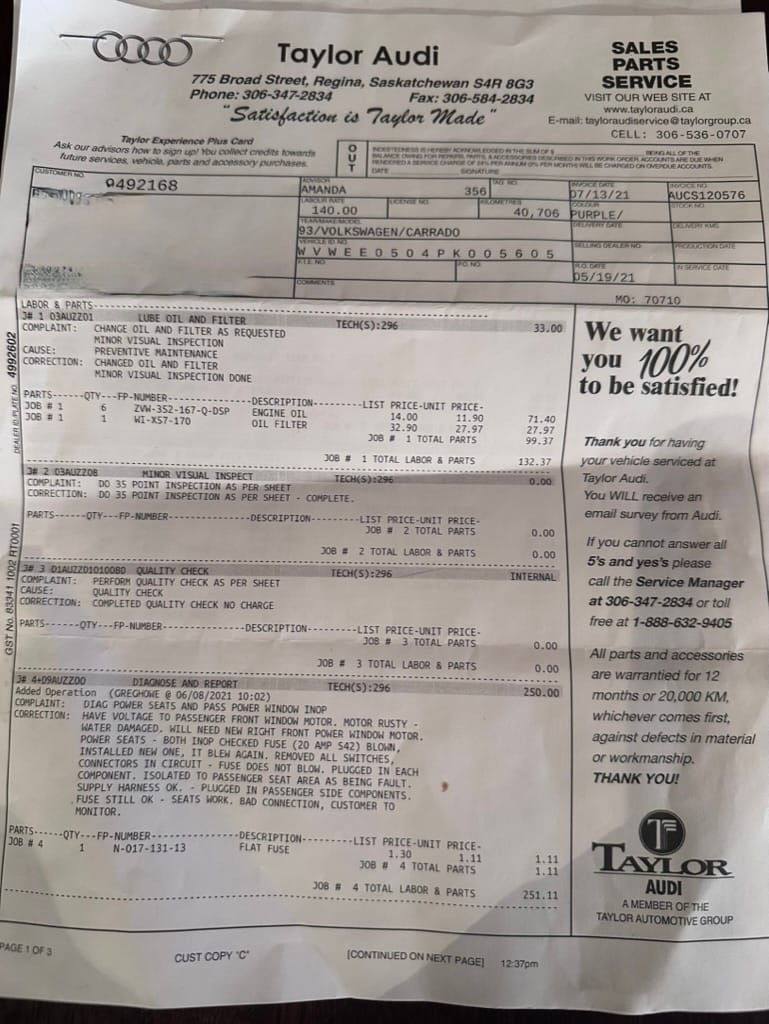 The car was then sold to Saskatchewan resident RH on June 18, 2003 and relocated to the Regina. It was then serviced at Taylor Audi/VW. A July 12, 2016 invoice from Taylor shows an inspection, oil service and brake fluid flush at 40,091km. A July 13, 2021 invoice, with mileage 40,706 shows an inspection, oil service, diagnosis and repair of power seats and passenger side electric window issues and replacement of spark plugs, wires, distributor cap, rotor and serpentine belt.