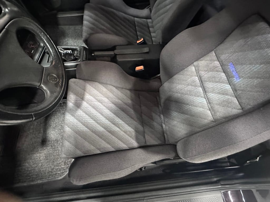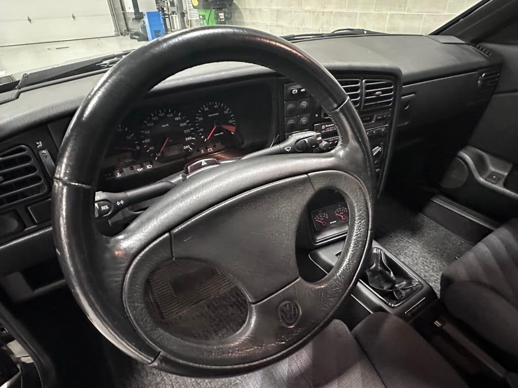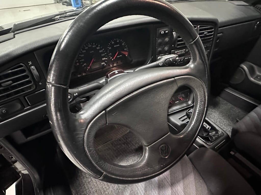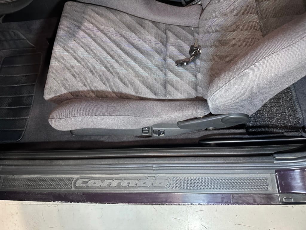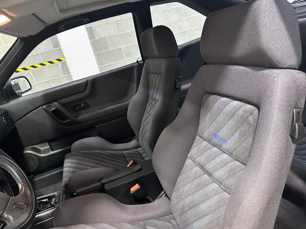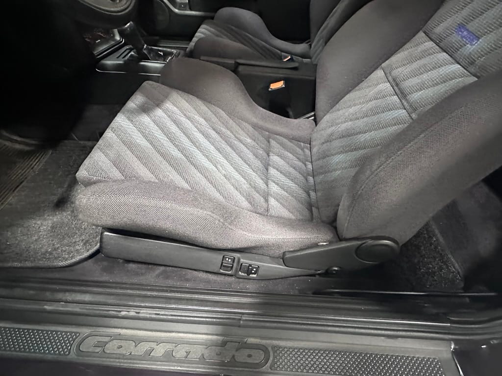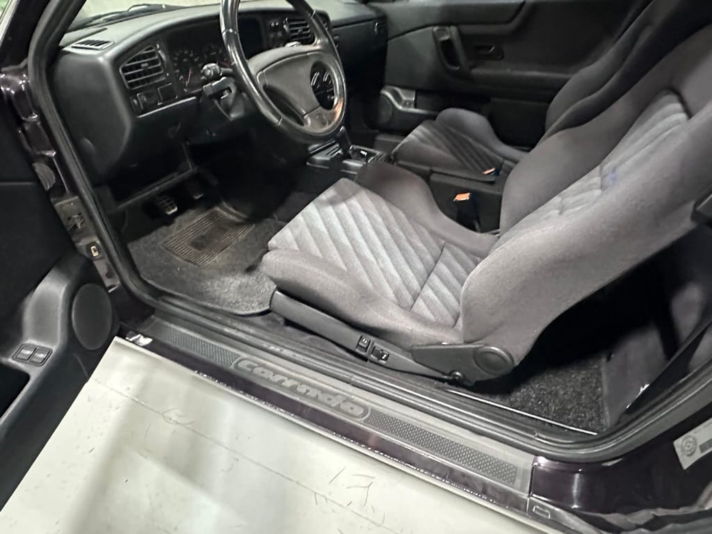 The Recaro sports seats are in excellent condition, with an almost undetectable amount of bolster wear. Carpets, headliner, dash and center console are in excellent condition. 'Corrado' carpet floor mats are new. The vinyl on the passenger side door cap has shrunk revealing the fiber from the door card, the passenger electric window is inoperative.