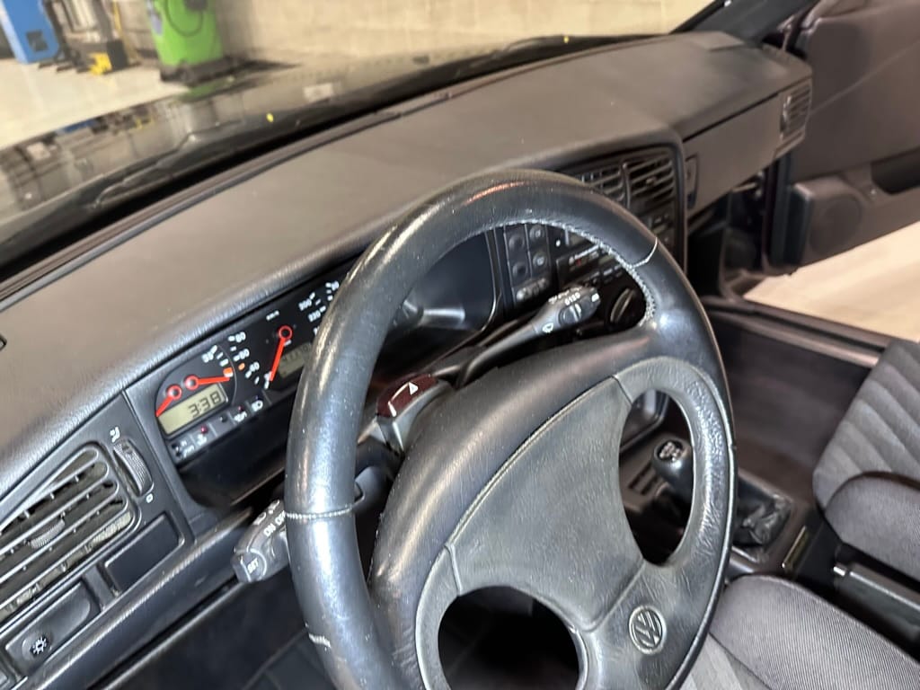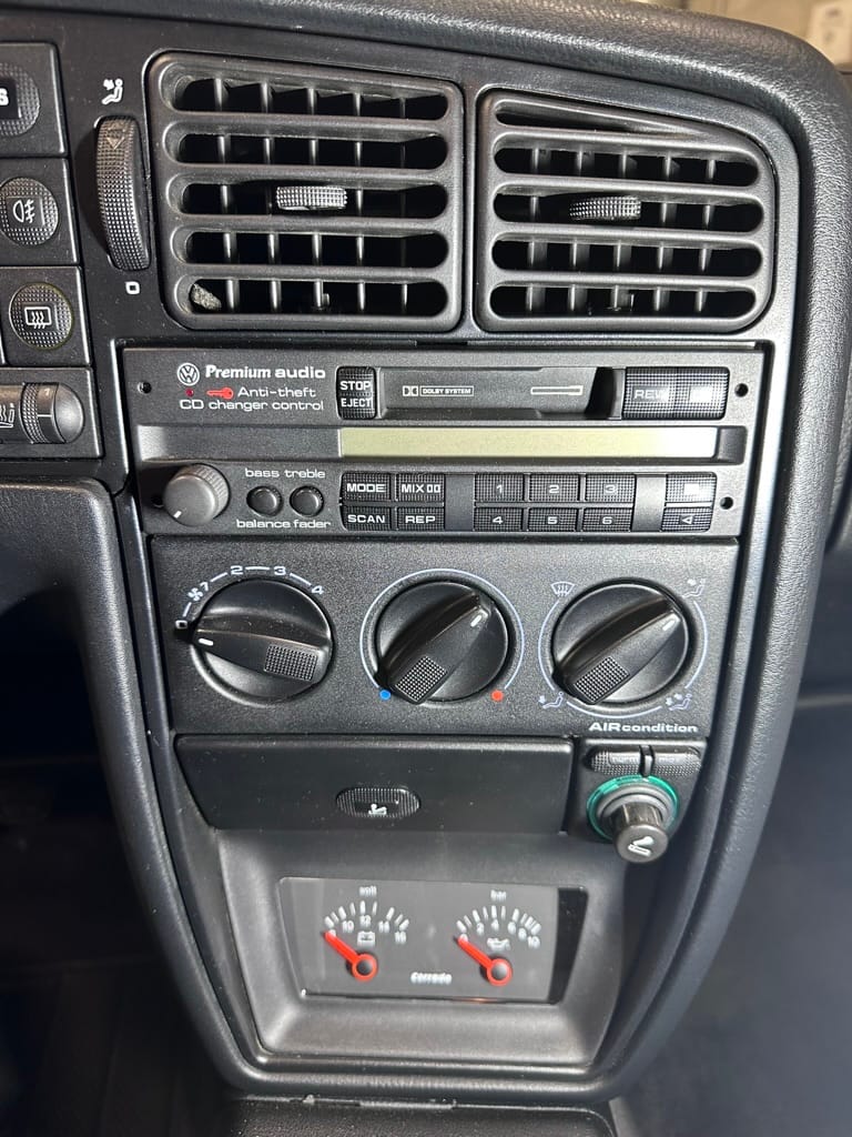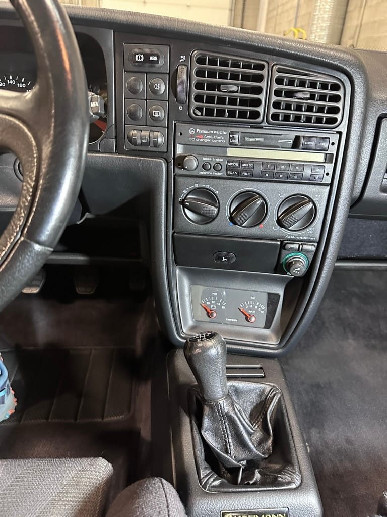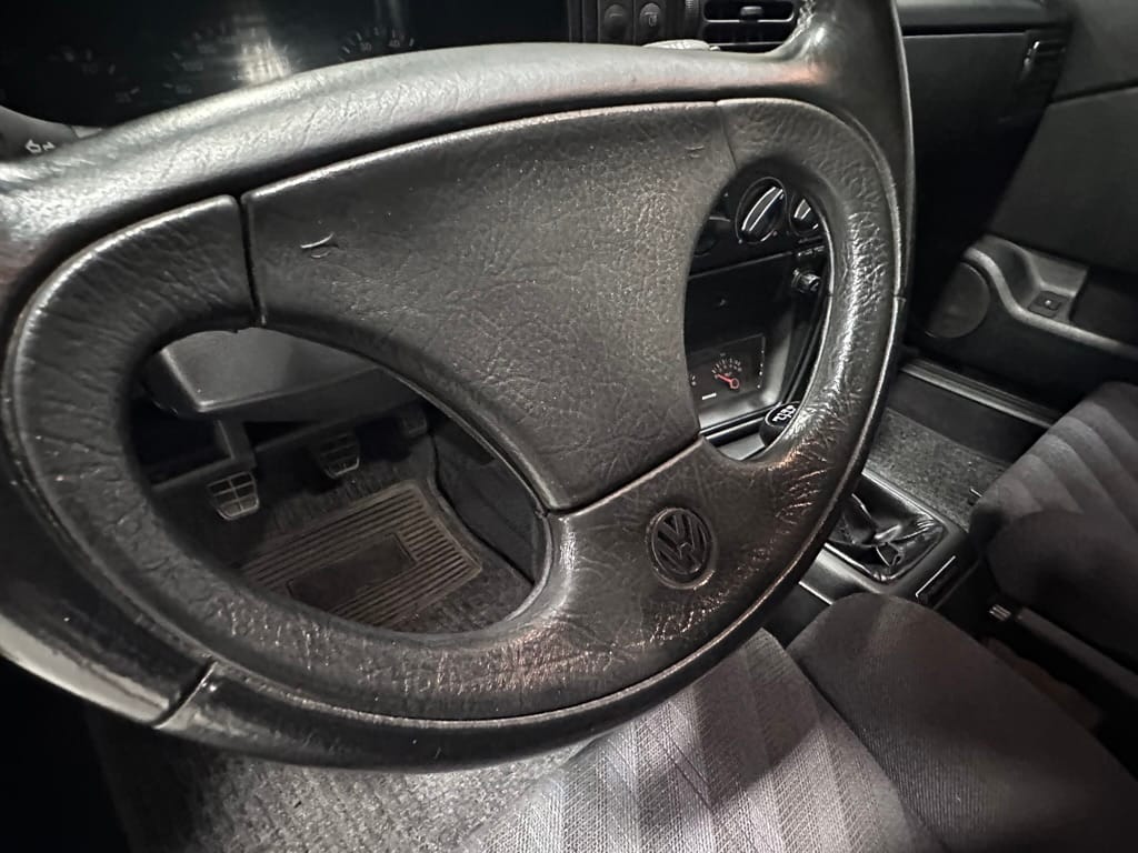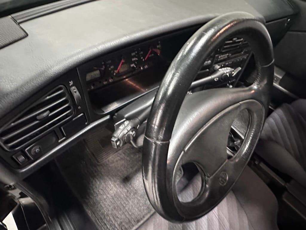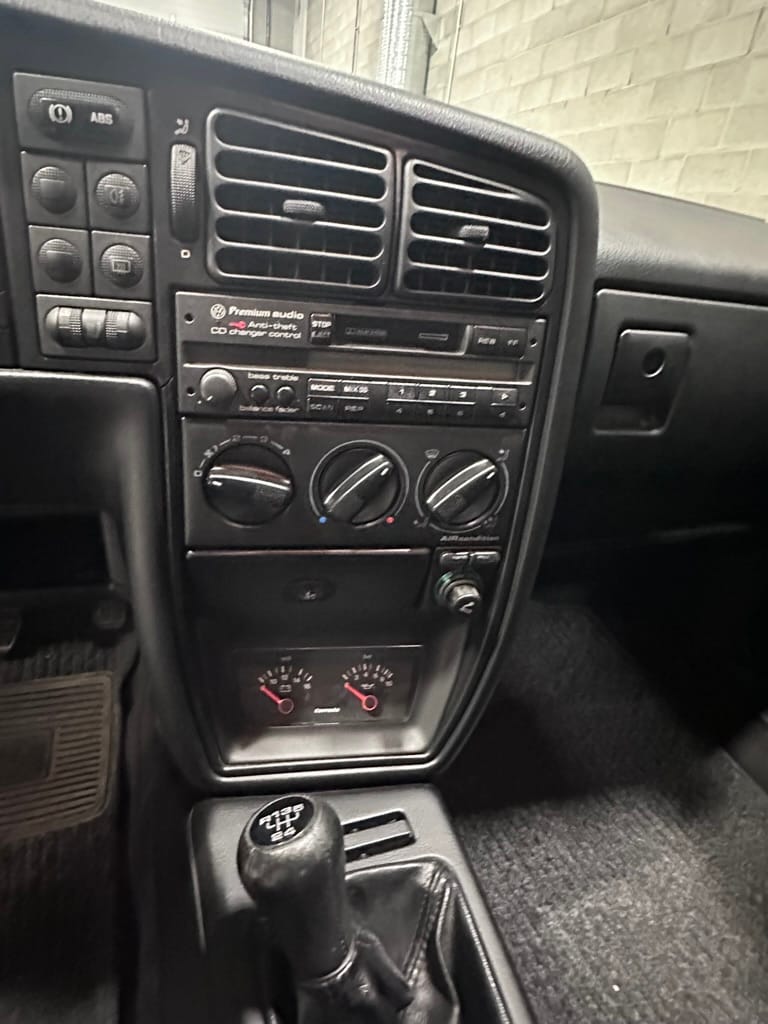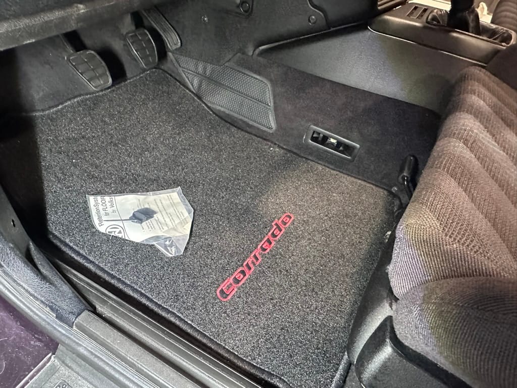 The Recaro sports seats are in excellent condition, with an almost undetectable amount of bolster wear. Carpets, headliner, dash and center console are in excellent condition. 'Corrado' carpet floor mats are new. The vinyl on the passenger side door cap has shrunk revealing the fiber from the door card, the passenger electric window is inoperative.