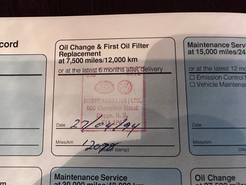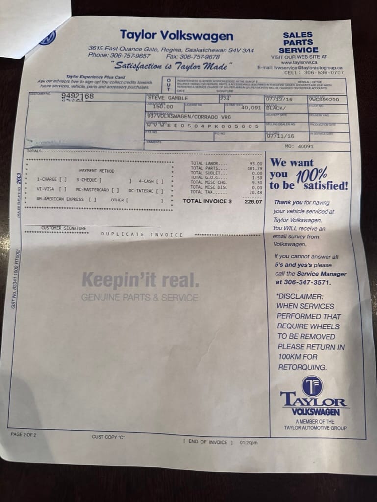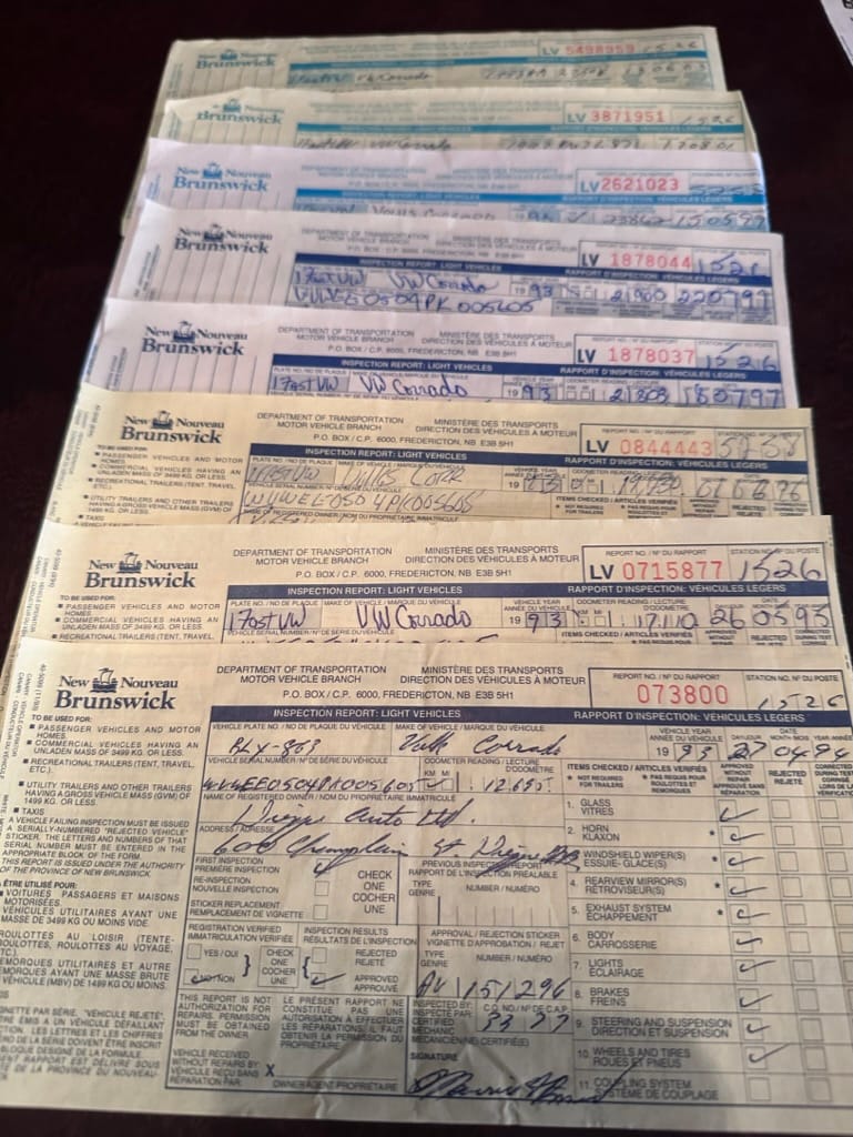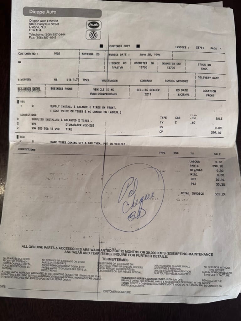 This 1993 Corrado VR6 (SLC) was sold new from Dieppe Auto, a VW franchised dealer in Dieppe NB, Canada, going into service first as a company owned demo on June 22, 1993. A NB registration document show the vehicle owned by Dieppe Auto in April 1994 with 12,695km. The NB registration record indicates its first owner, RW in NB, on June 26, 1995 with 17,110km showing on the odometer.