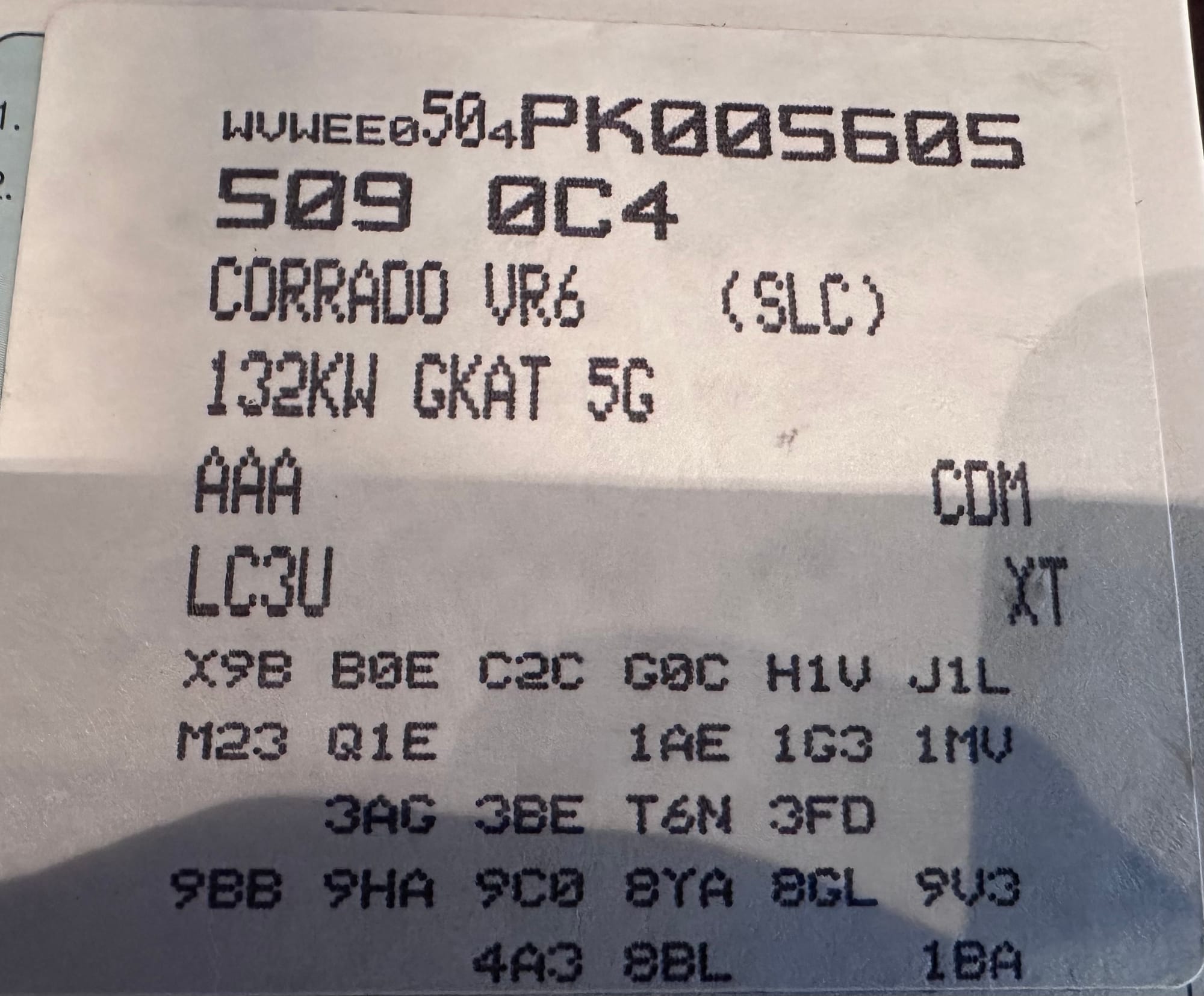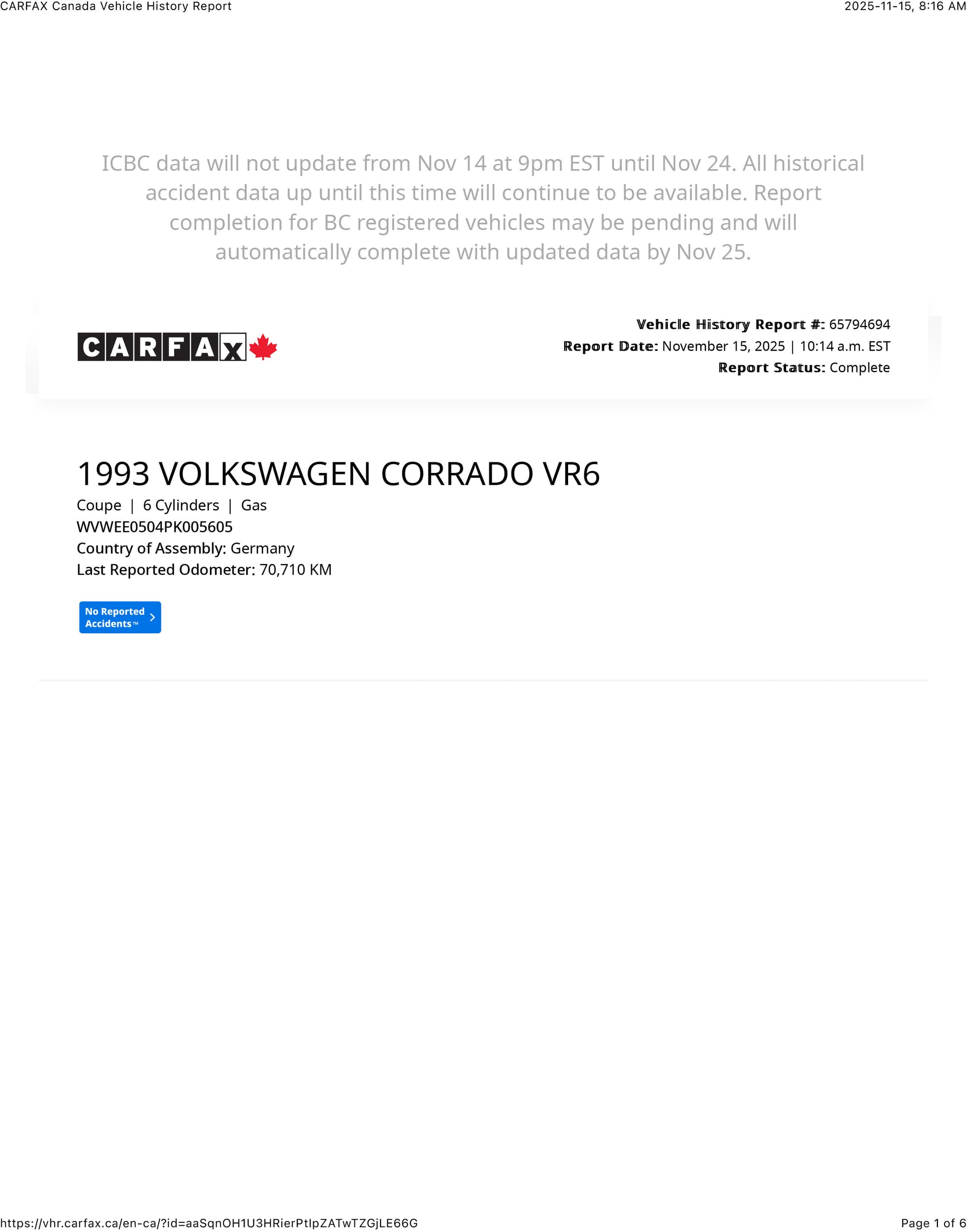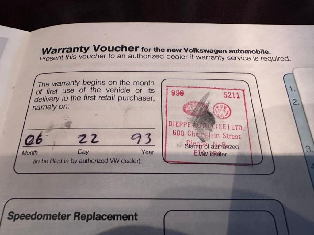 This 1993 Corrado VR6 (SLC) was sold new from Dieppe Auto, a VW franchised dealer in Dieppe NB, Canada, going into service first as a company owned demo on June 22, 1993. A NB registration document show the vehicle owned by Dieppe Auto in April 1994 with 12,695km. The NB registration record indicates its first owner, RW in NB, on June 26, 1995 with 17,110km showing on the odometer.