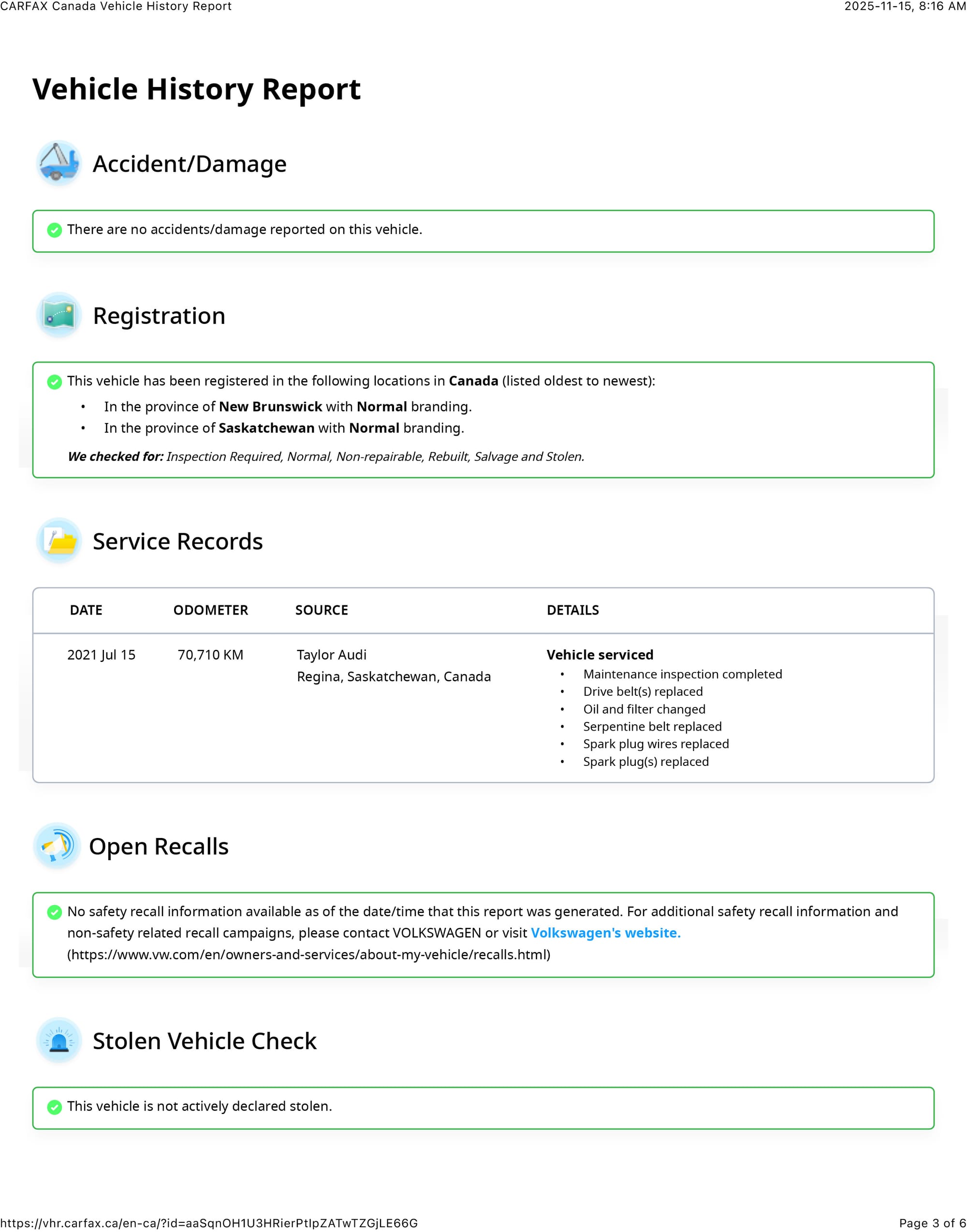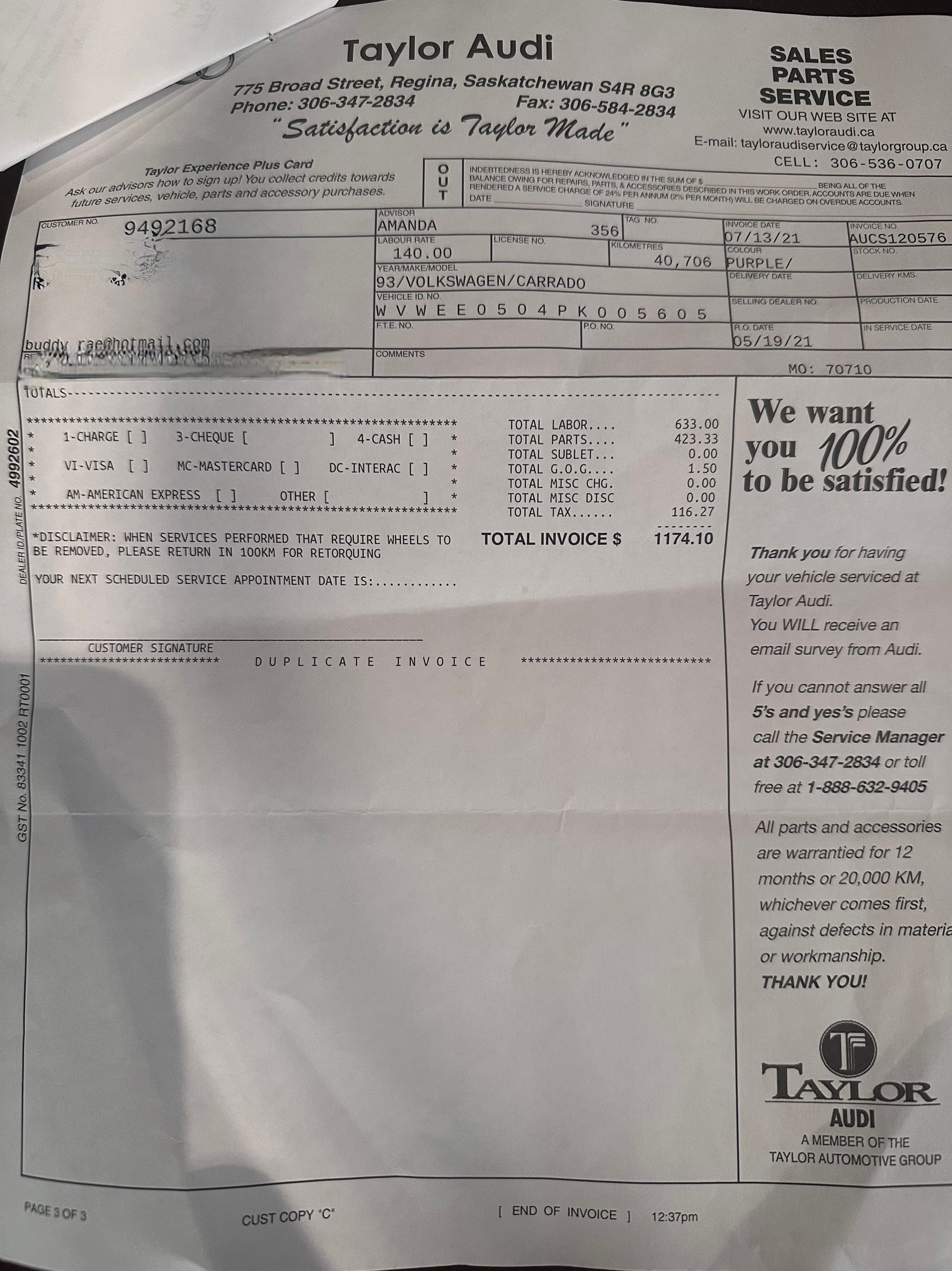 note* The CARFAX shows a service entry on July 15, 2021 the timing matching the invoice from Taylor Volkswagen, dated a few days earlier. It lists the mileage at 70,710 - clearly a clerical error. 40,706 should have been entered.