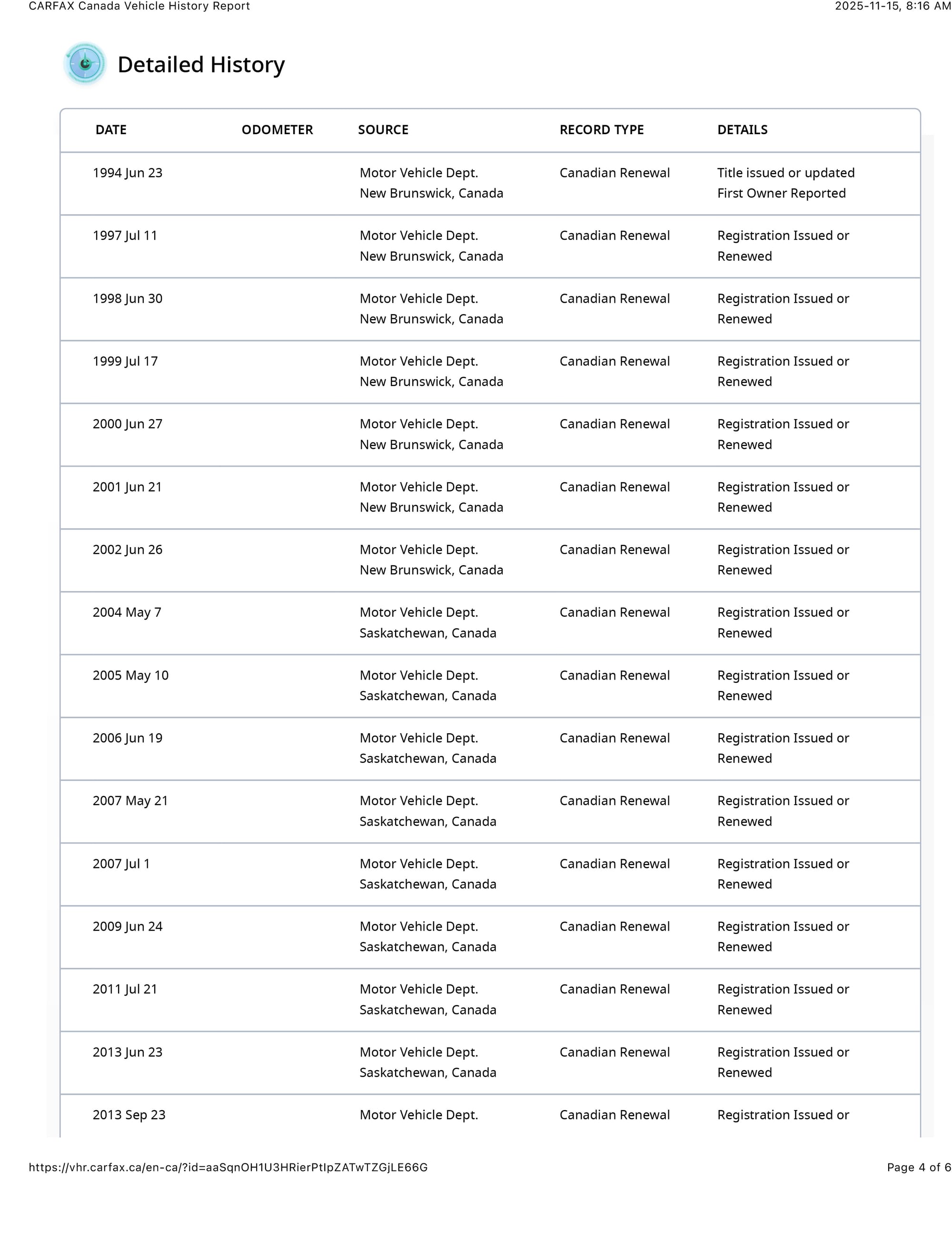 Subsequent registation records to DR in 1996 (19,430km), 1997 (21,803km), 1999 (21,90okm), 1999 (23,862km), 2001 (26,872km), 2003 (27,506km).