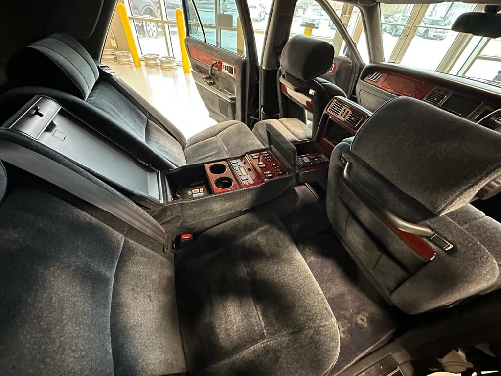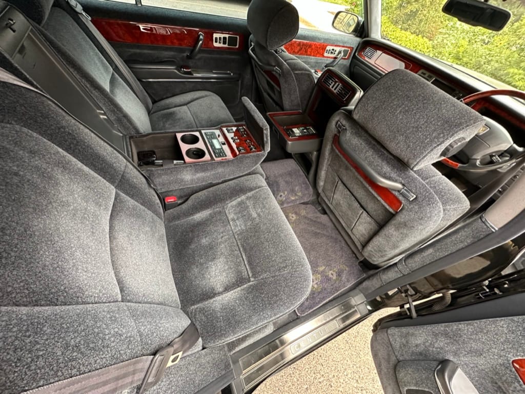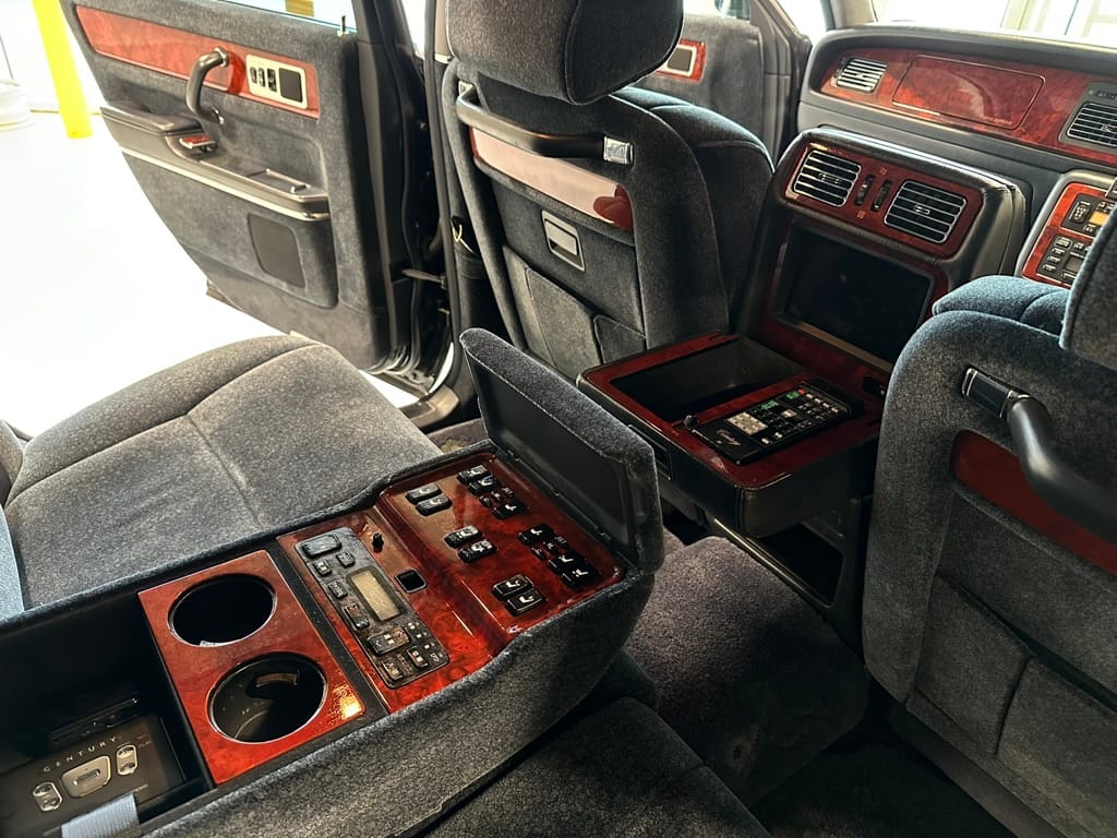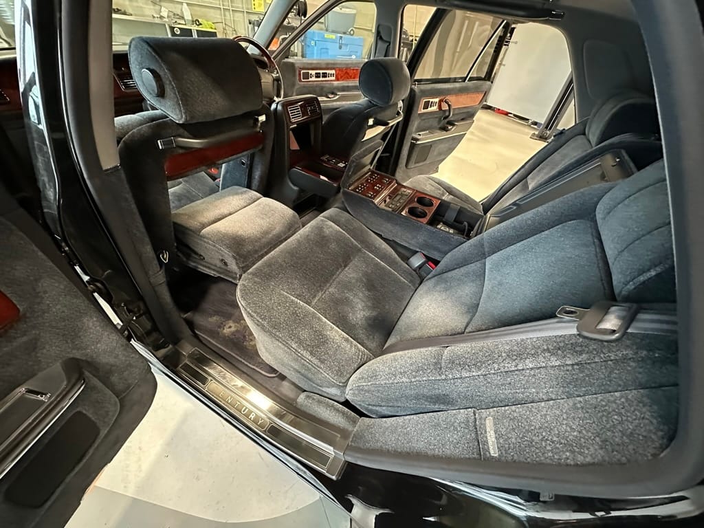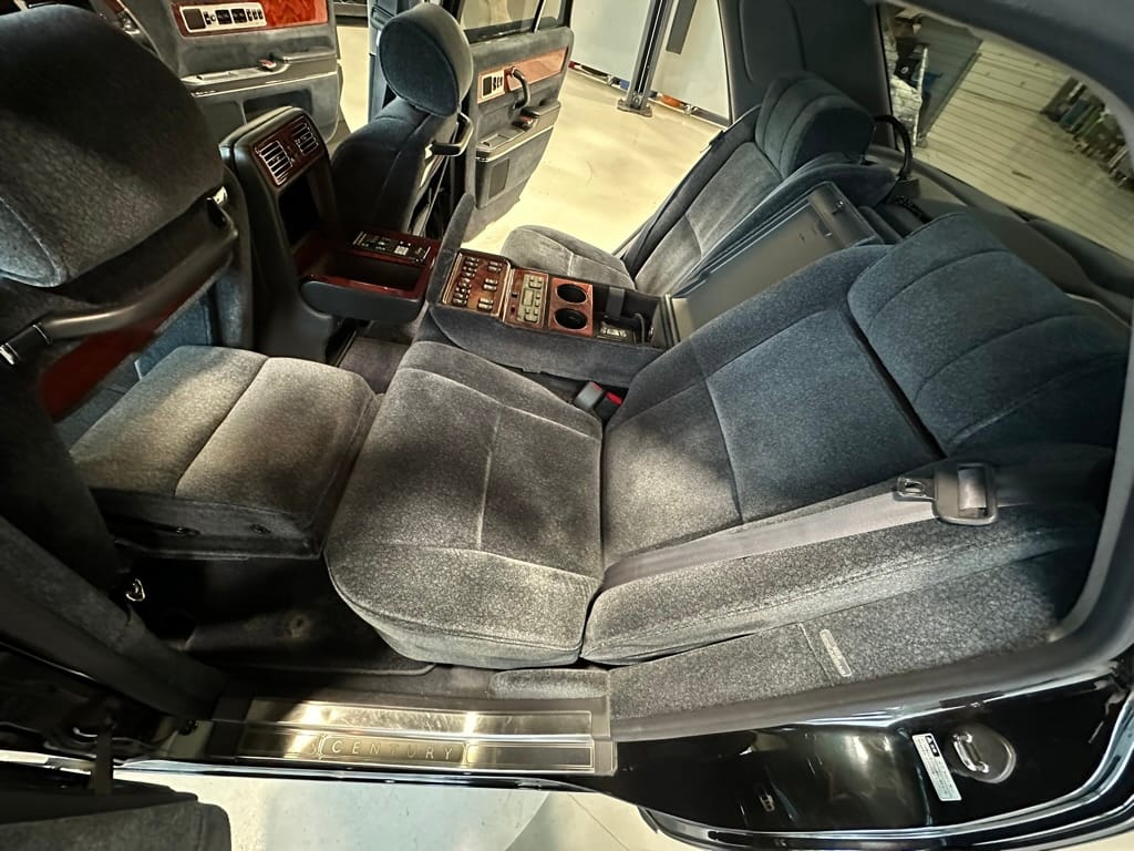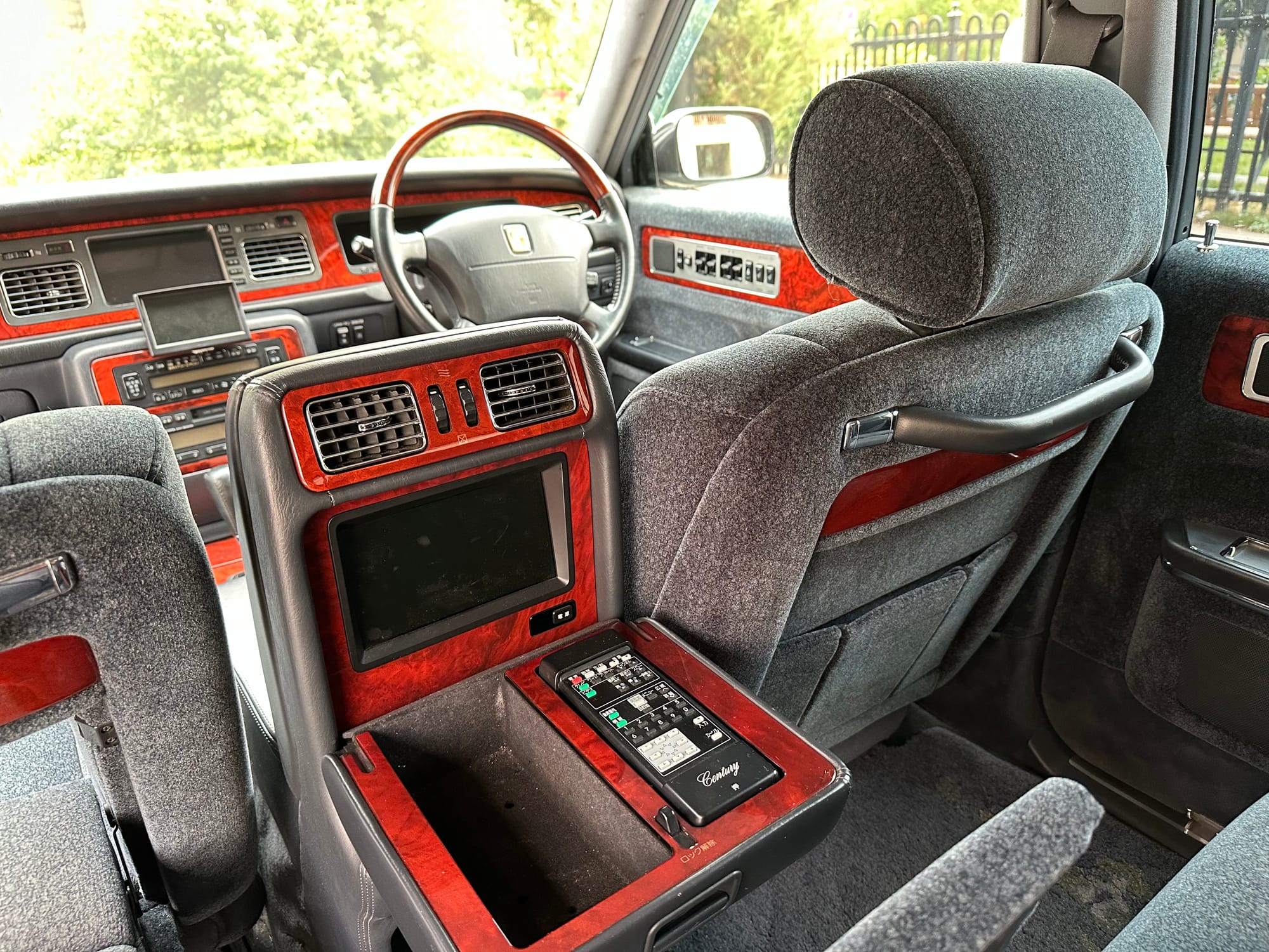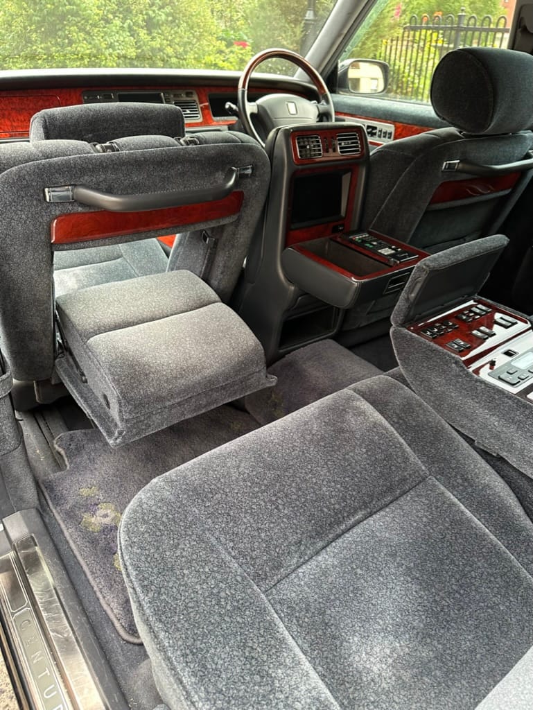 The wool jacquard interior remains in beautiful condition, and all electrical accesories function correctly. It has an aftermarket rear view camera, which is the only modification from stock. The remote control for the 'Dual EMV' screens and the Century branded Sony Walkman are present. There are no rips, tears, burns, stains or scratches on any of the interior trim pieces.
