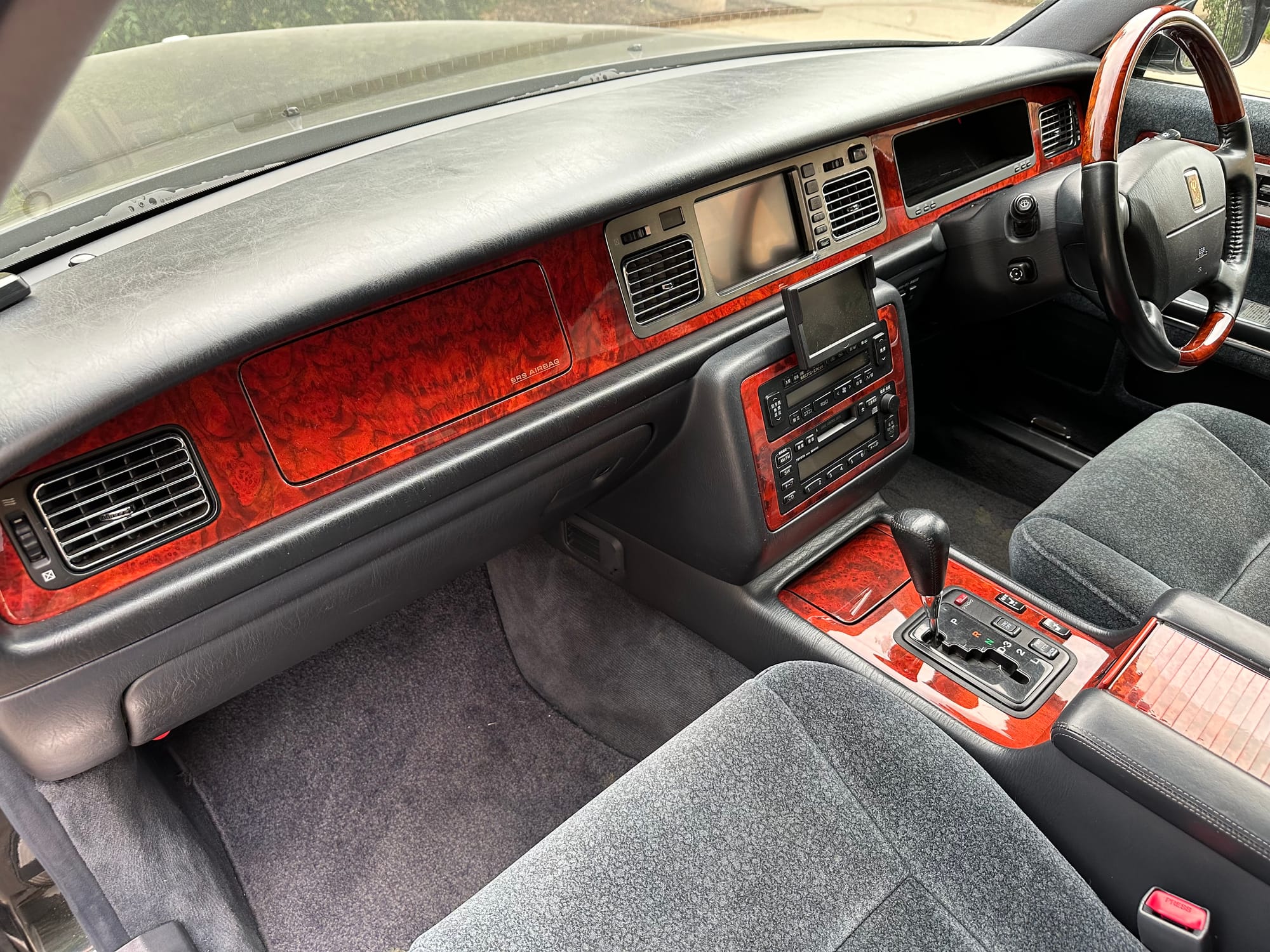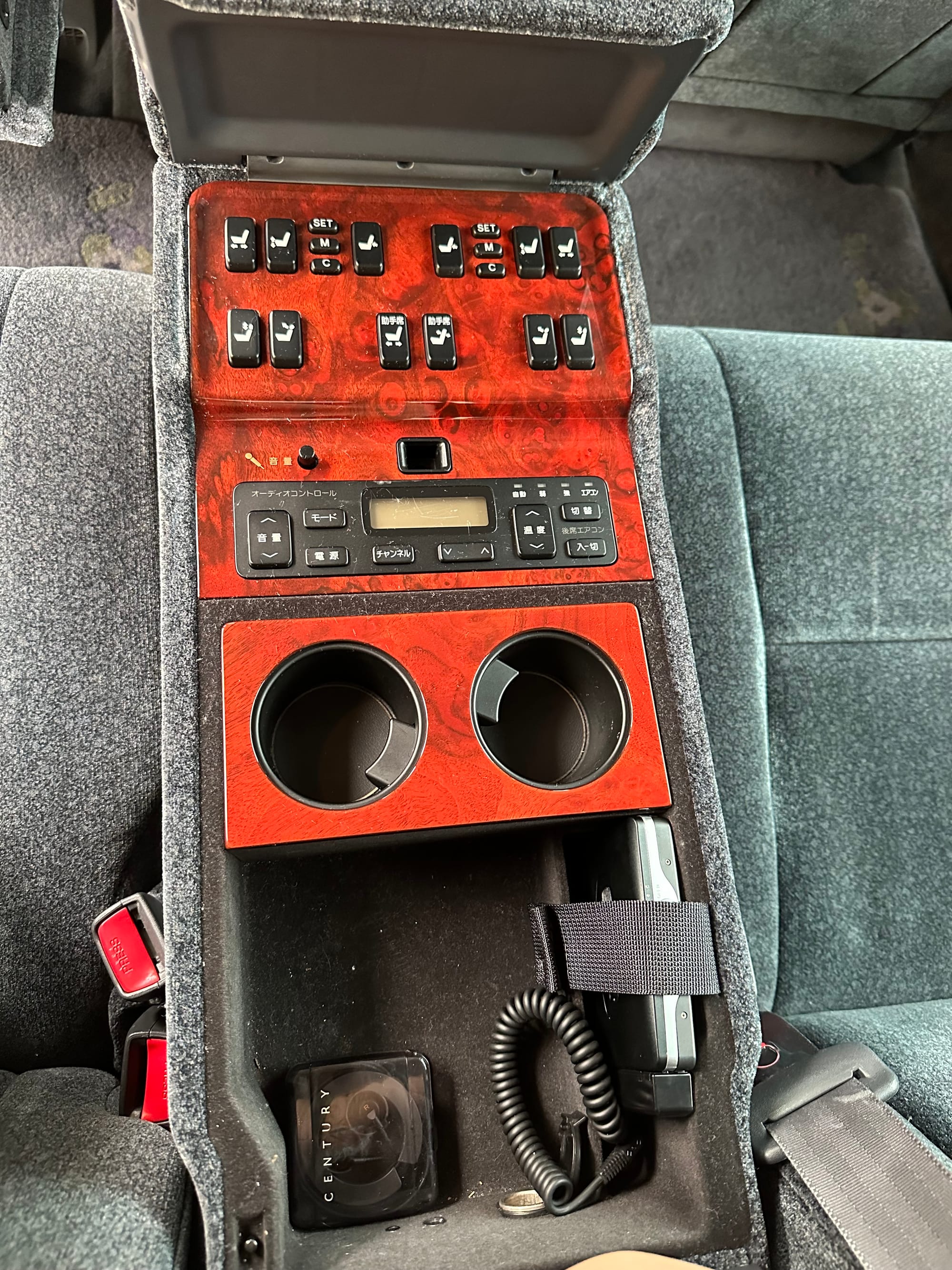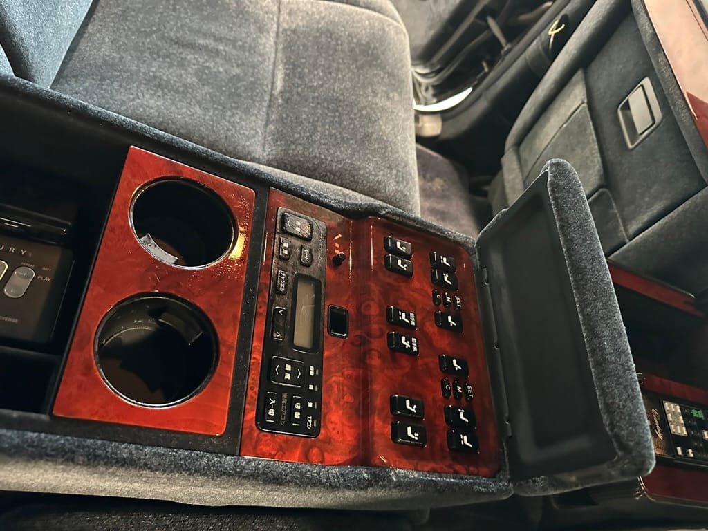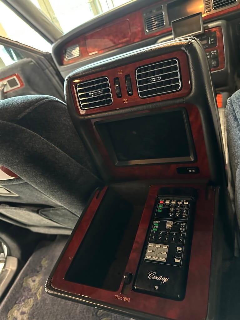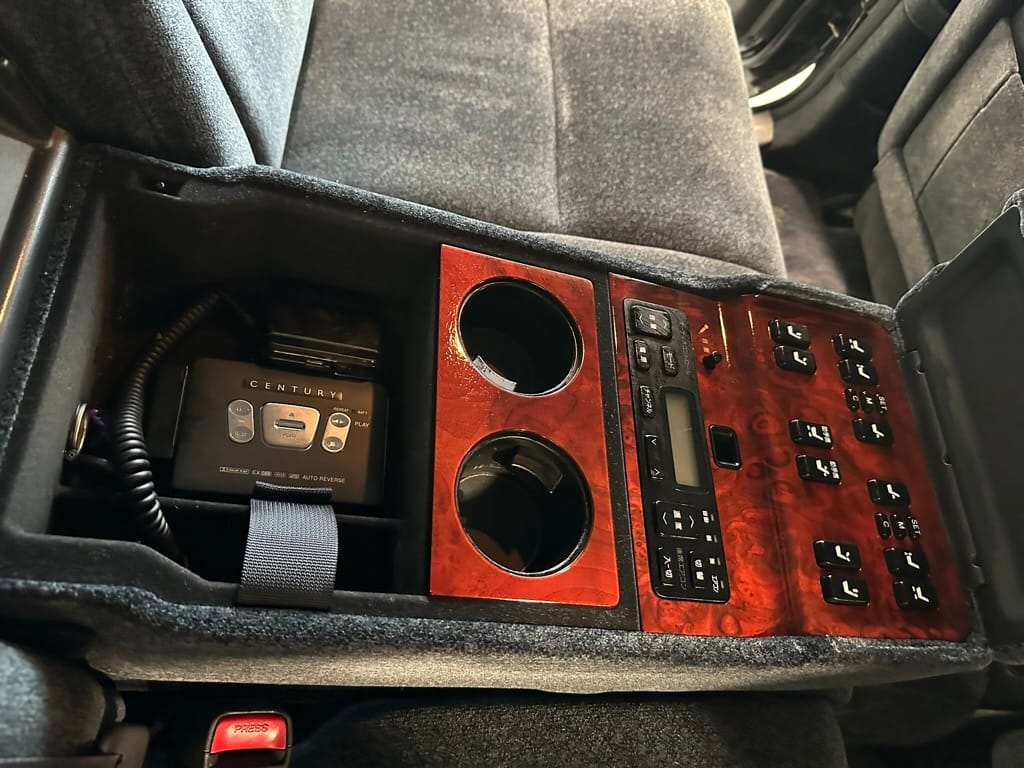 There are buttons everywhere. The rear passengers can control the LHS front seat from the rear central panel. Also there are controls for the rear auxilliary A/C and climate control. There is a button for a dictaphone and a Century branded Sony Walkman lives in the center console. A remote control operates one of the 'Dual EMV' screens which can display audio or navigation, and also play the optional VHS machine. The 6-CD cartridge lives in the front glove box, in front of the 'assistant's' seat, which was designed to that the occupant could easily give attention to the rear occupants. There is a sophisticated air filtration system with a electronic negative ion filter.
