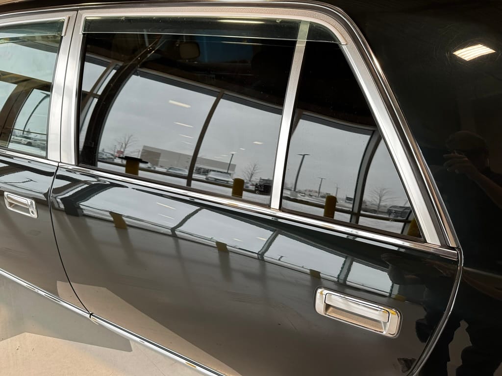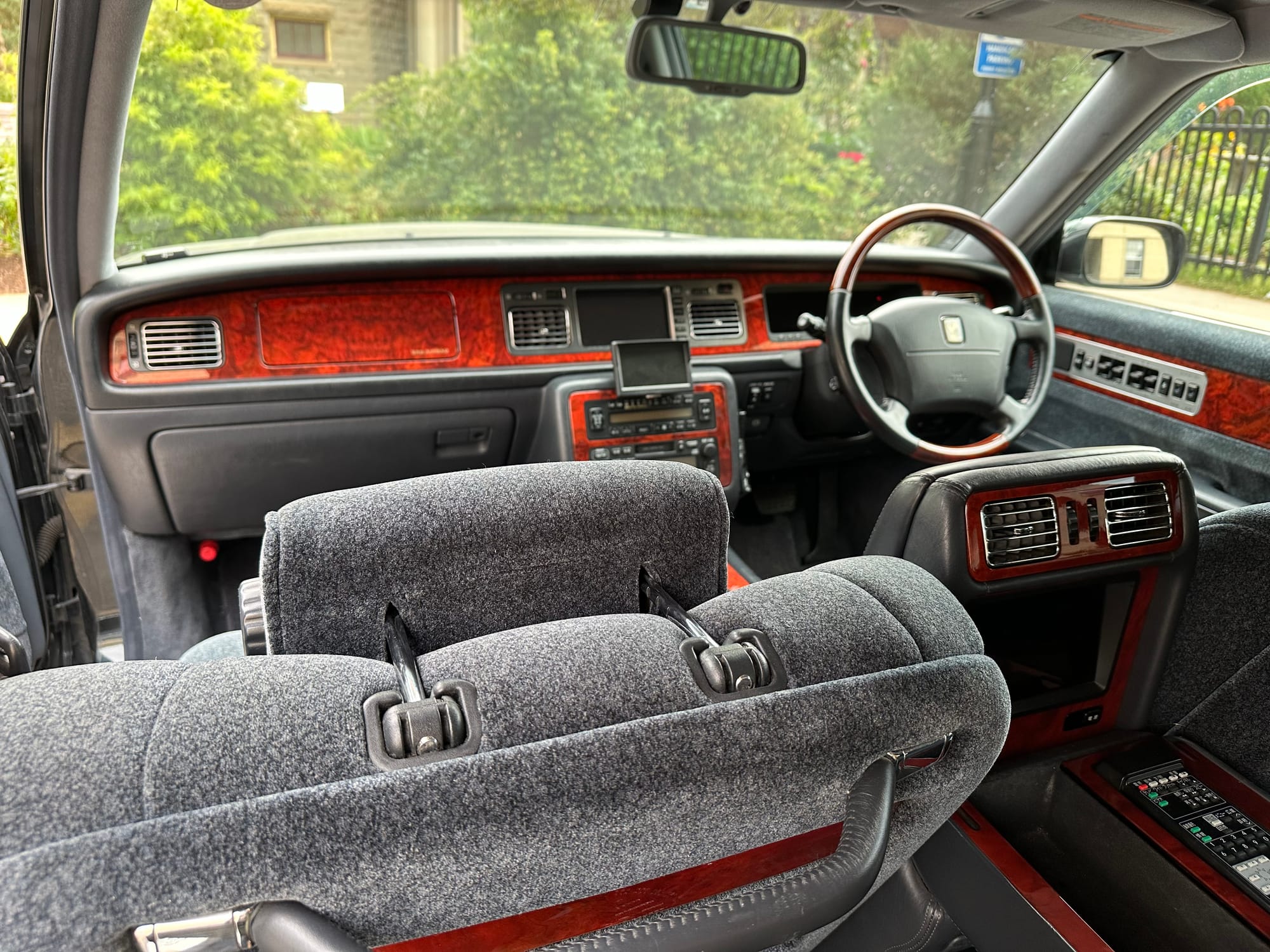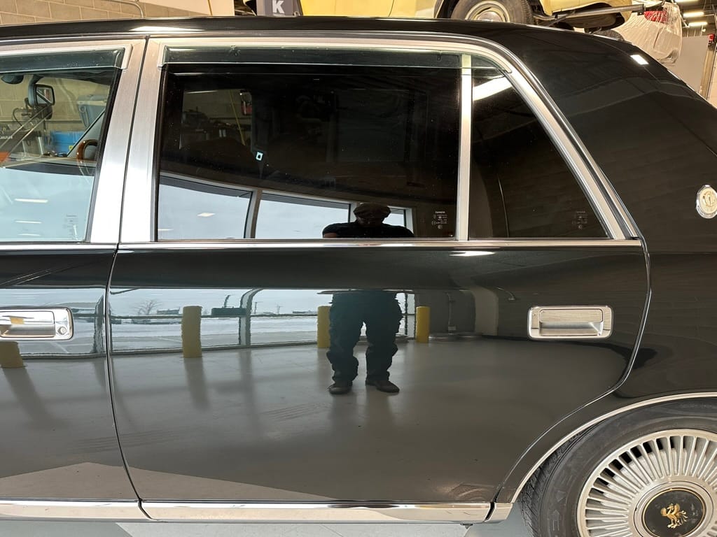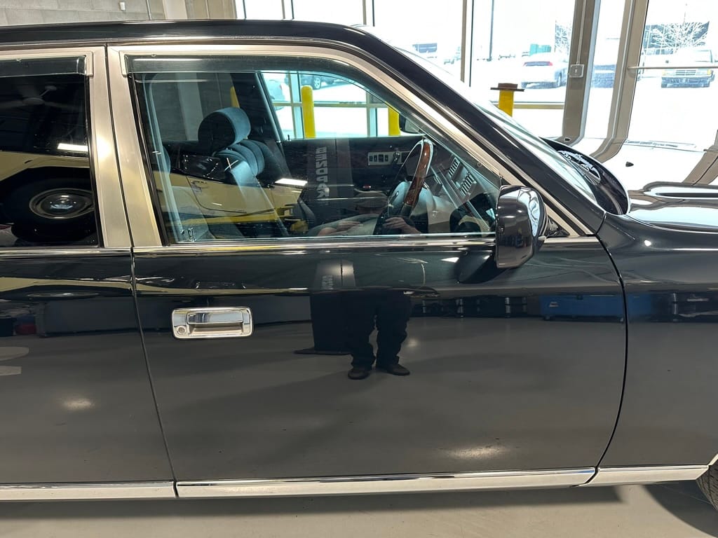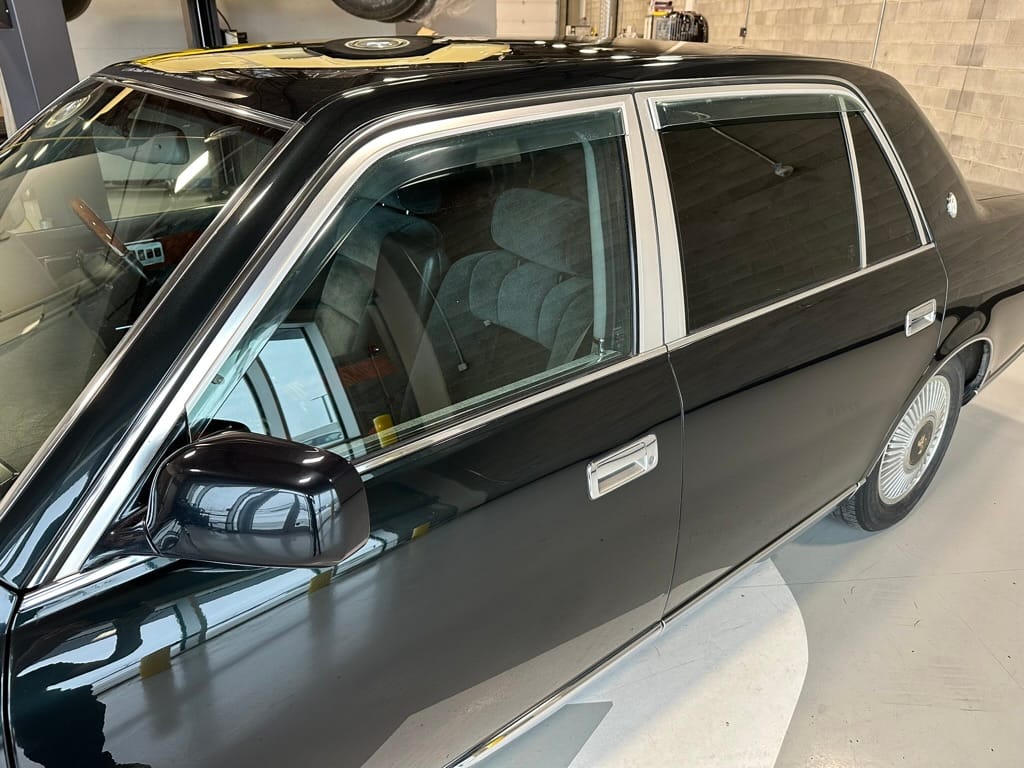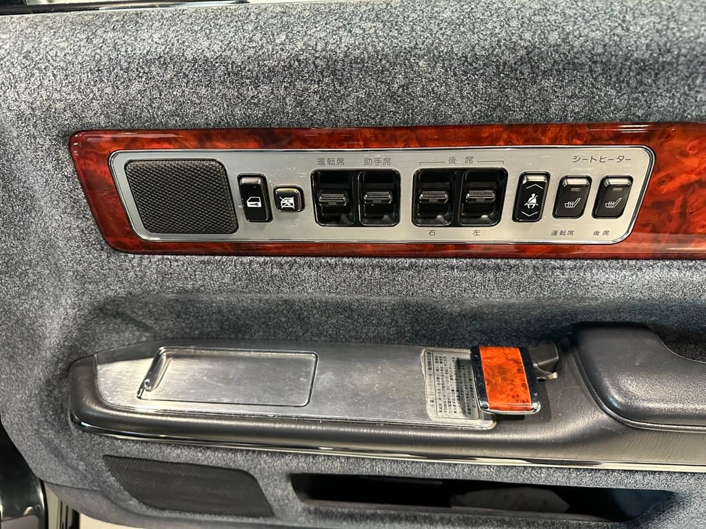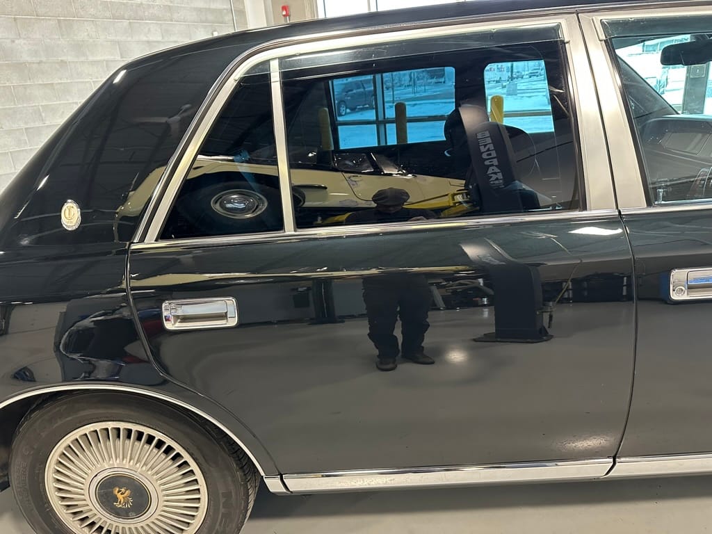 The window frames are polished aluminum and designed to look like a picture frame, to make the rear occupants look dignified. The sills in the rear are stepped down offering a flat floor, making it easy for ladies in Kimonos to enter and exit. The C pillar is broad and polished to a mirror shine, so it can double as a mirror so the occupants can adjust their ties or make up before facing the crowds. There are generous grab handles on the backs of the seats and above the door to make ingress and egress as dignified as possible.