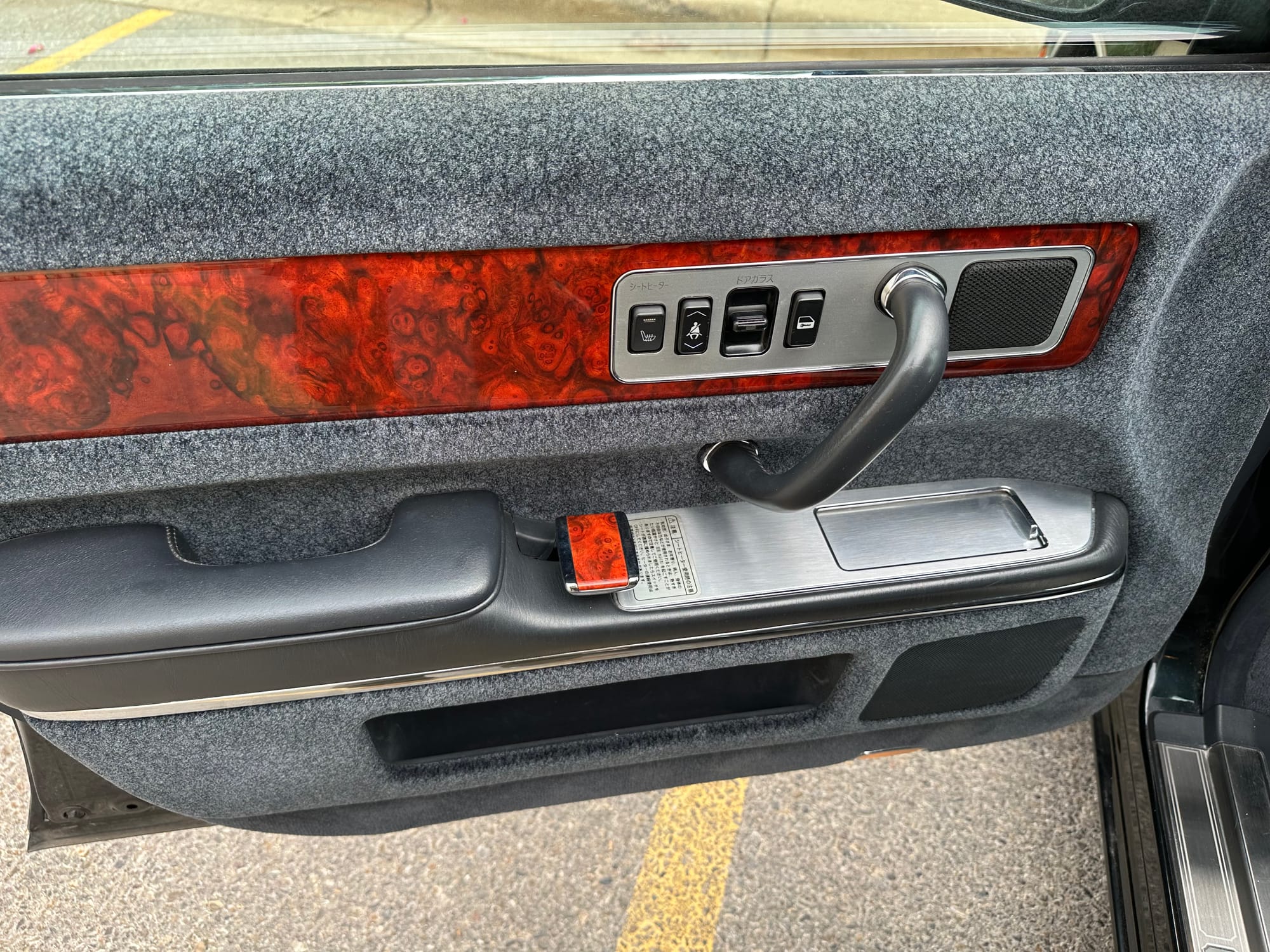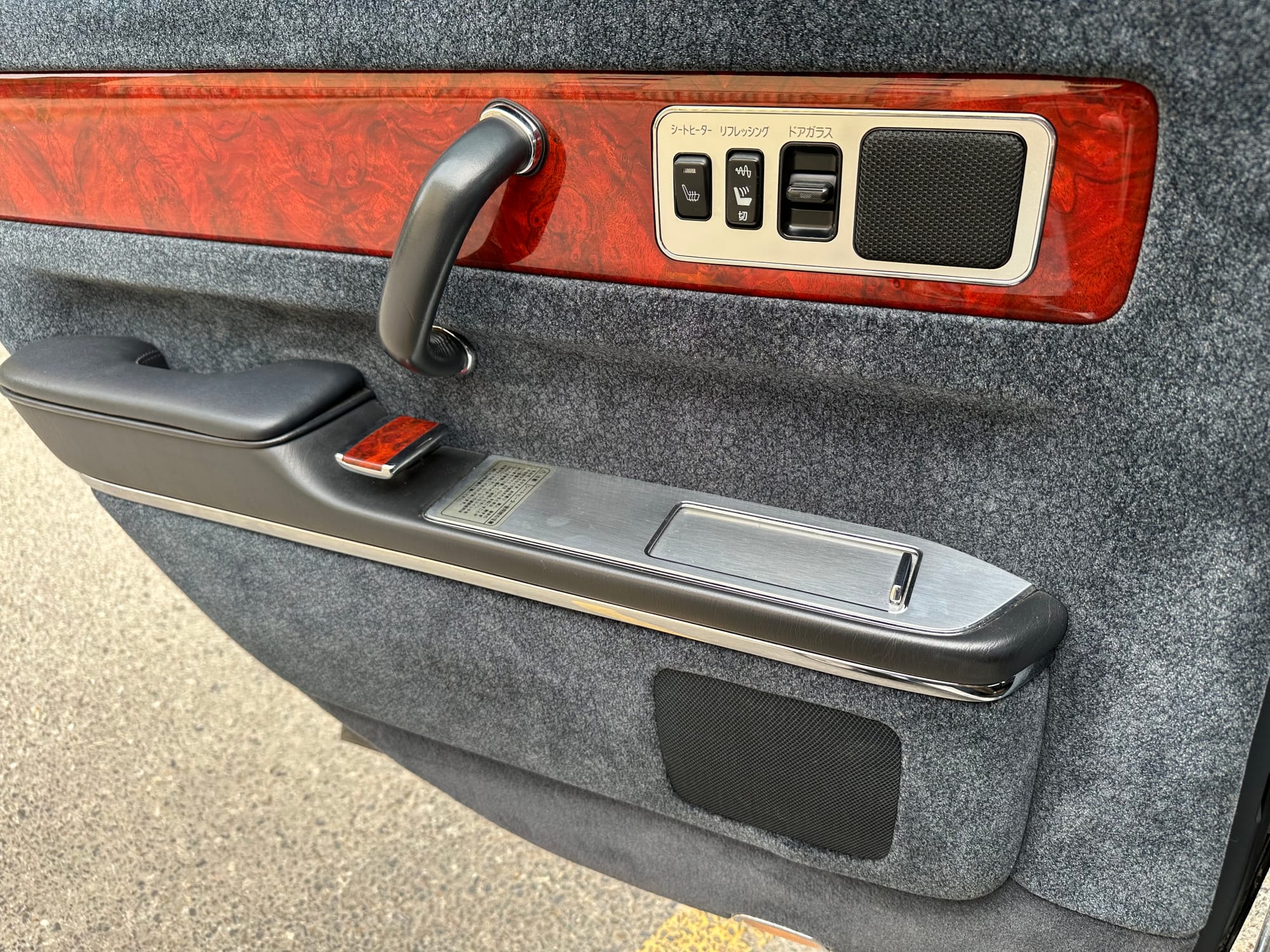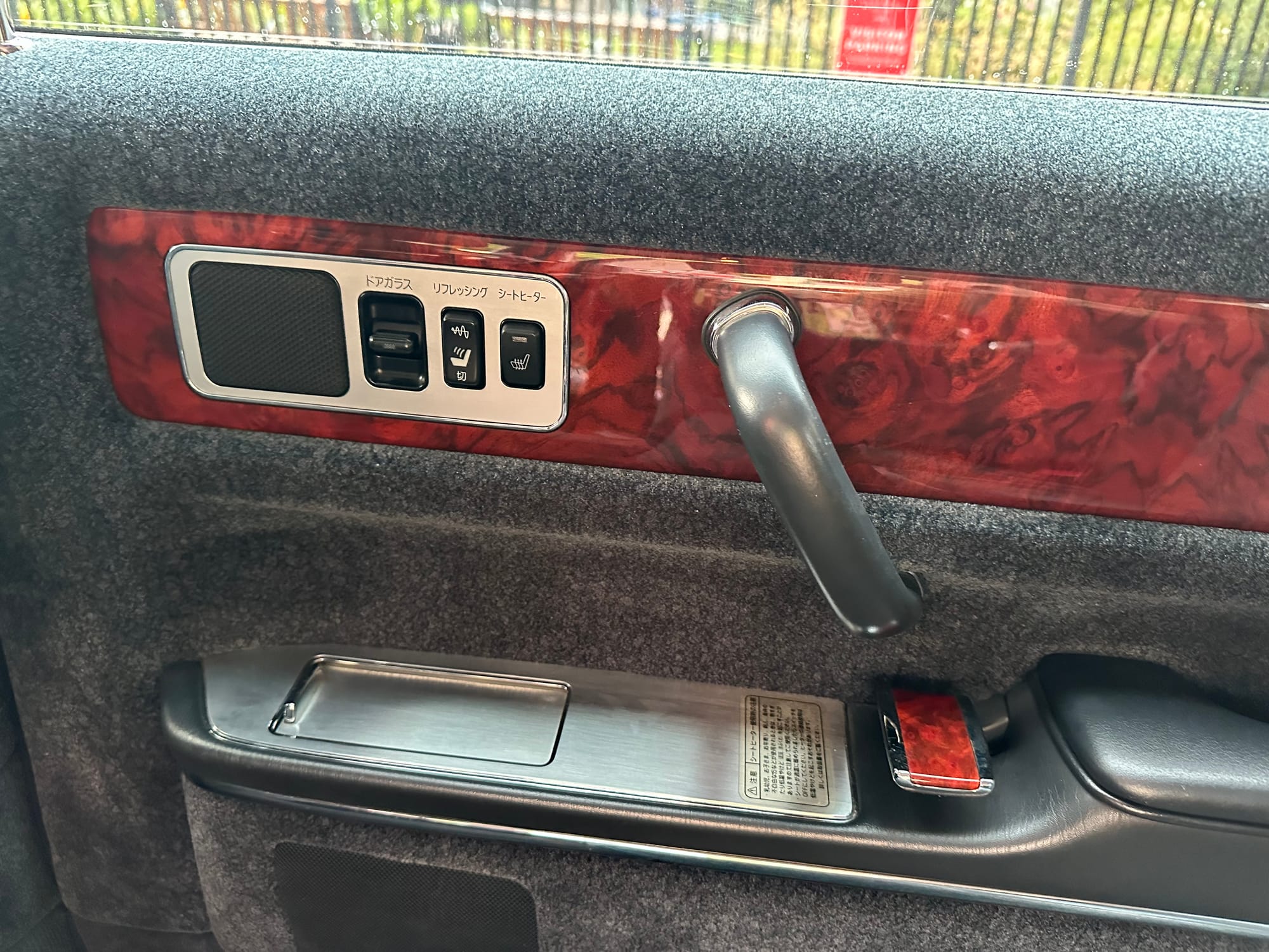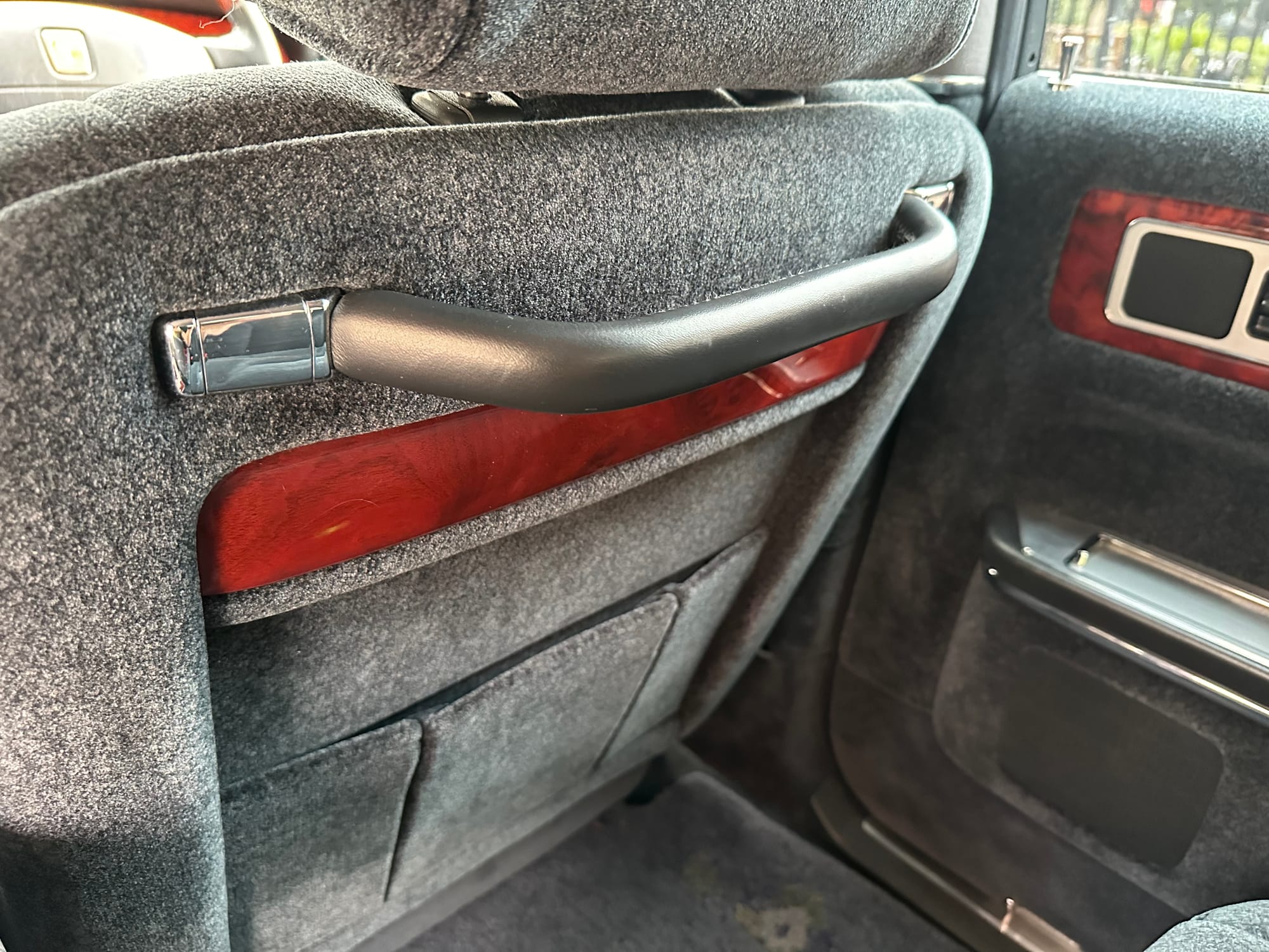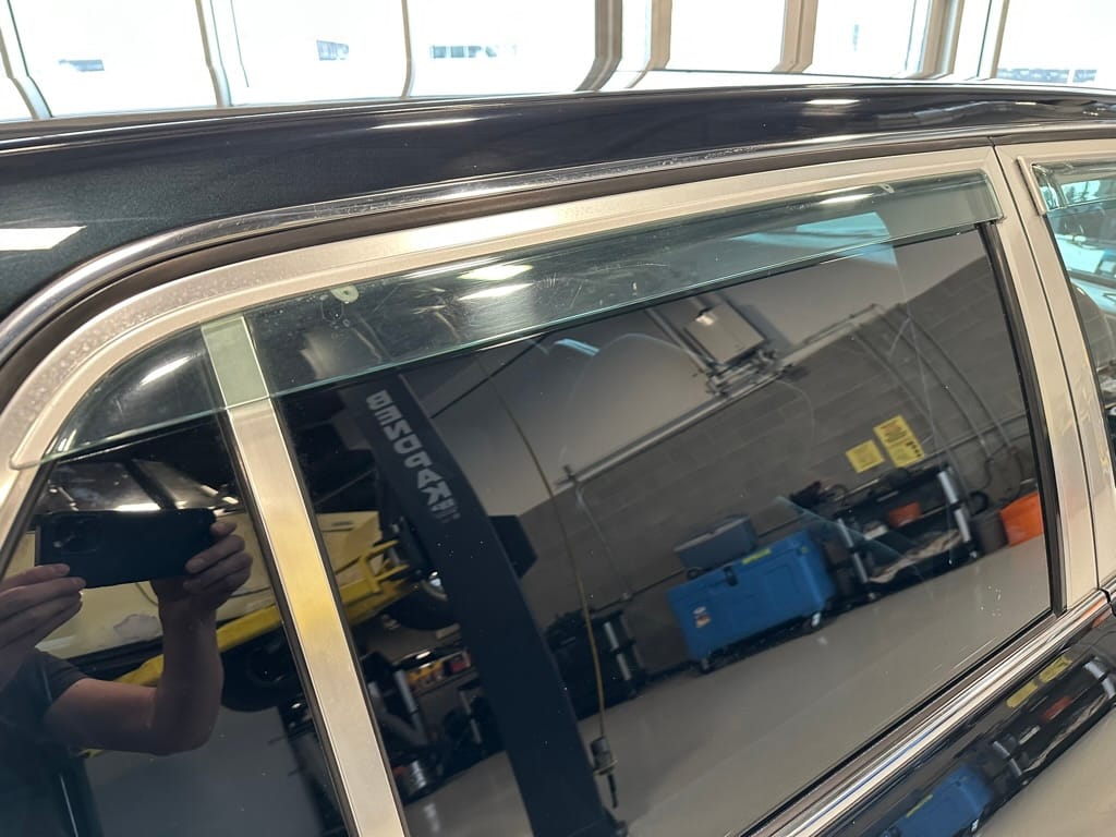 The window frames are polished aluminum and designed to look like a picture frame, to make the rear occupants look dignified. The sills in the rear are stepped down offering a flat floor, making it easy for ladies in Kimonos to enter and exit. The C pillar is broad and polished to a mirror shine, so it can double as a mirror so the occupants can adjust their ties or make up before facing the crowds. There are generous grab handles on the backs of the seats and above the door to make ingress and egress as dignified as possible.