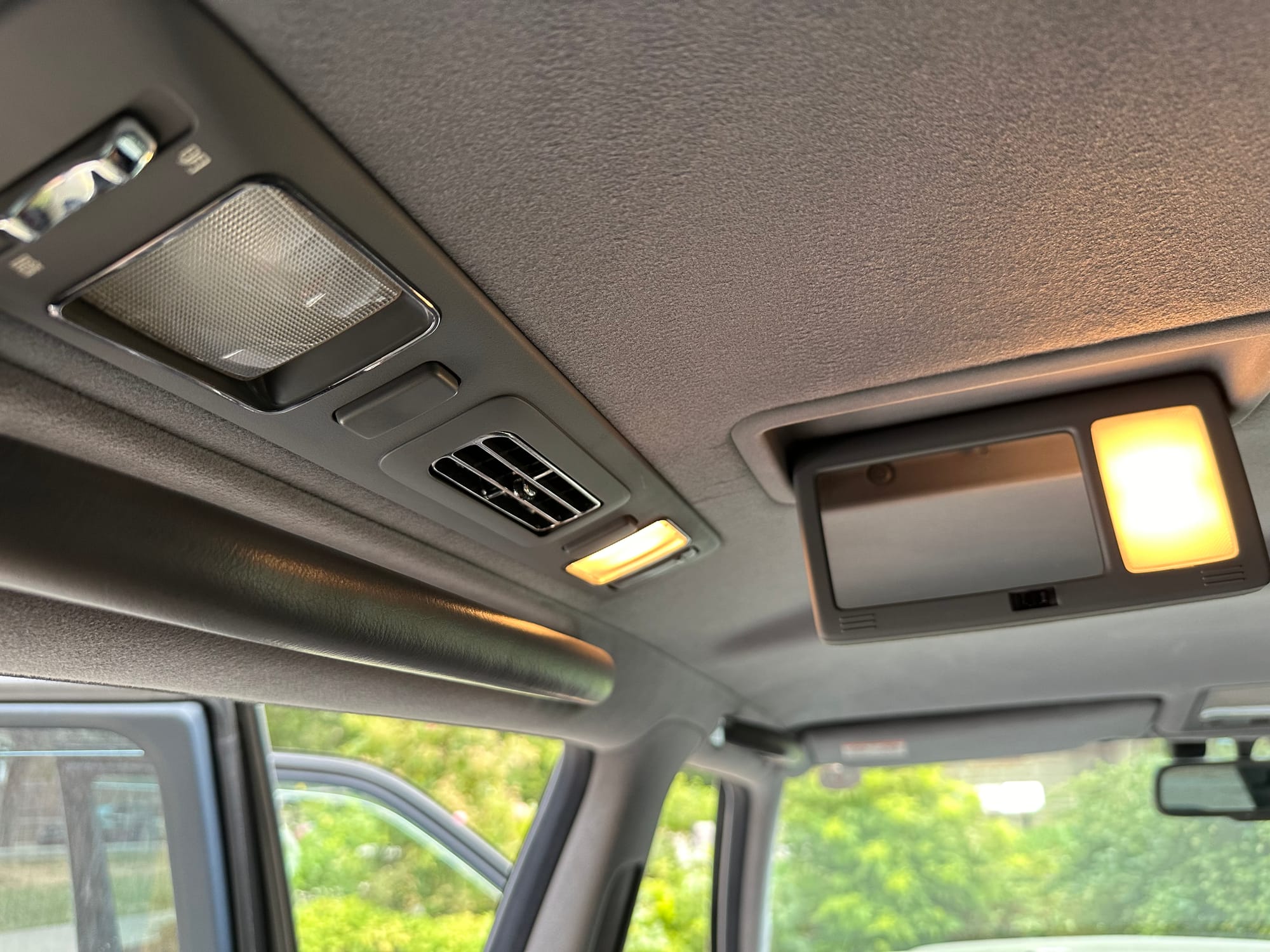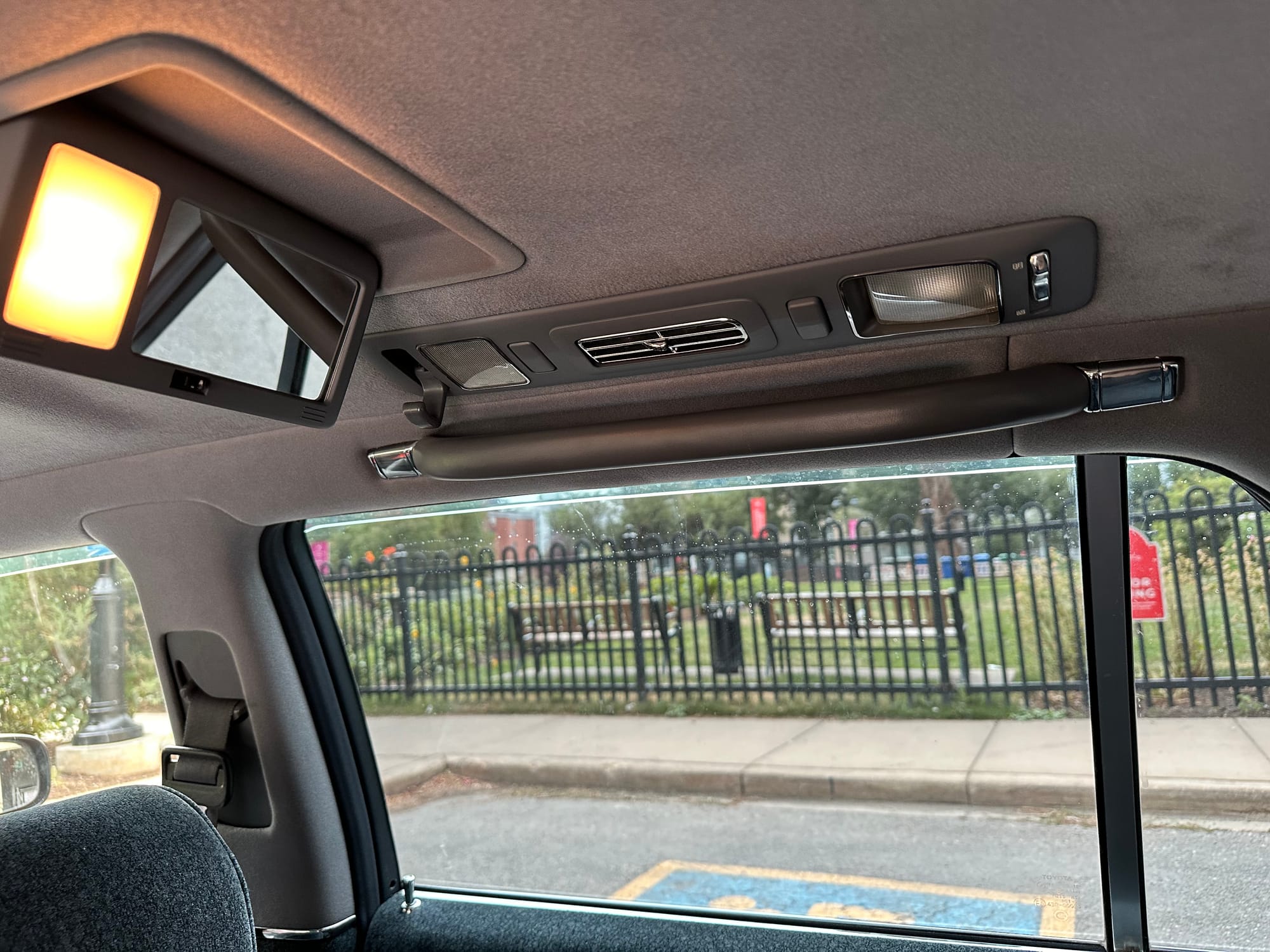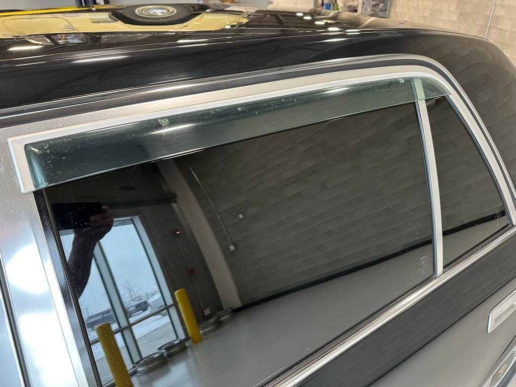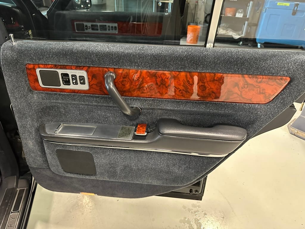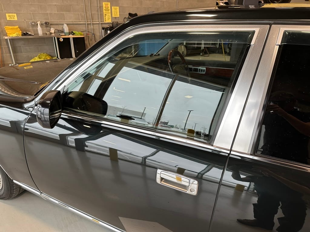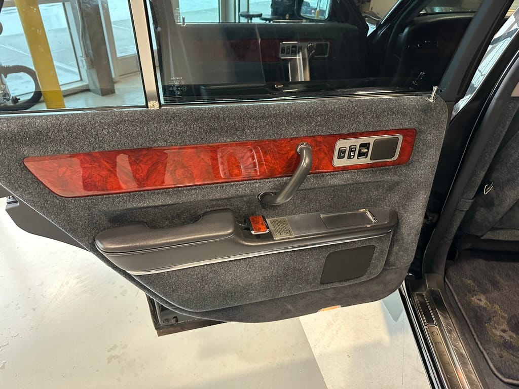 The window frames are polished aluminum and designed to look like a picture frame, to make the rear occupants look dignified. The sills in the rear are stepped down offering a flat floor, making it easy for ladies in Kimonos to enter and exit. The C pillar is broad and polished to a mirror shine, so it can double as a mirror so the occupants can adjust their ties or make up before facing the crowds. There are generous grab handles on the backs of the seats and above the door to make ingress and egress as dignified as possible.