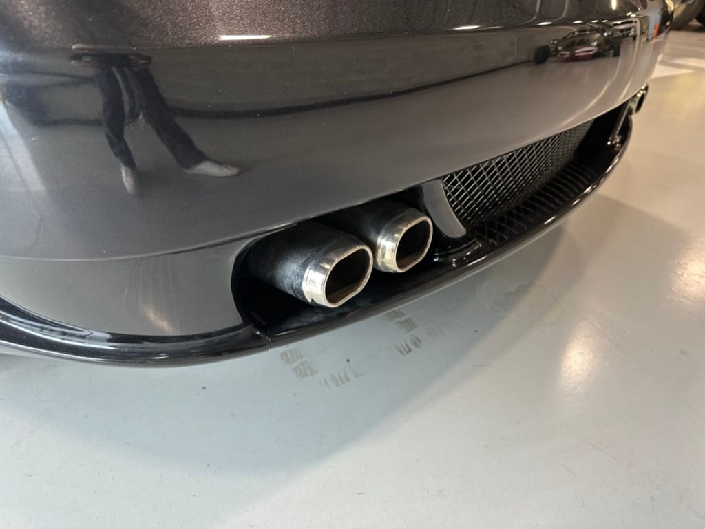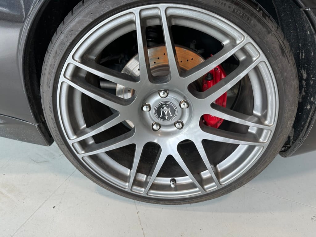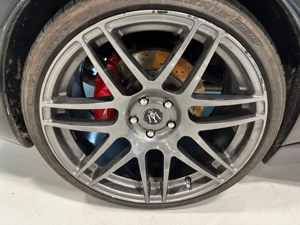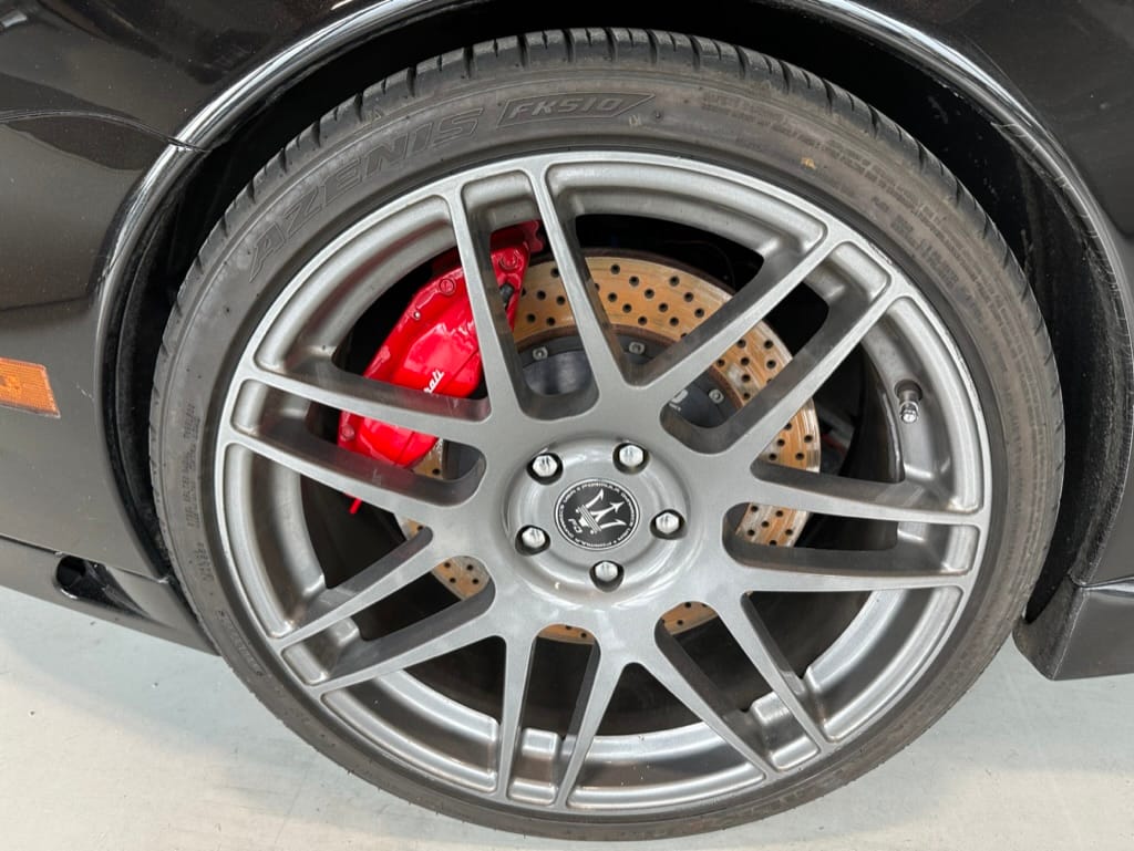The suspension is made up of aluminum double wishbones on each corner with ’Skyhook’ programmed adjustable dampers. Formula Dynamics Wheels are 19” in diameter and wear 235-30-19 and 295-30-19 Genesis tires with more than 50% tread depth remaining. Brakes use 2 piece, radially vented and cross drilled rotors with red dual piston callipers. The rotors show minimal wear. A Larini Exhaust is installed.