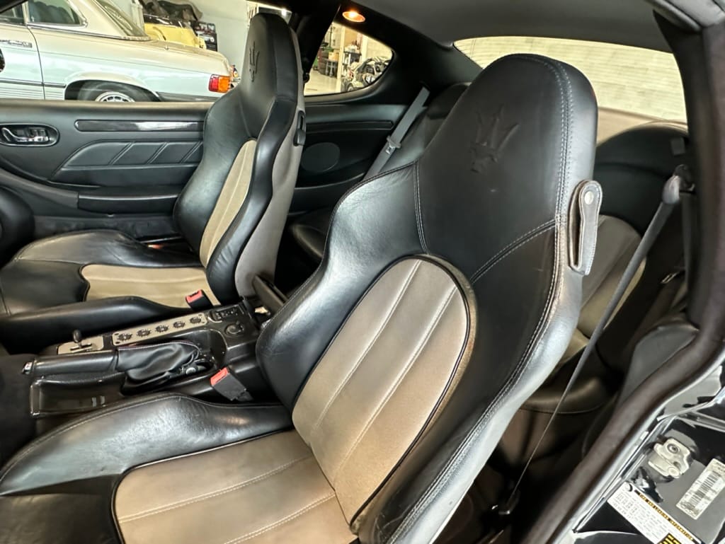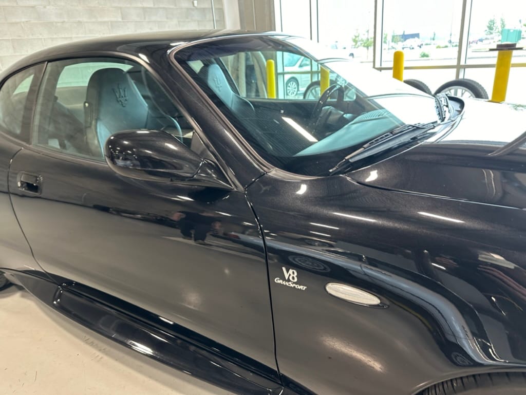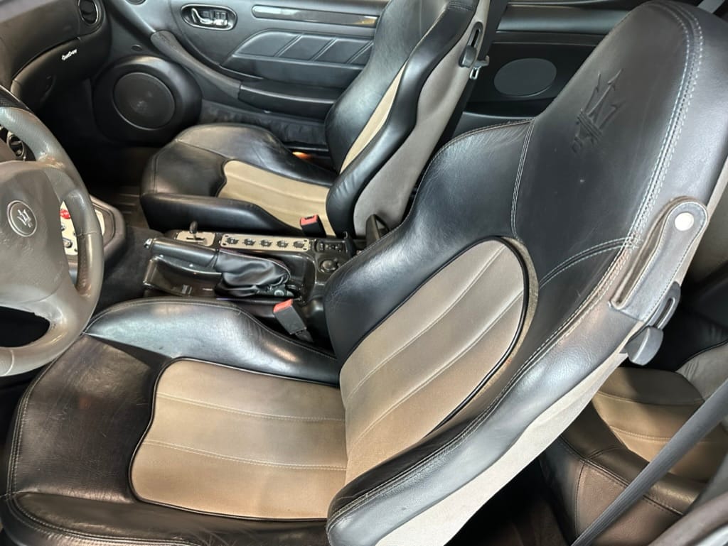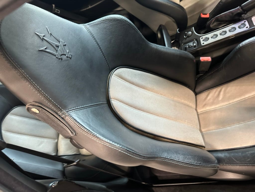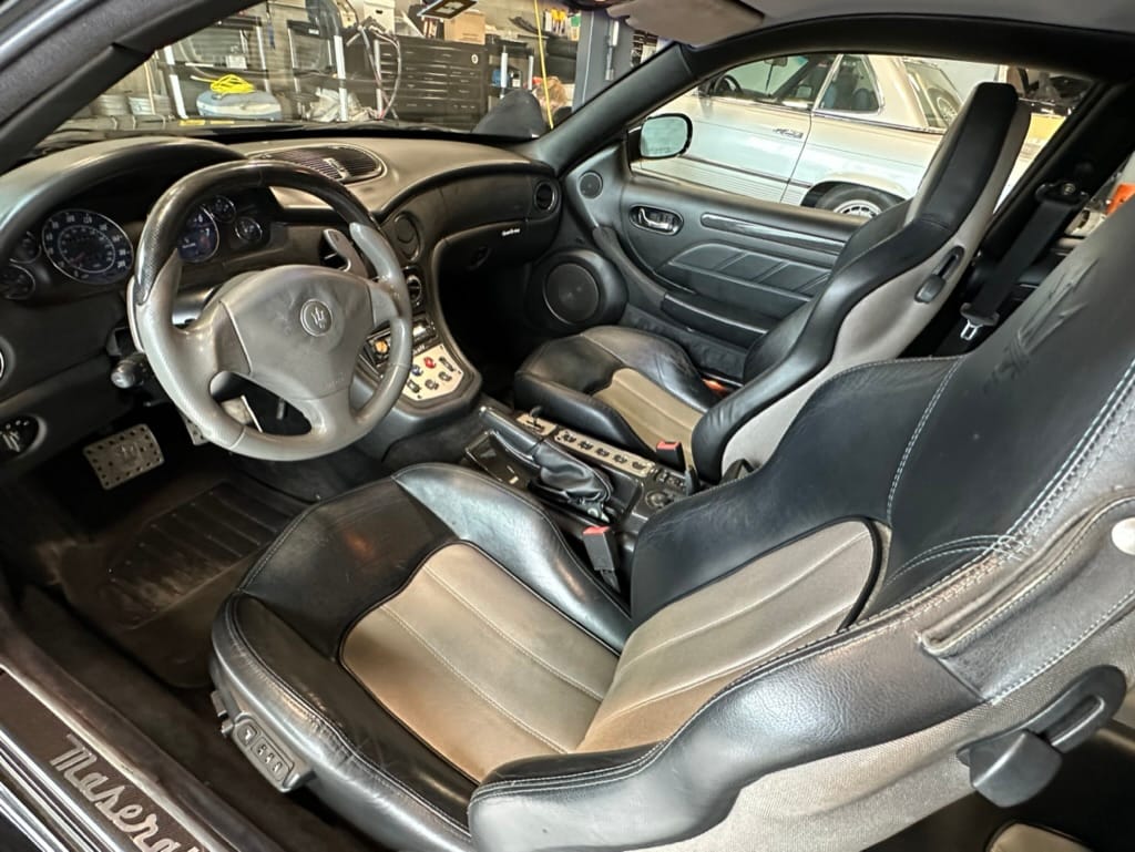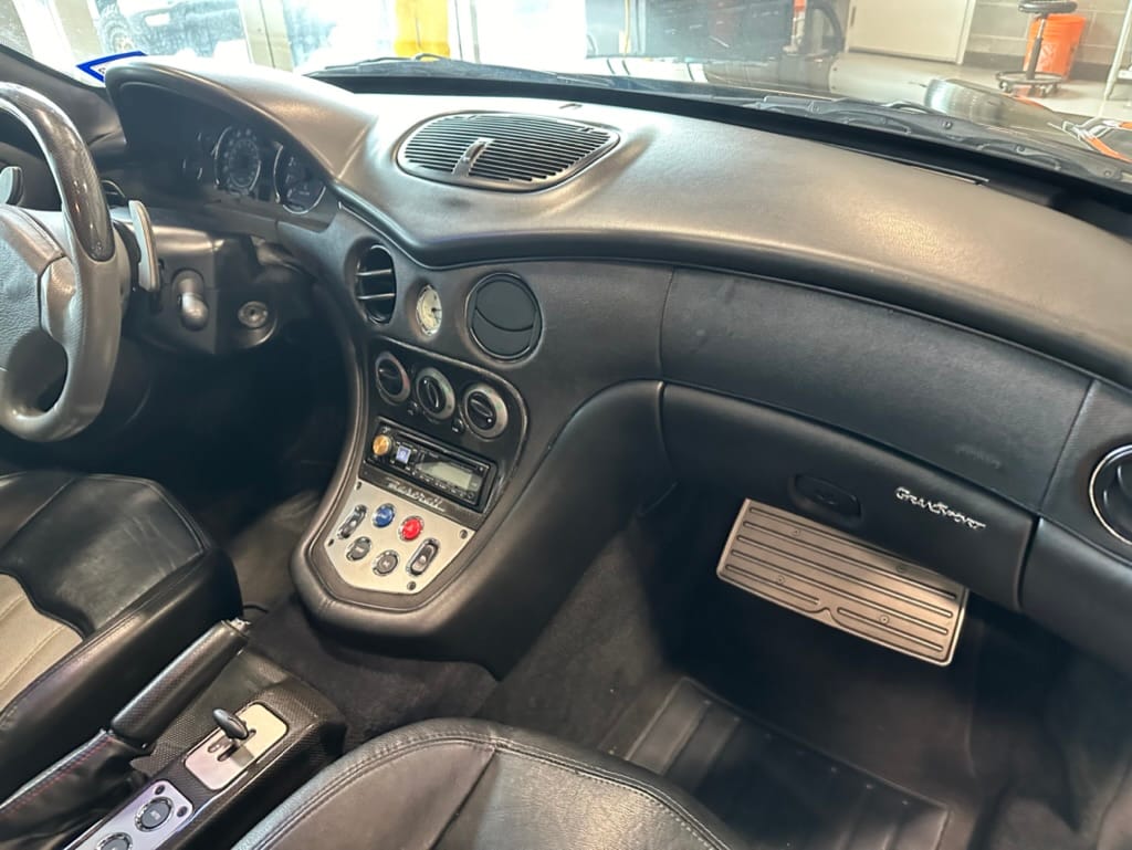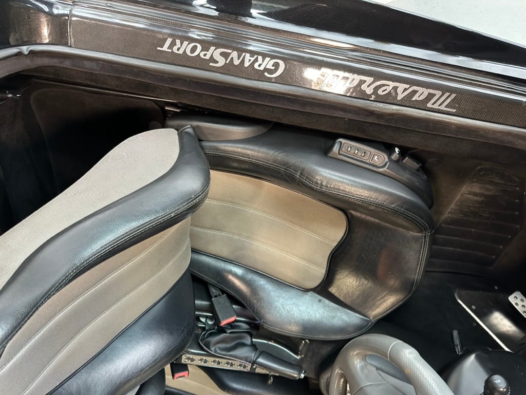 Cosmetically, the car has been treated to paint correction and polish. The interior of this Maserati Grandsport is a combination of black leather and technical fabric. Originally silver, the fabric on the door panels and dash has been dyed black.