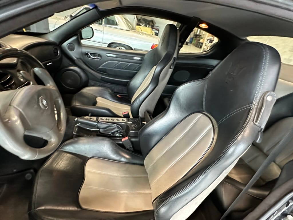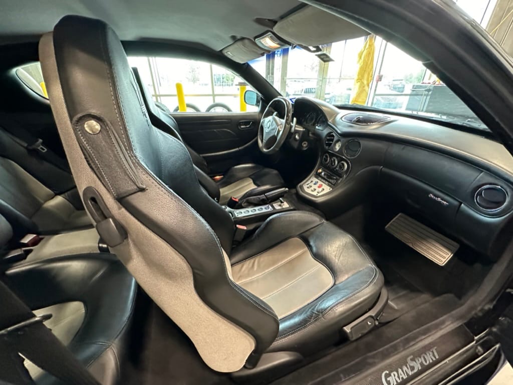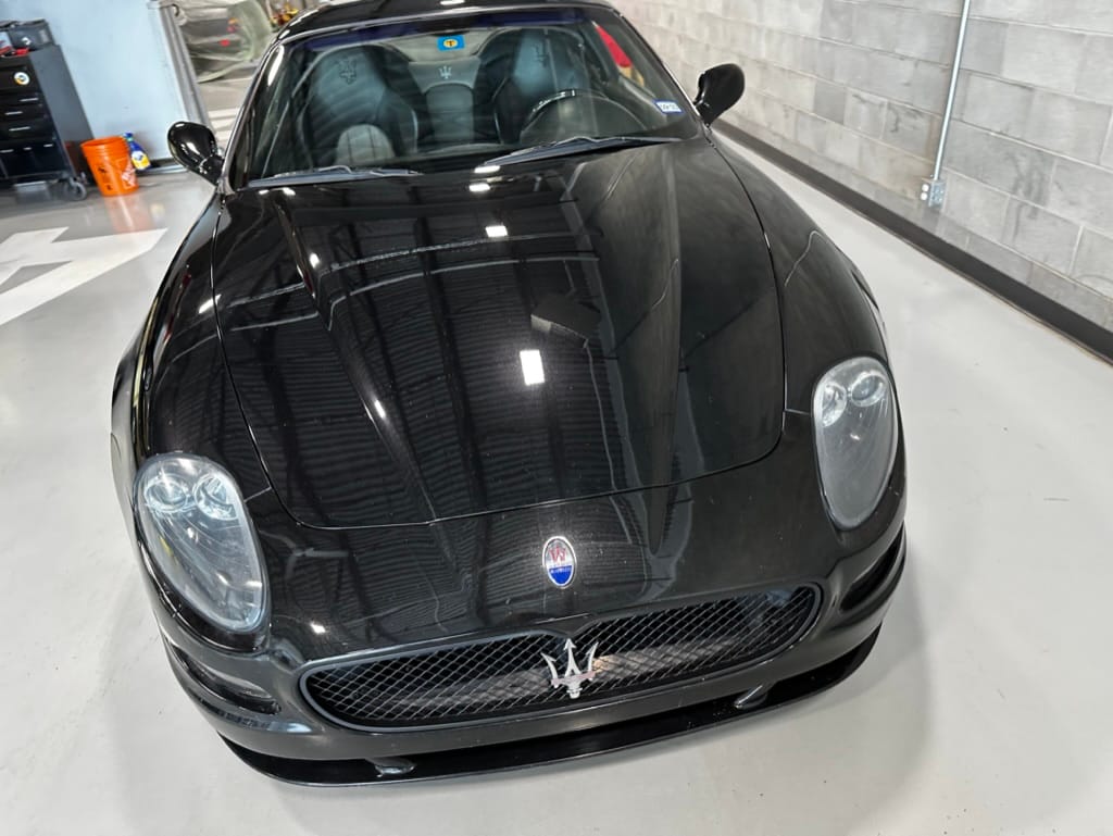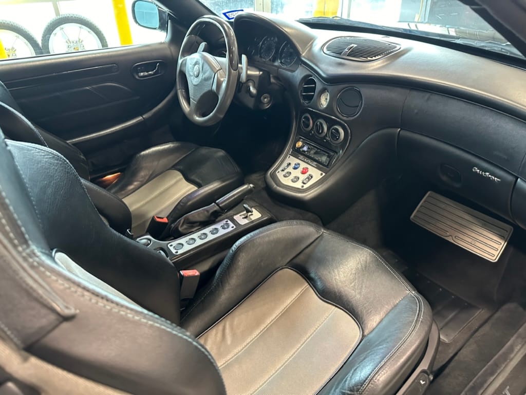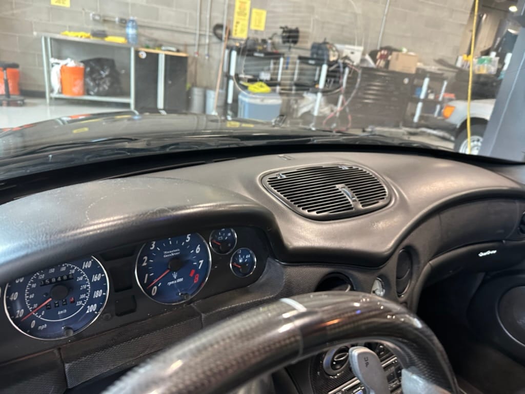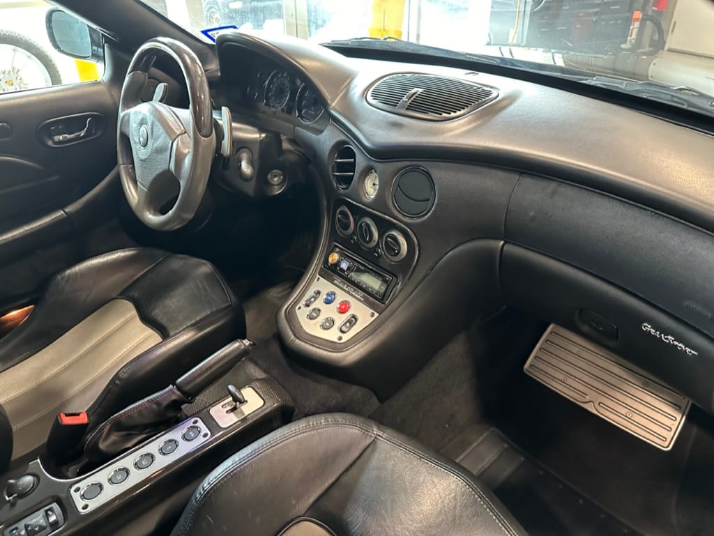 Cosmetically, the car has been treated to paint correction and polish. The interior of this Maserati Grandsport is a combination of black leather and technical fabric. Originally silver, the fabric on the door panels and dash has been dyed black.