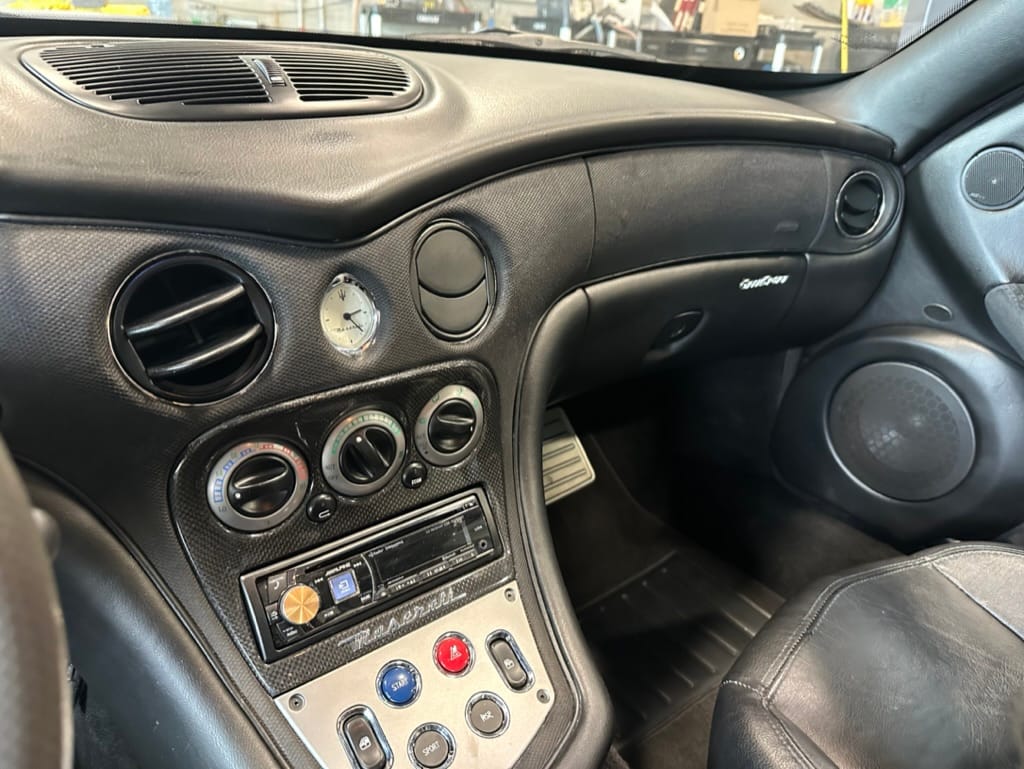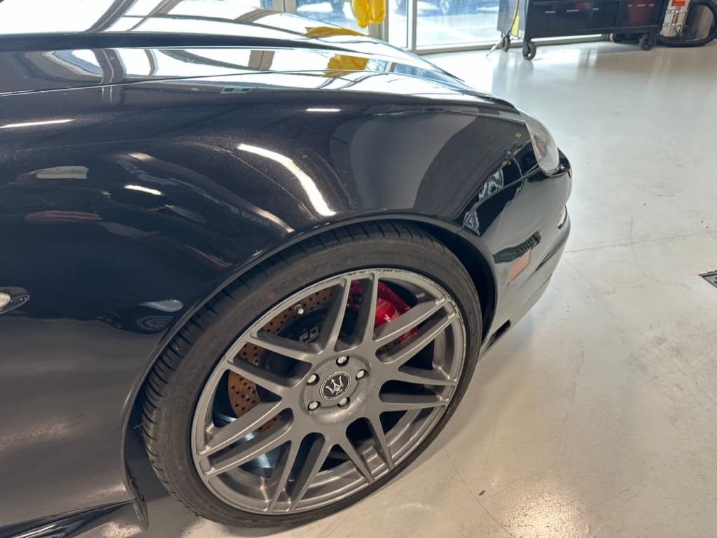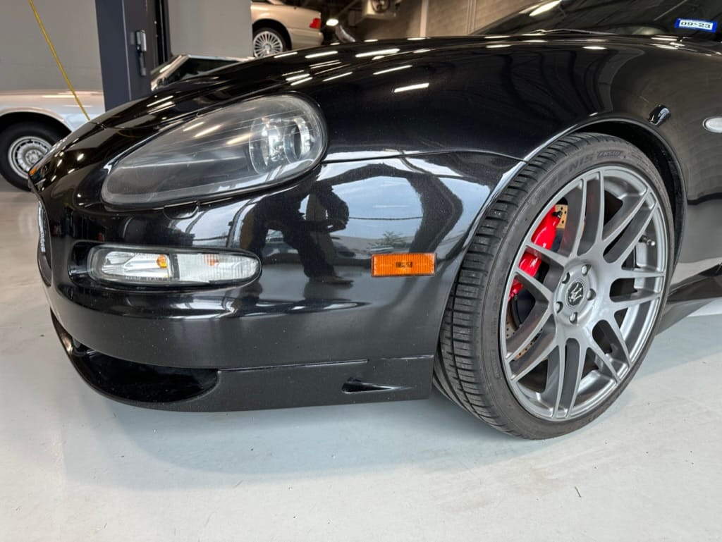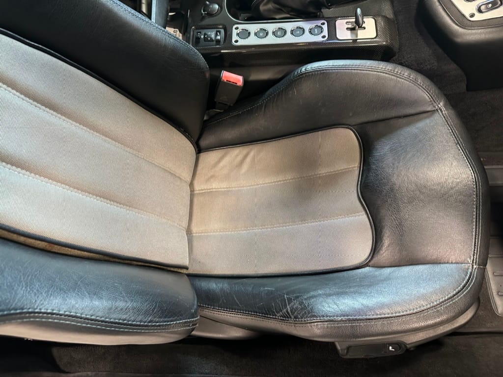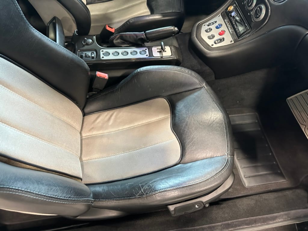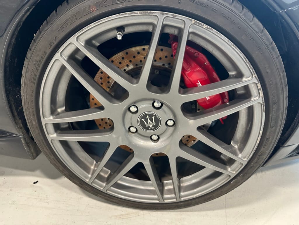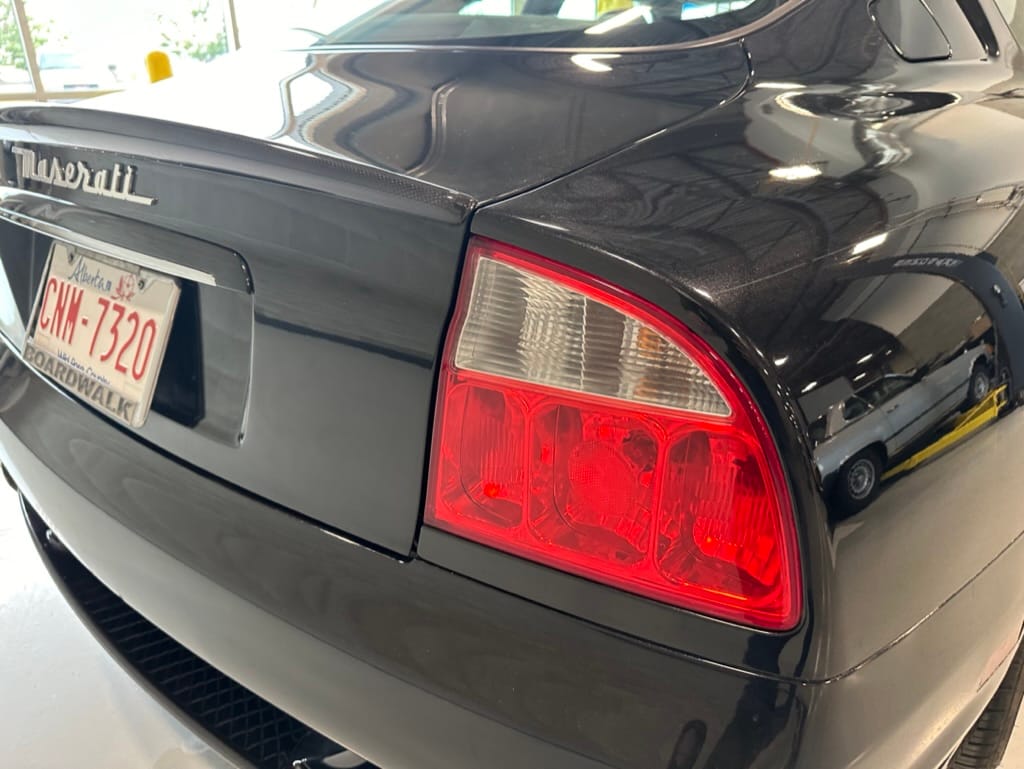 Cosmetically, the car has been treated to paint correction and polish. The interior of this Maserati Grandsport is a combination of black leather and technical fabric. Originally silver, the fabric on the door panels and dash has been dyed black.