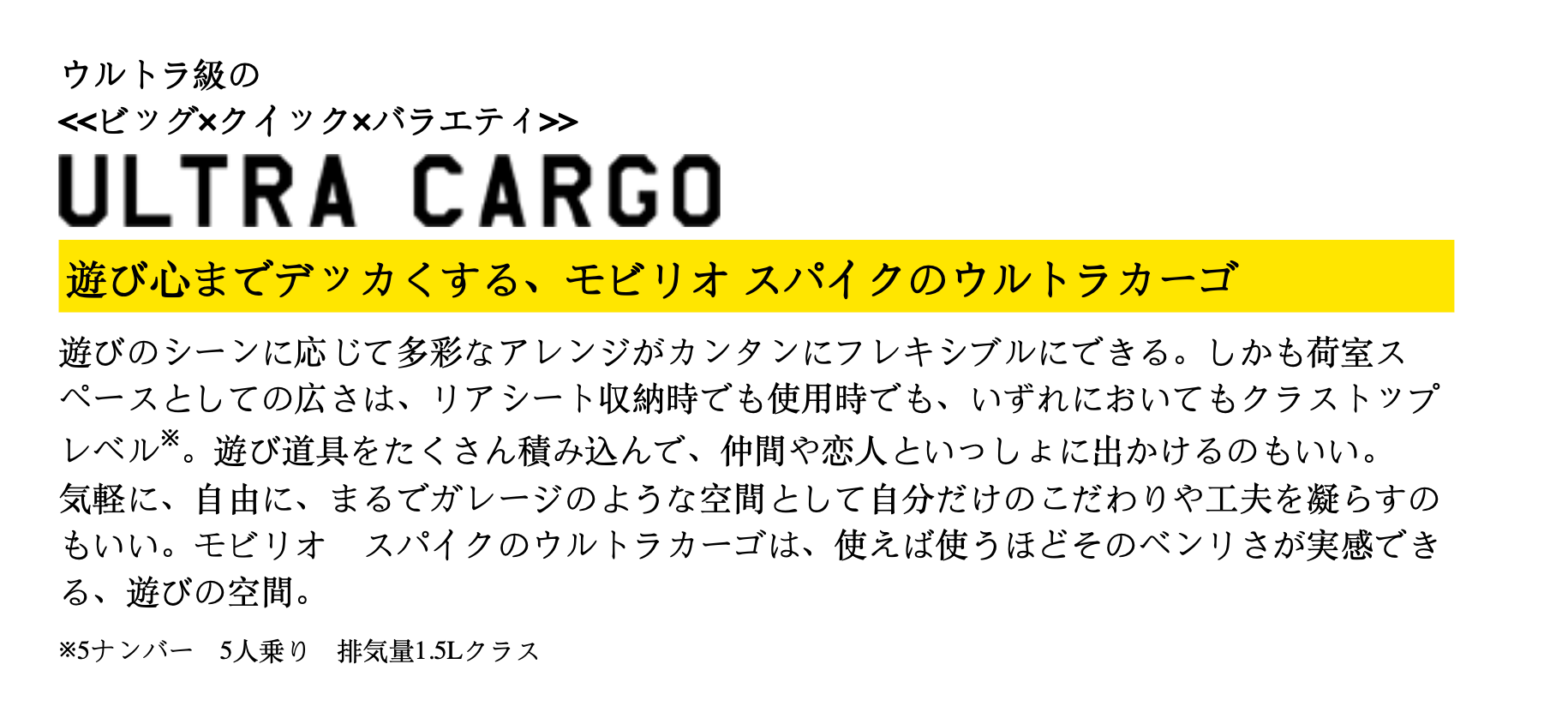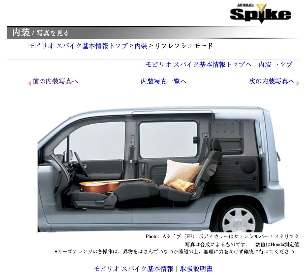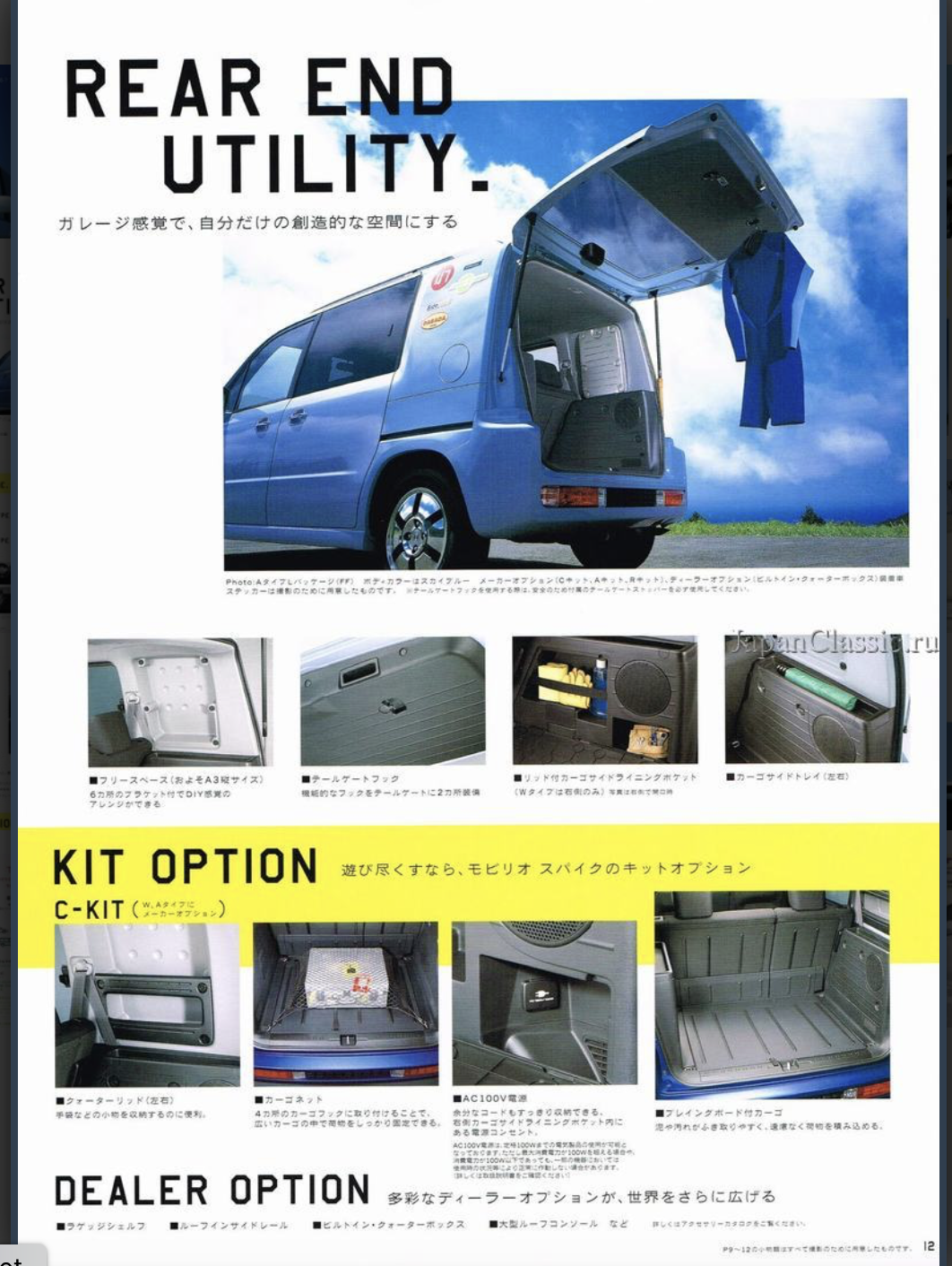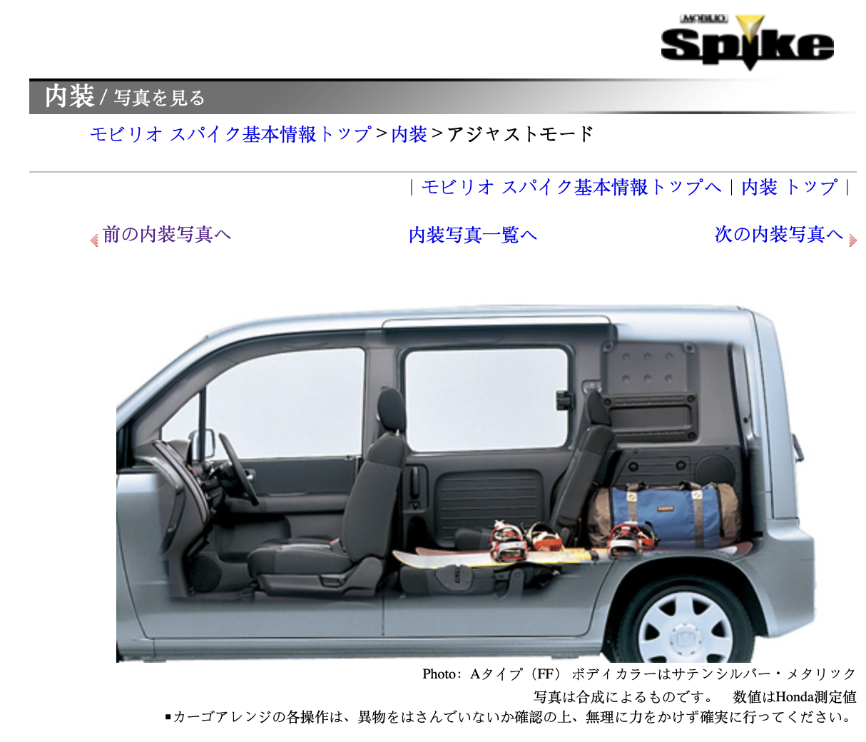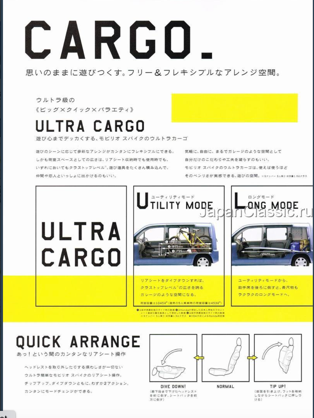 Translation from above: Mobilio Spike's Ultra Cargo that even has a sense of playfulness. A variety of arrangments can be easily and flexibly made according to the play scene. Moreover, the size of the cargo compartment base is at the top level of the class, whether it is in the rear seat storage or in use. It's also good to load a lot of play equipment and go out with your lover [not a lot of private space in Japan! - LR).