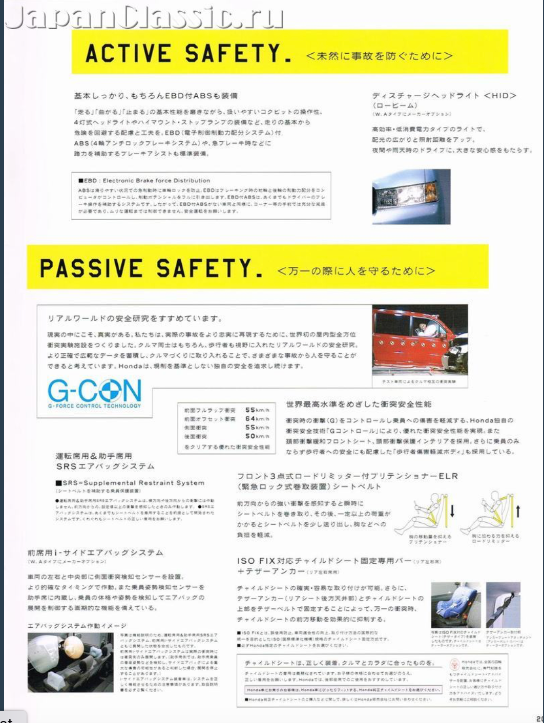 Though it is a small vehicle, it makes use of Honda's G-CON (G-force Control) technology, for enhanced crash safety. The vehicle body is designed to offer protection to occupants in a 55 km/h full-frontal collision, a 64 km/h front offset collision, 55 km/h side collision and a 50 km/h rear collision.