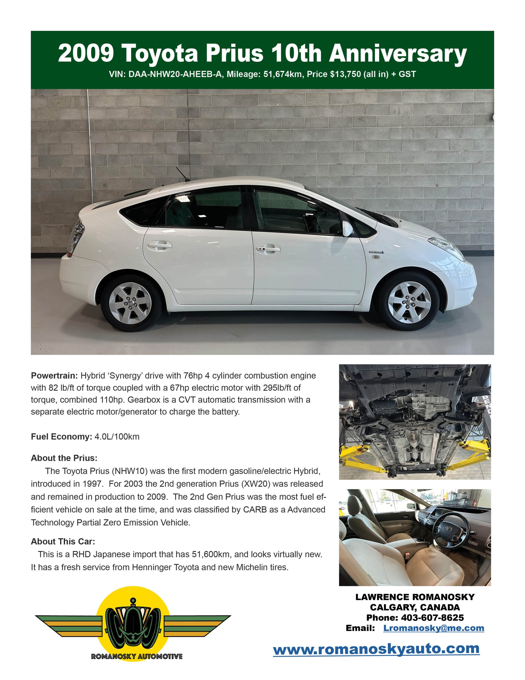 This car was imported from Japan in September 2024, and shipped to Calgary from Vancouver. It has 51,600km (Sept 25, 2024), looks new and is impossible to reasonably fault. It does not have a single rock chip on the front clip or windshield. Henninger Toyota completed a an oil and transmission service in Sept 2024, and installed a set of Michelin Defender tires at a total cost of approximately $2,000.