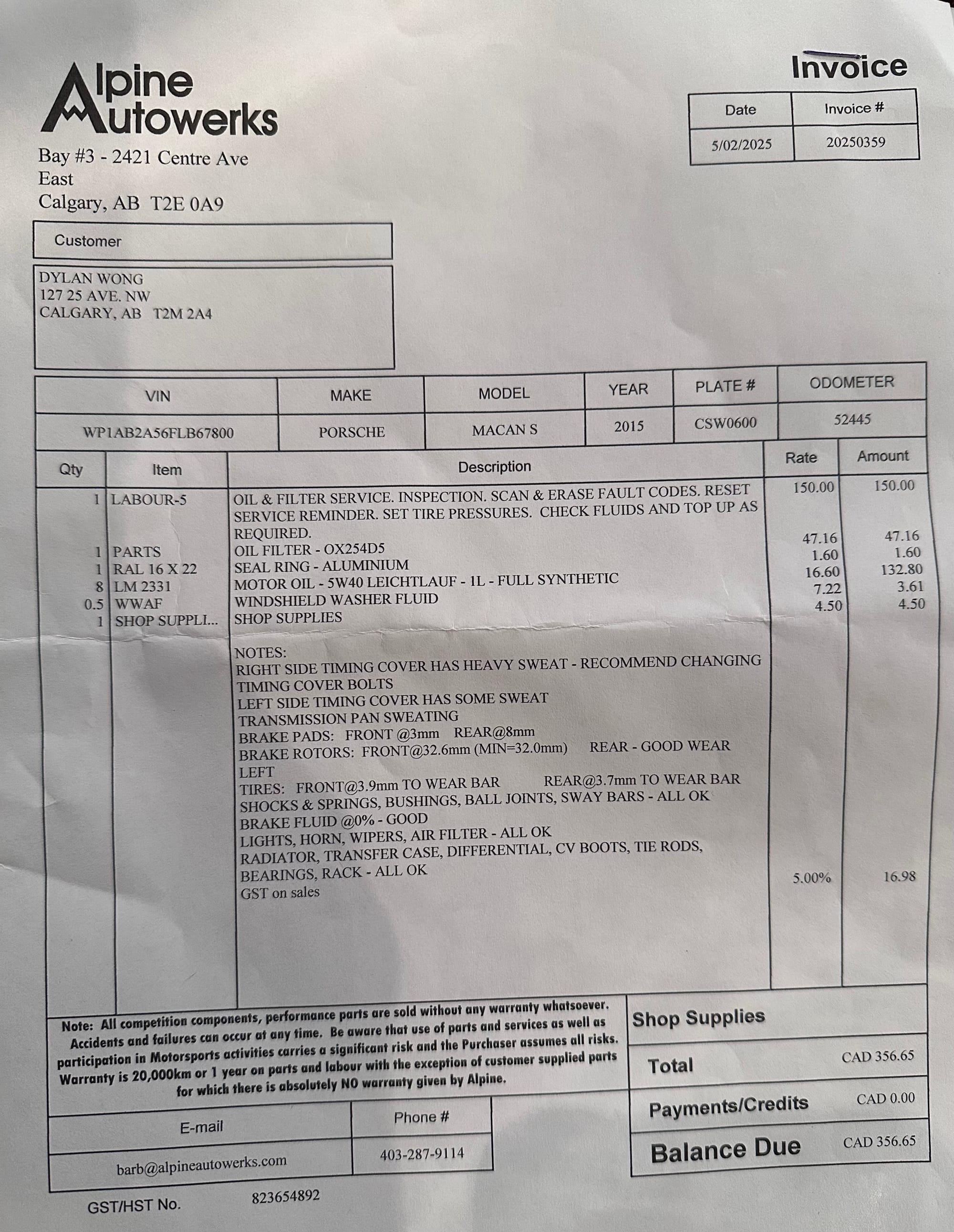 The vehicle presents without any material flaws, and is impossible to reasonably fault for the year and mileage. It wears full front PPF which covers the entire front clip and shows minimal wear. The interior looks new. The windscreen is free from rock chips. The tires and brakes have about 25% left, and are most likely good for another 10,000km. This Macan was inspected and serviced at Alpine Autowerks in Feb 2025 with 52,445km where it received an oil service. The invoice is in gallery. Apart from some 'sweating'- light from the left timing chain cover and transmission pan, heavy from right side timing cover-the vehicle received a clean bill of health. The aluminum timing chain bolts, the cause of Macan S timing cover leaks, can be replaced with stainless steel replacements which cure the leaks in most cases and does not require the removal of the engine. This procedure was recommended by Alpine.