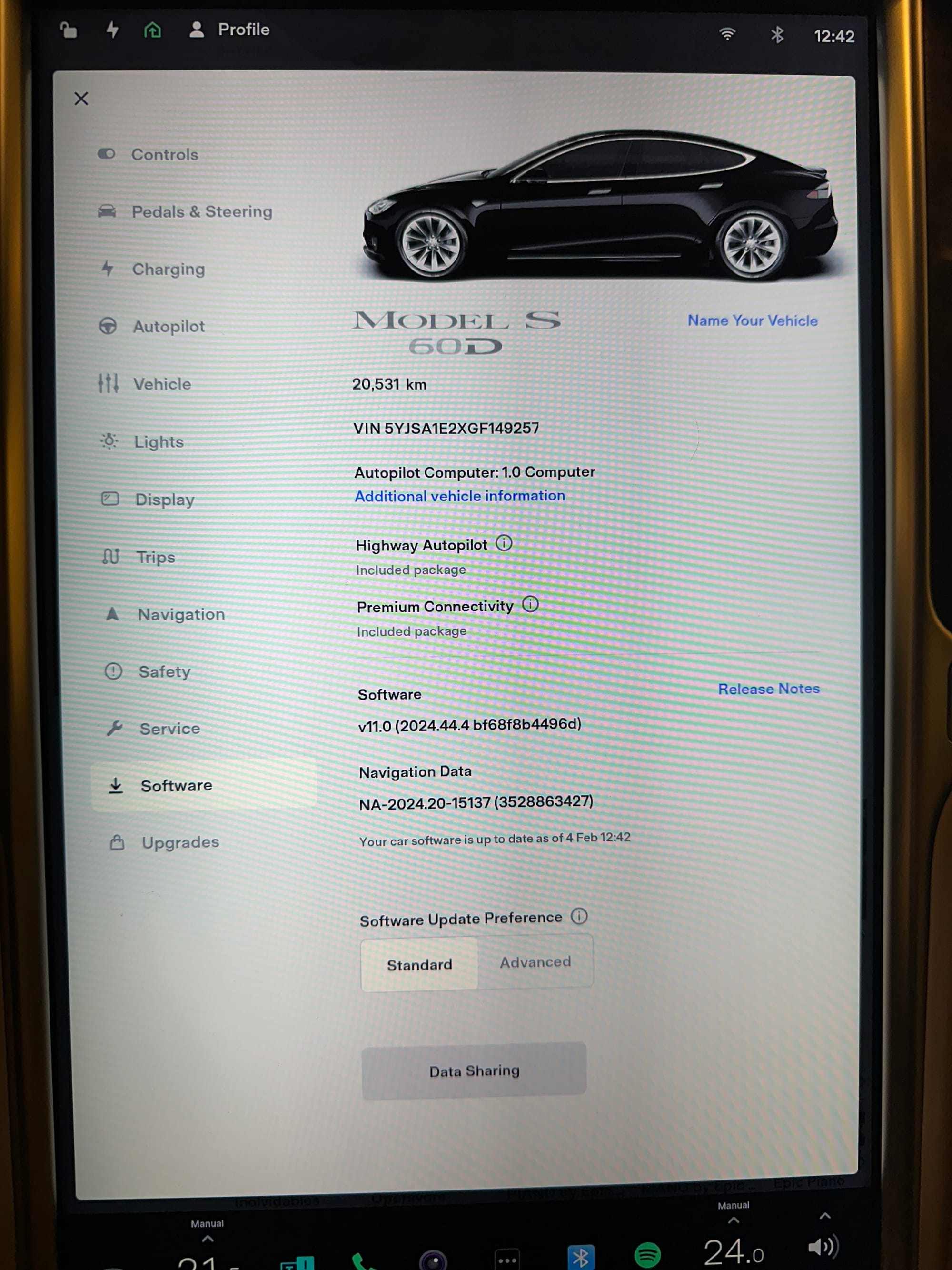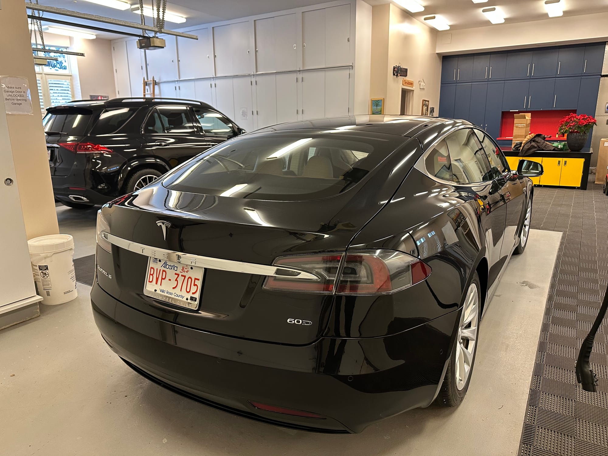 This particular Model S is the dual motor, AWD version with a battery pack rated at 60kW. It has the identical battery to the 75D (75kWh) but it has been software limited to 60kW. For a fee, Tesla can upgrade the battery to make all 75kWh available which would increase the real world range from about 300km to 375km. Transport Canada rate the 60D at 352km and the 75D at 417 respectively.