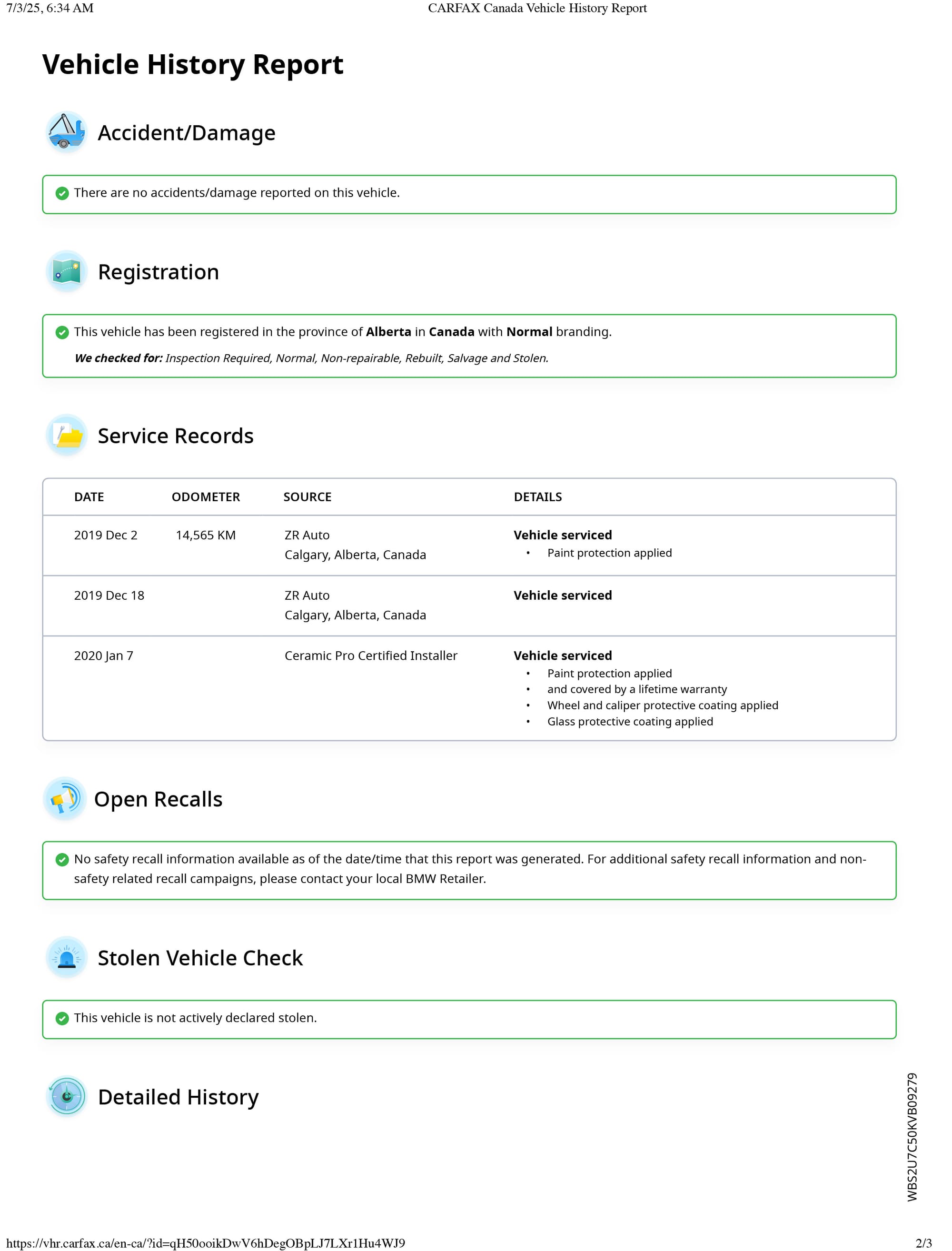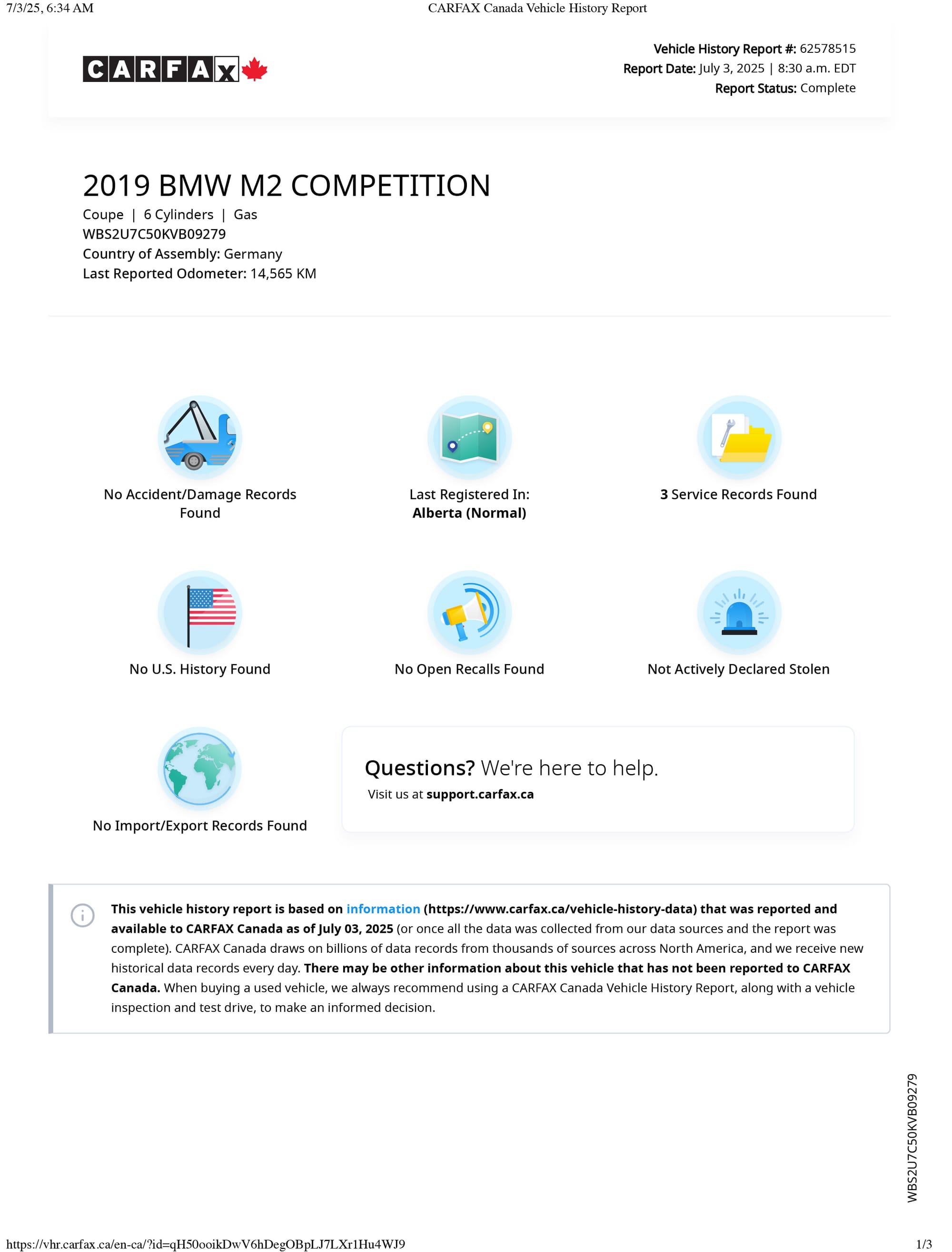 The car was sold with a BMW extended warranty and a pre-paid service plan. This M2 has always been serviced at BMW Gallery in Calgary, and was given a comprehensive inspection and service before the warranty ran out in April 2025. Currently the next service is due in 14,000km or September 2025.