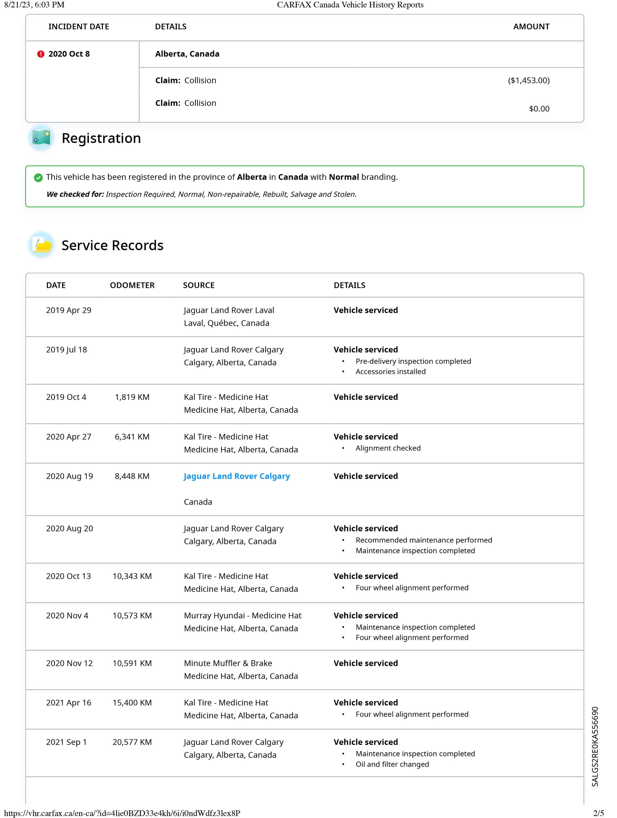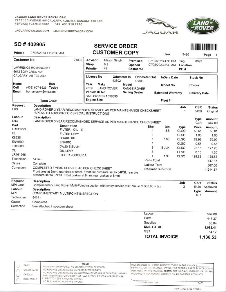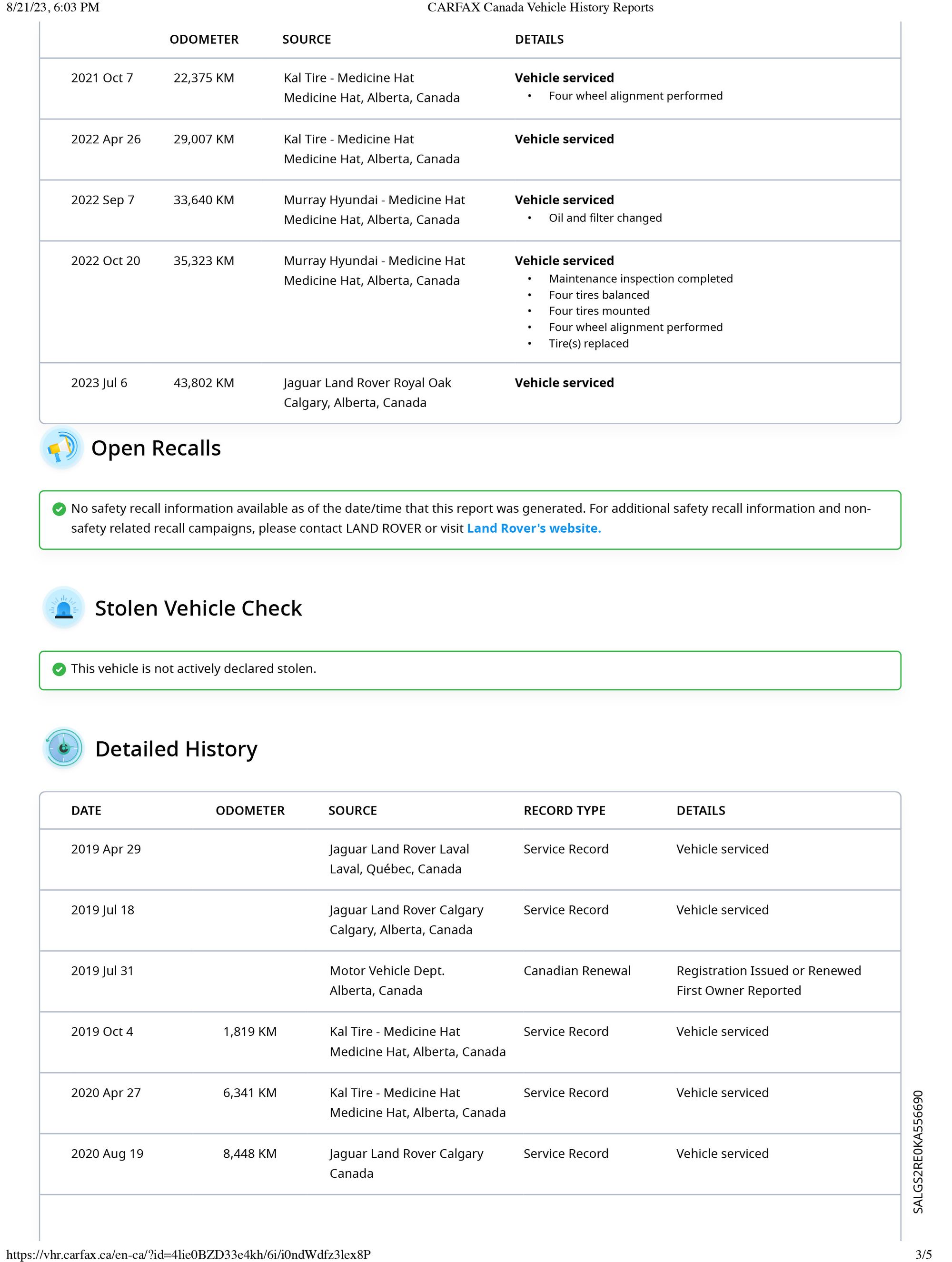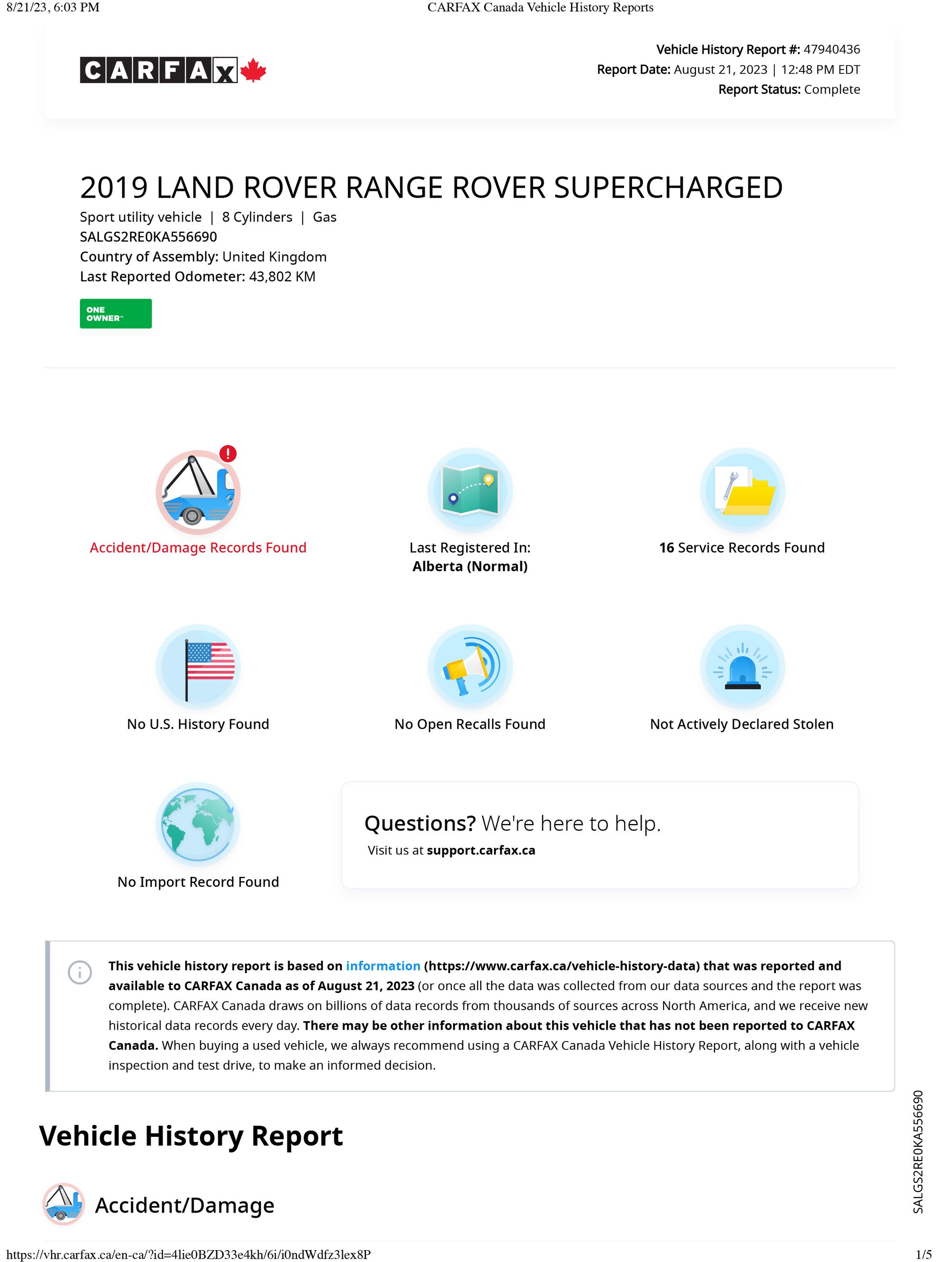This Land Rover was purchased by a Medicine Hat resident from Calgary Land Rover, and has led an easy life accumulating less than 44,000km since July 2019 when it was delivered. It has required only regular servicing which has been done by Land Rover Calgary and Murray Hyundai in Medicine Hat - who have a dedicated tech who looks after local high end and specialty vehicles. The vehicle has been maintained fully to Land Rover service guidelines. It has full factory warranty until July 31, 2023.
