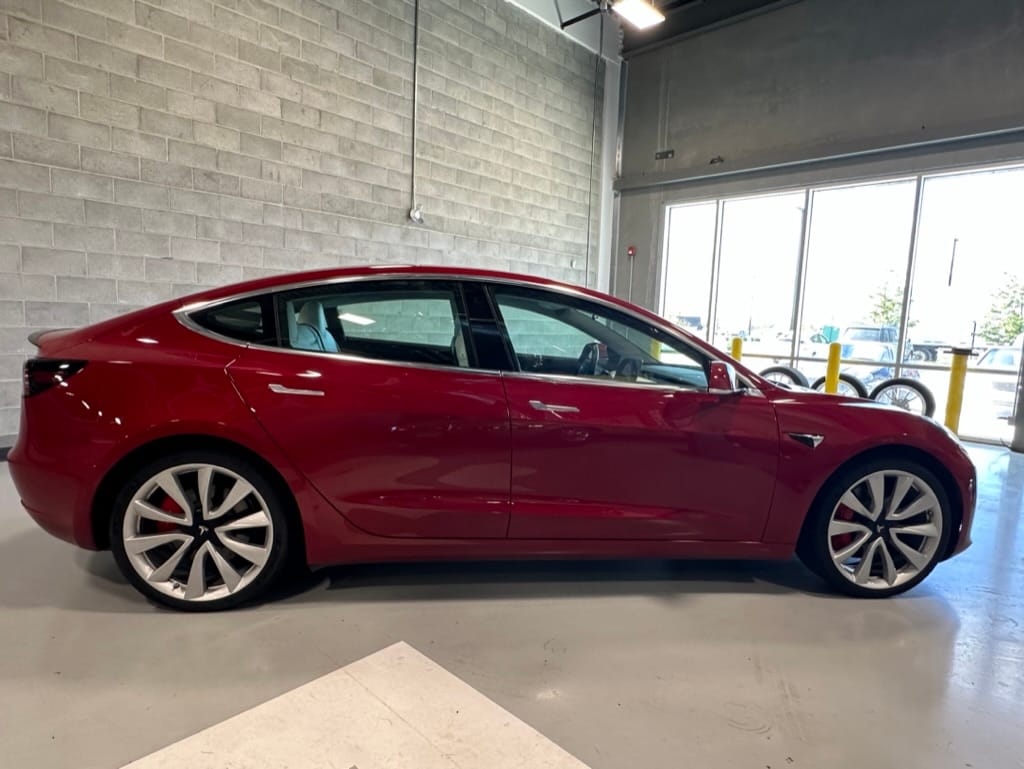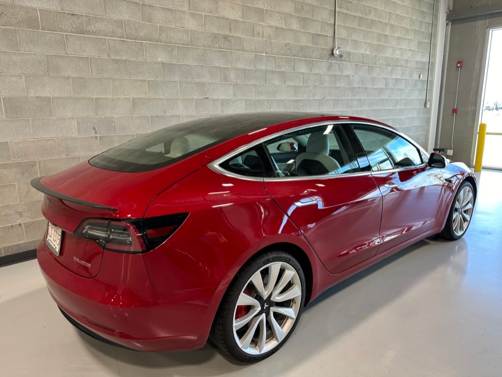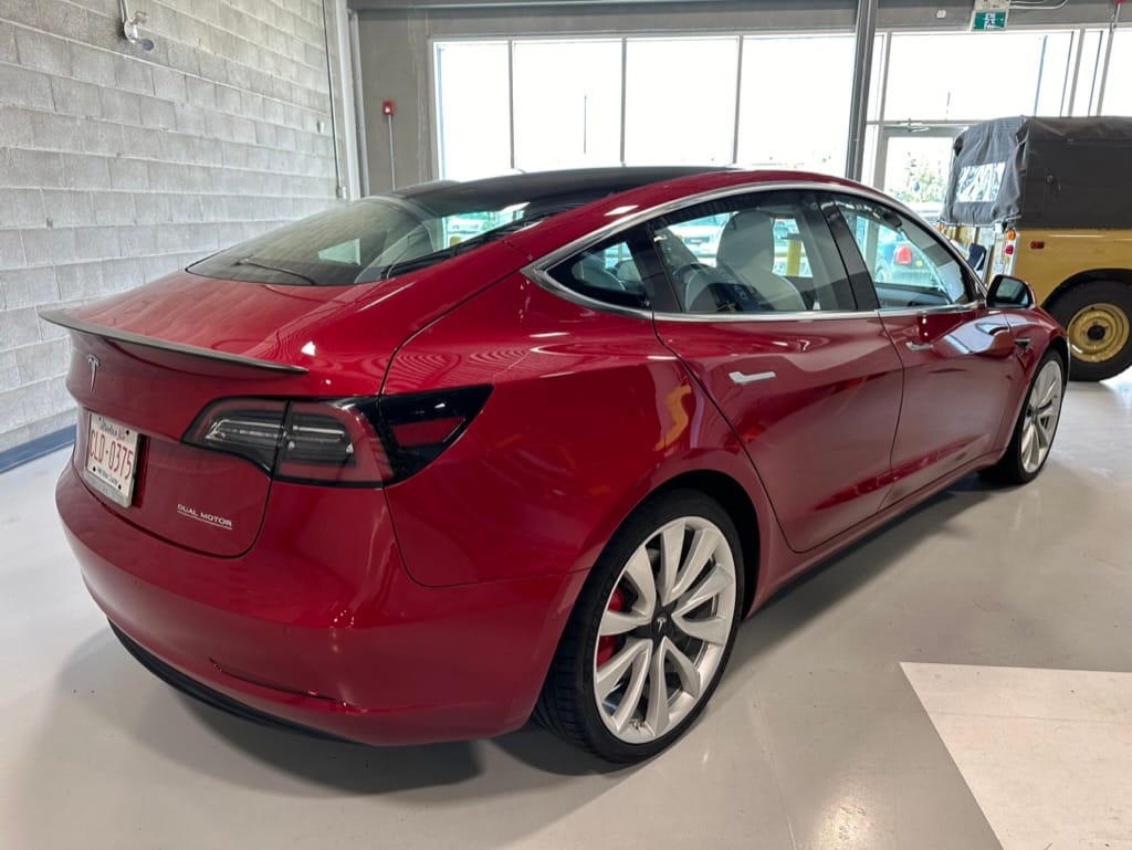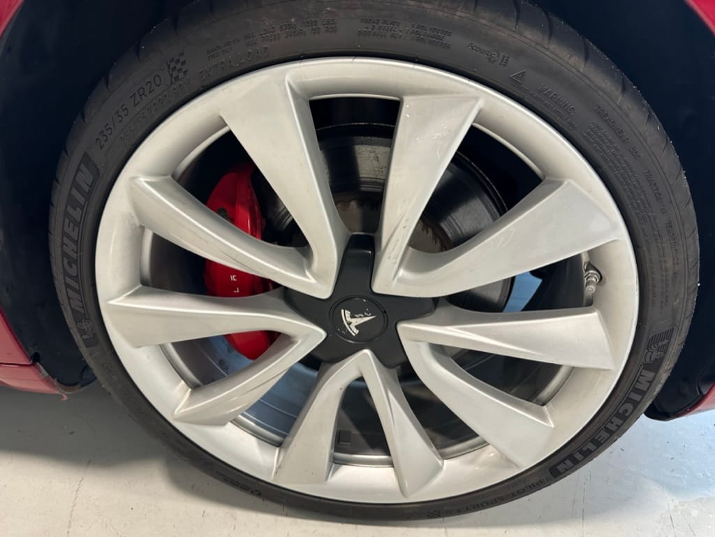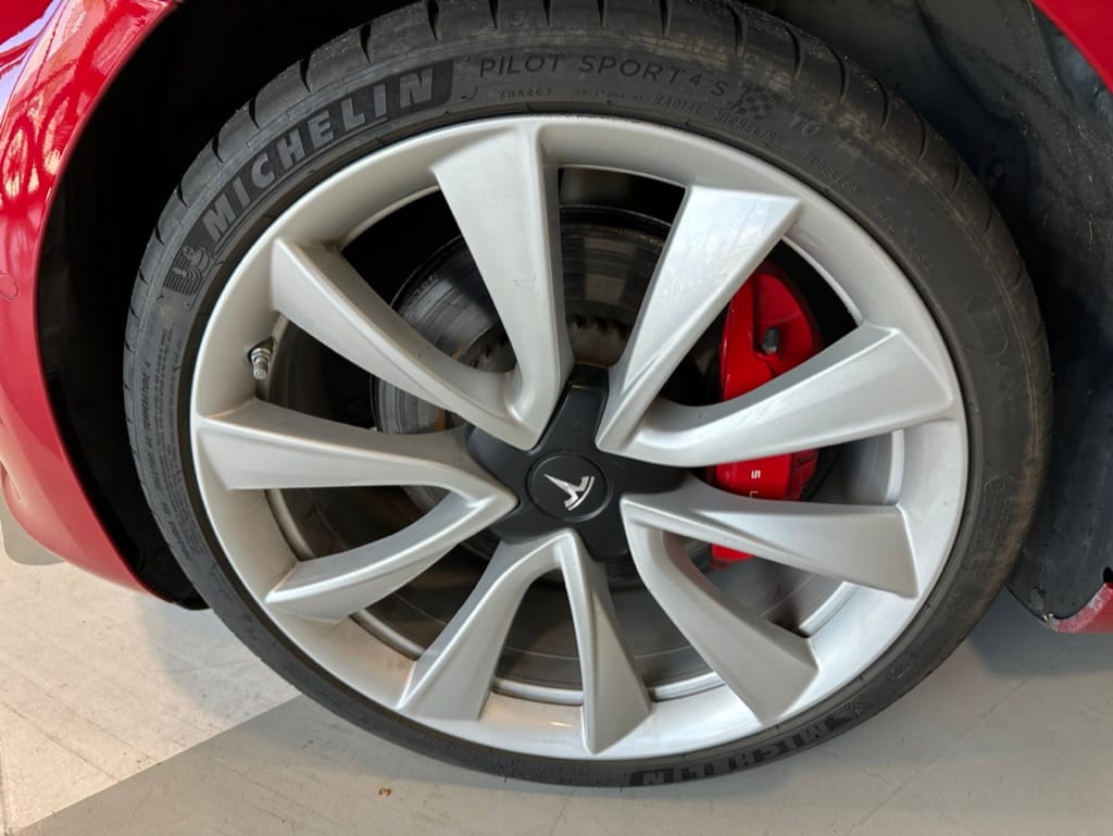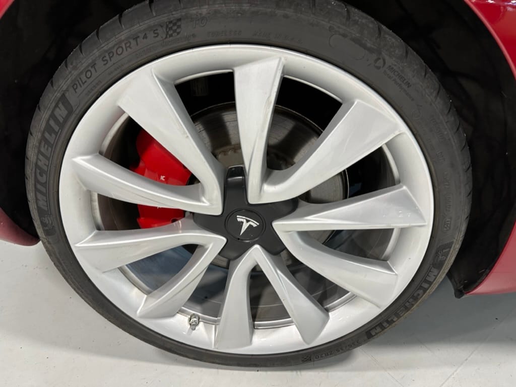 The Performance variant gives you more powerful electric motors on both front and rear axles producing approximately 475hp combined, as well as a battery pack with greater energy density. Acceleration is better than most super sports cars with 0-100km/hr taking just over 3 seconds. The suspension was upgraded, along with brakes which have red painted callipers. The 20" wheels are shod with 235-35-20 performance rubber (Michelin Pilot Sport 4S). The Model 3 performance also has a carbon fiber rear spoiler to reduce lift at high speeds.