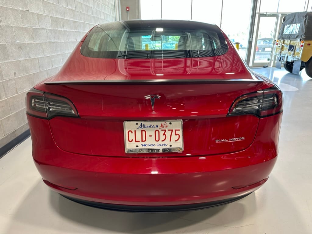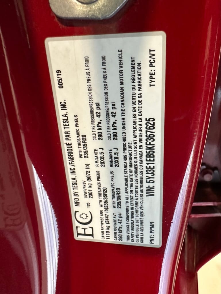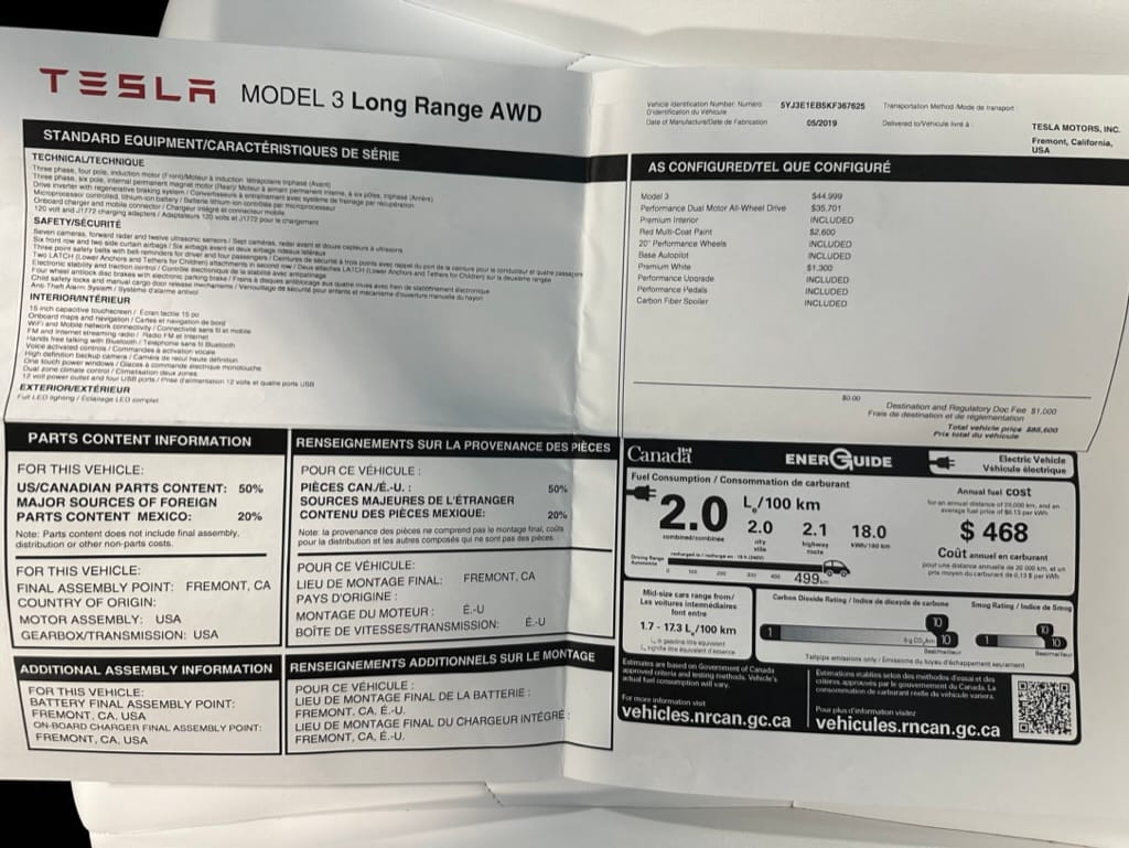 This 2019 Model 3 Performance had an MSRP of $85,600 to which the original owner added a 2nd set of 20" wheels and winter Michelin Pilot Alpins in the same size of 235-35-20. Options included the Multi Stage Red paint and white/black interior.With GST this car's total cost was approximately $95,000.