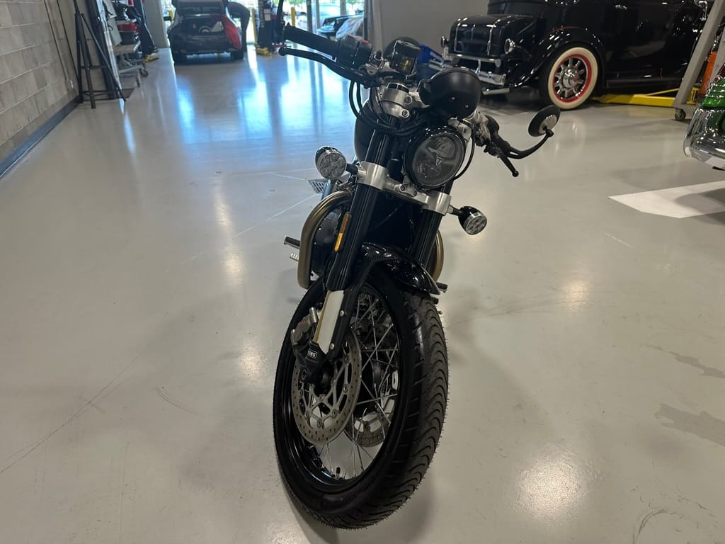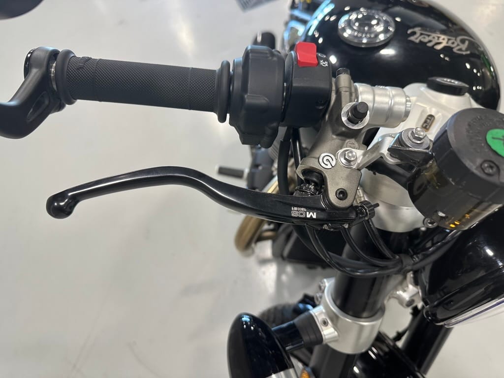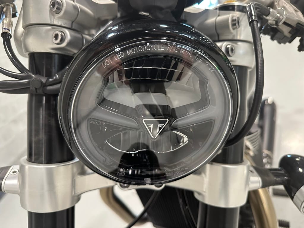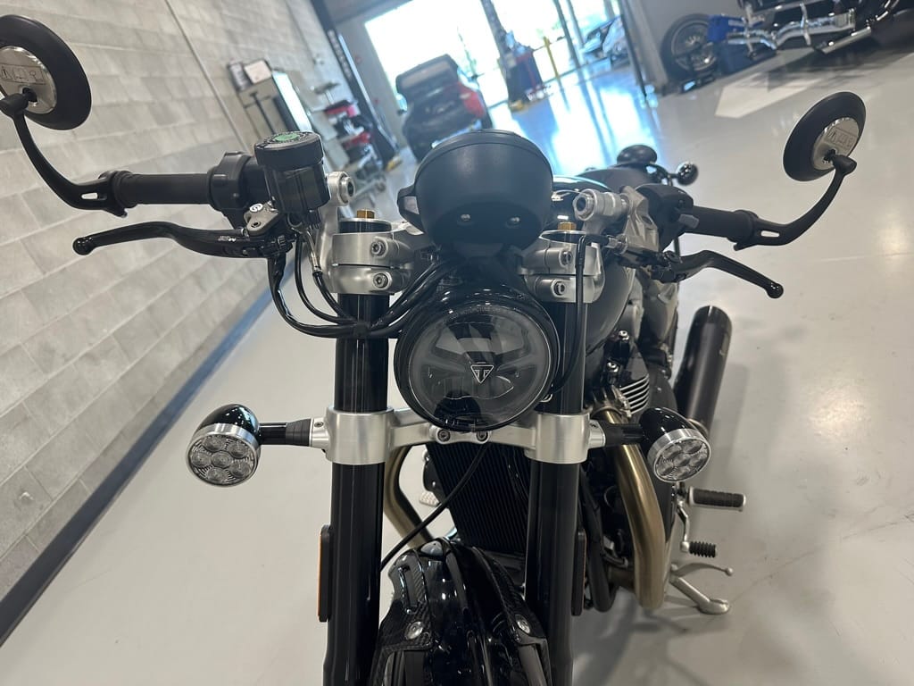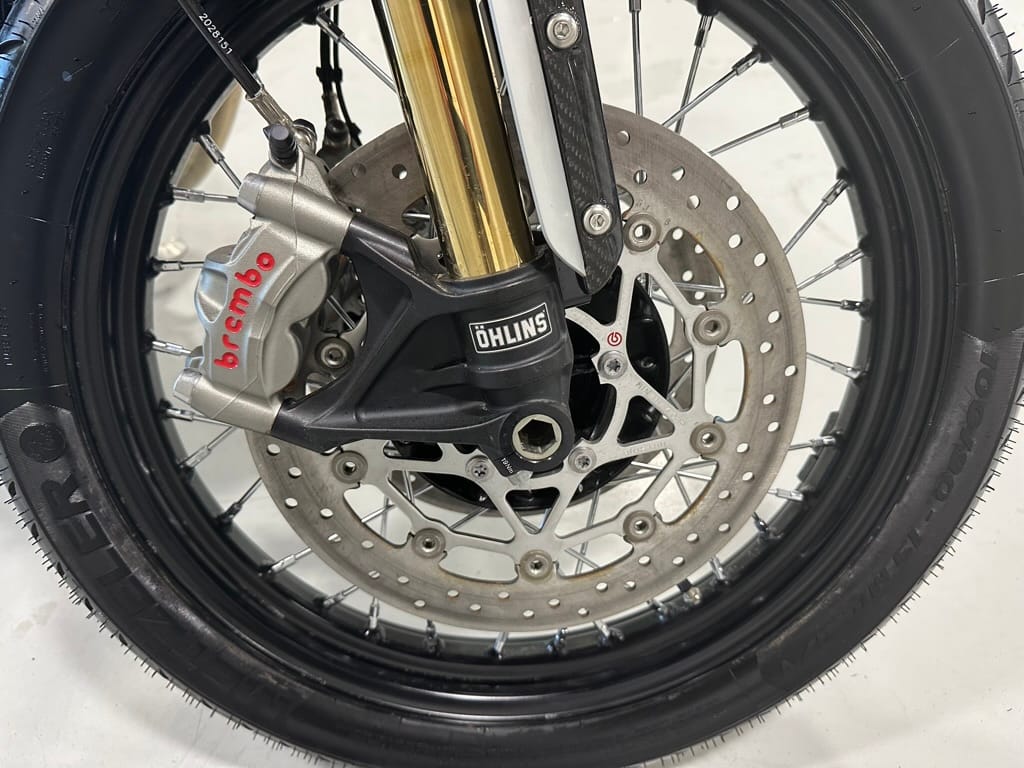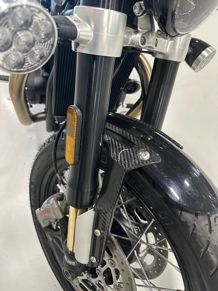 The liquid-cooled 1,200cc parallel-Twin produces the same peak power and torque as in the standard Bonneville Bobber, but in the TFC, those numbers arrive lower in the rev range, with peak power of 77 hp arriving at 6,000 rpm (6,100 rpm on the standard) and peak torque of 78.2 lb-ft arriving at 3,750 rpm (4,000 rpm on the standard). The TFC also gets Sport riding mode in addition to the standard’s Road and Rain modes, and traction control and ABS are standard. Overall, the TFC weighs 30 lb less than the standard Bobber, with a claimed wet weight of 523 lb