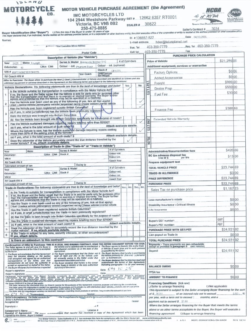 This Bobber TFC was purchsed at Blackfoot Barnes Motorsport in April 2025 for a price of $CAD 24,932 including Freight, PDI, dealer fees and tax.