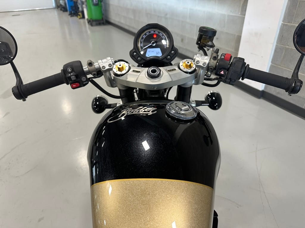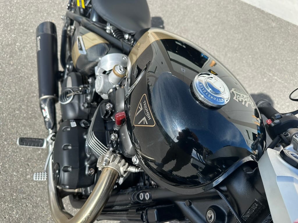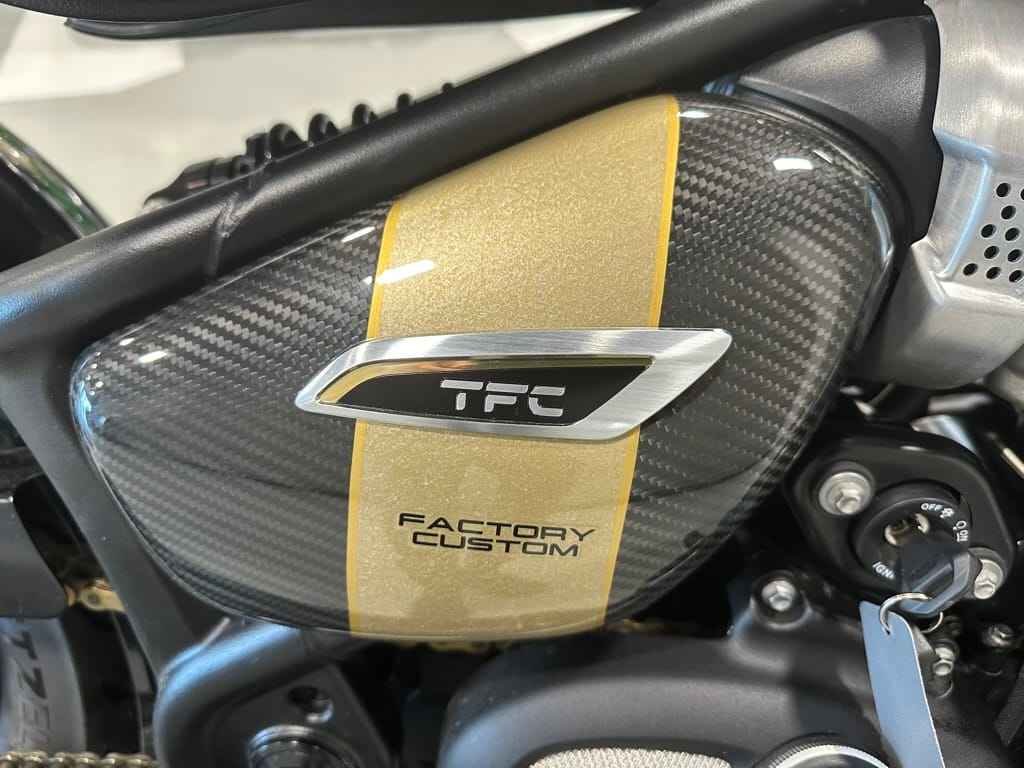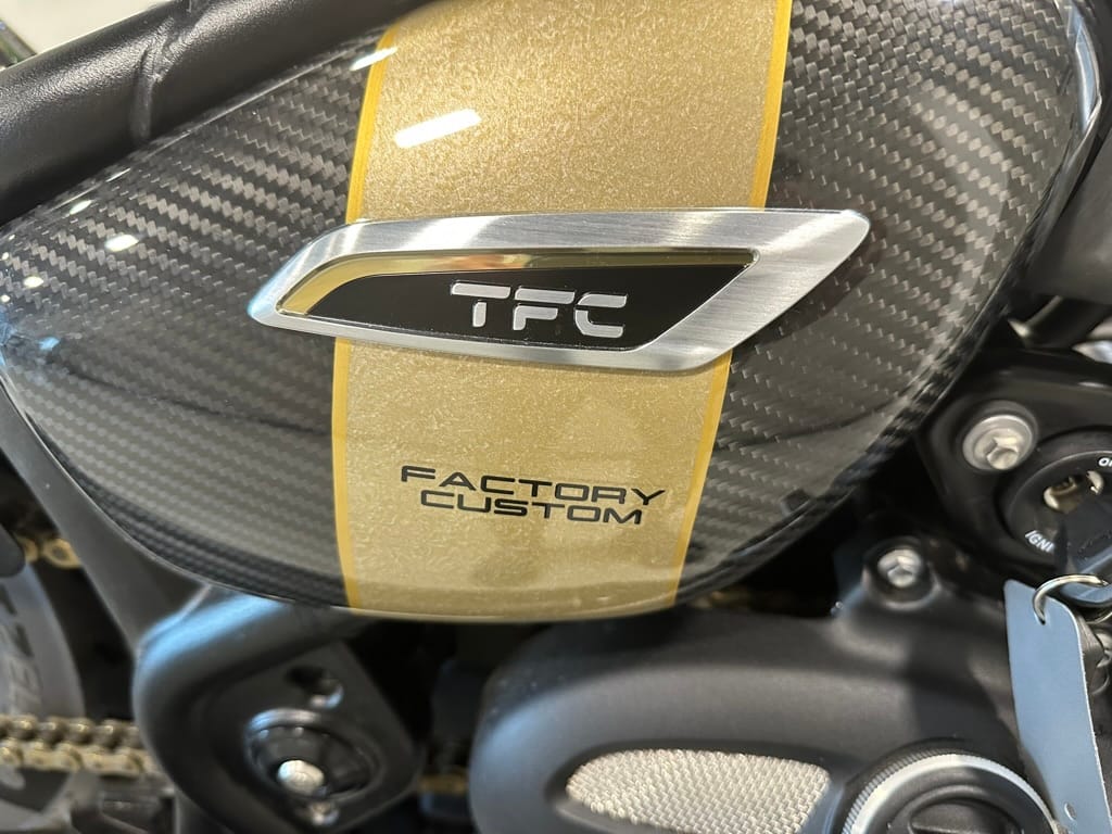 “TFC” in the model’s name stands for “Triumph Factory Custom.” The Bobber TFC is recognizable by its two-tone paint with hand-painted marble gold textured accents on the tank and side panels, and the tank includes the artist’s signature on the underside. Replacing the standard Bobber’s handlebar are clip-ons, and the standard Bobber’s 16-inch front wheel is replaced by a 19-incher on the TFC.