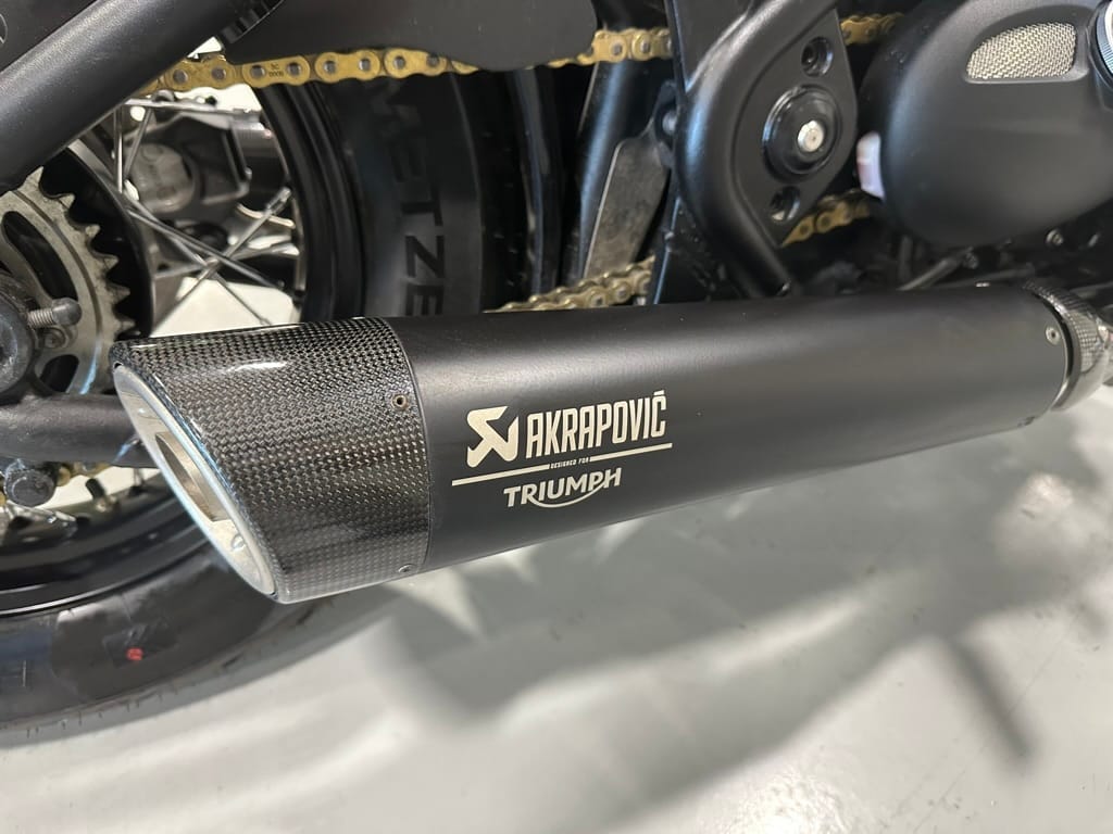 The Triumph Bonneville Bobber also gets a pair of slash-cut Akrapovič silencers with carbon-fiber end caps. It swaps out the standard Showa suspension for Öhlins suspension front and rear, including a gold-anodized 43mm NIX 30 inverted fork and a hidden rear shock. Adding more splashes of gold to the bike are the billet-machined engine-cover badges and the drive chain, as well as details on the ignition key. The premium leather seat is embossed with the triangular Triumph logo.