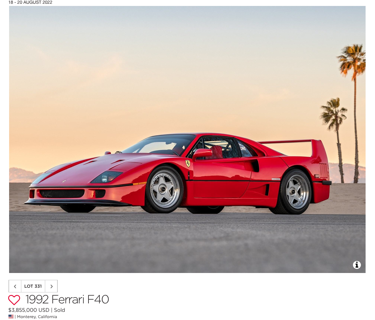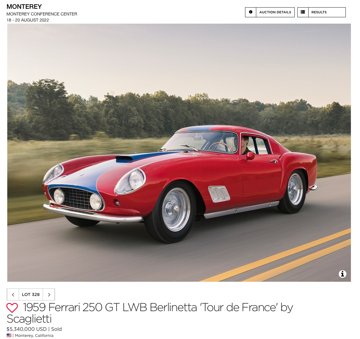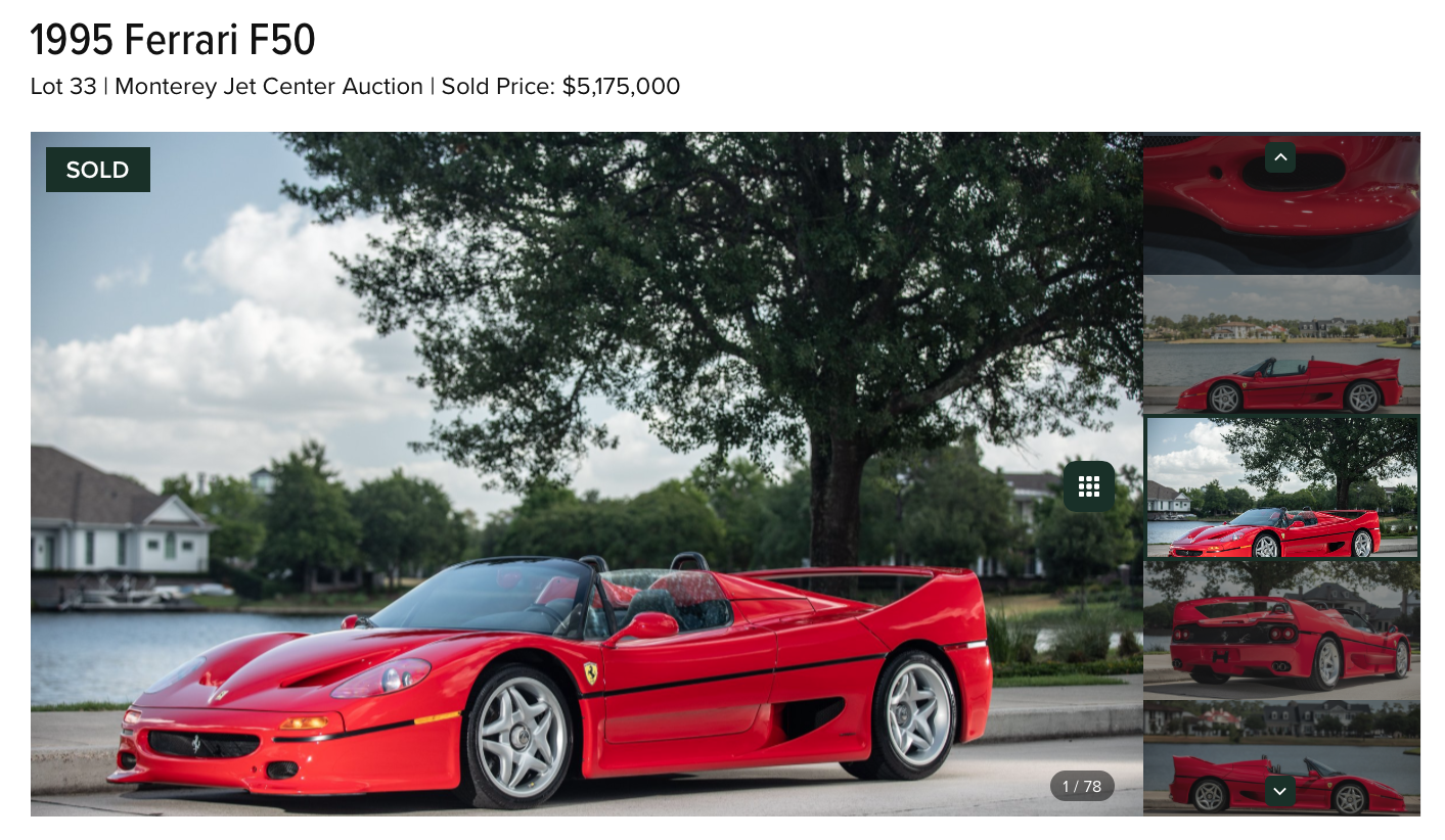RM sold a 1959 Ferrari 250 Tour de France for $5.34M. This was one of 77 TDF's, and a genuine competition Ferrari. Broad Arrow got roughly the same number ($5.175M) for a 1 of 349 Ferrari F50.