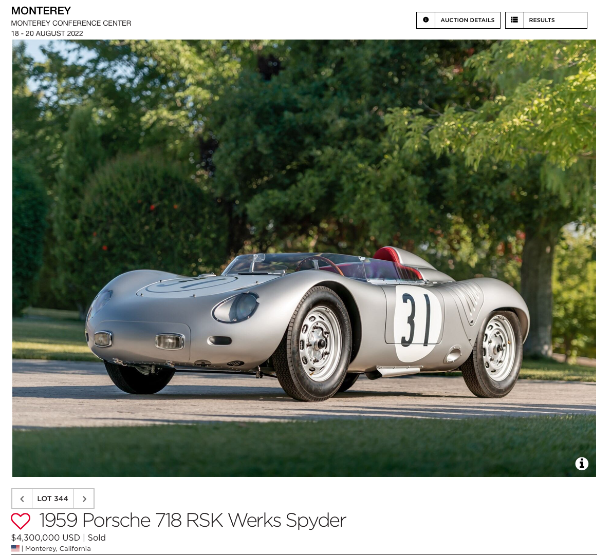 Broad Arrow's 1 of 500 La Ferrari sold for just under $4M, about the same price as a 1 of 10 Porsche built 718 RSK prototype with class wins at Le Mans and Sebring.