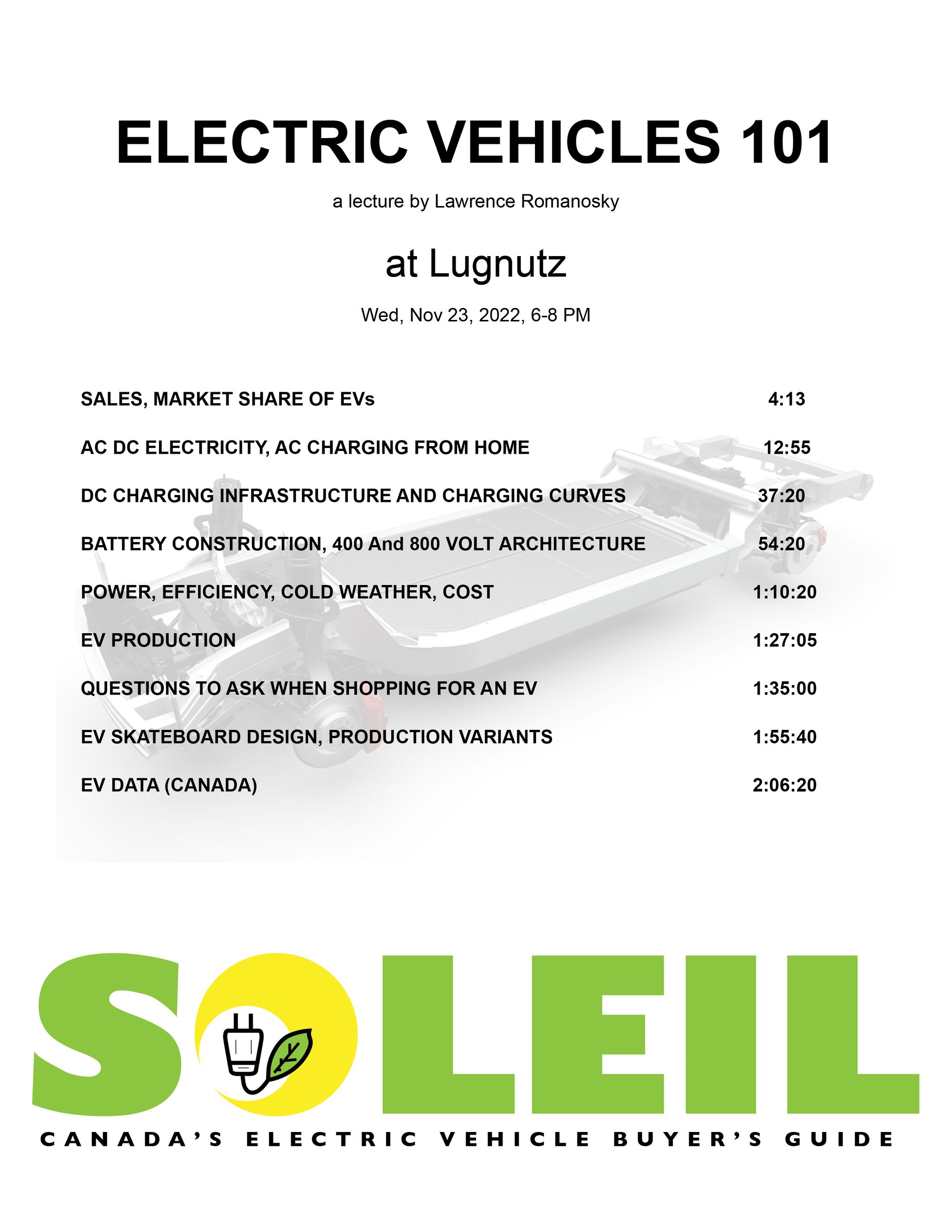 On Wednesday this week, I’m going to host an EV seminar at Lugnutz. This will basically be a “Electric Vehicles 101” lecture that will aim to get the layperson fully up to speed with all matters related to the ownership and operation of an electric vehicle. It will be about a two hour presentation with an EV walk-around and a question period. Here is the ten minute version of the material that I plan to cover: