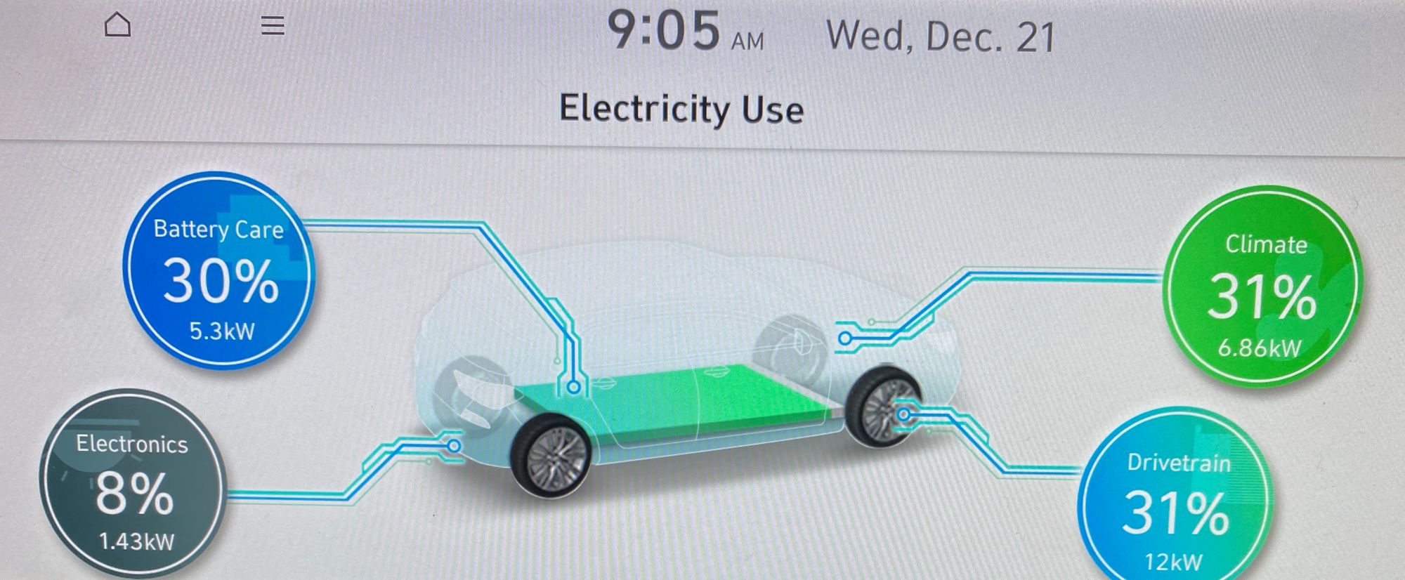 Climate Control: The blower motor and AC may take up something like 2kW in the summer. At -30 C, it is somewhere between 5 and 8kW in the Ioniq 5.