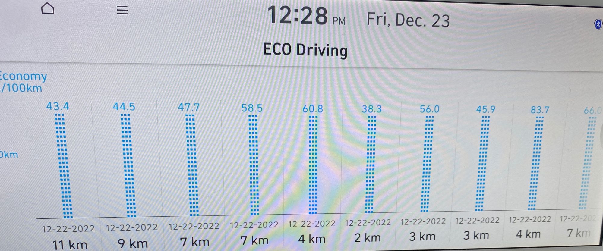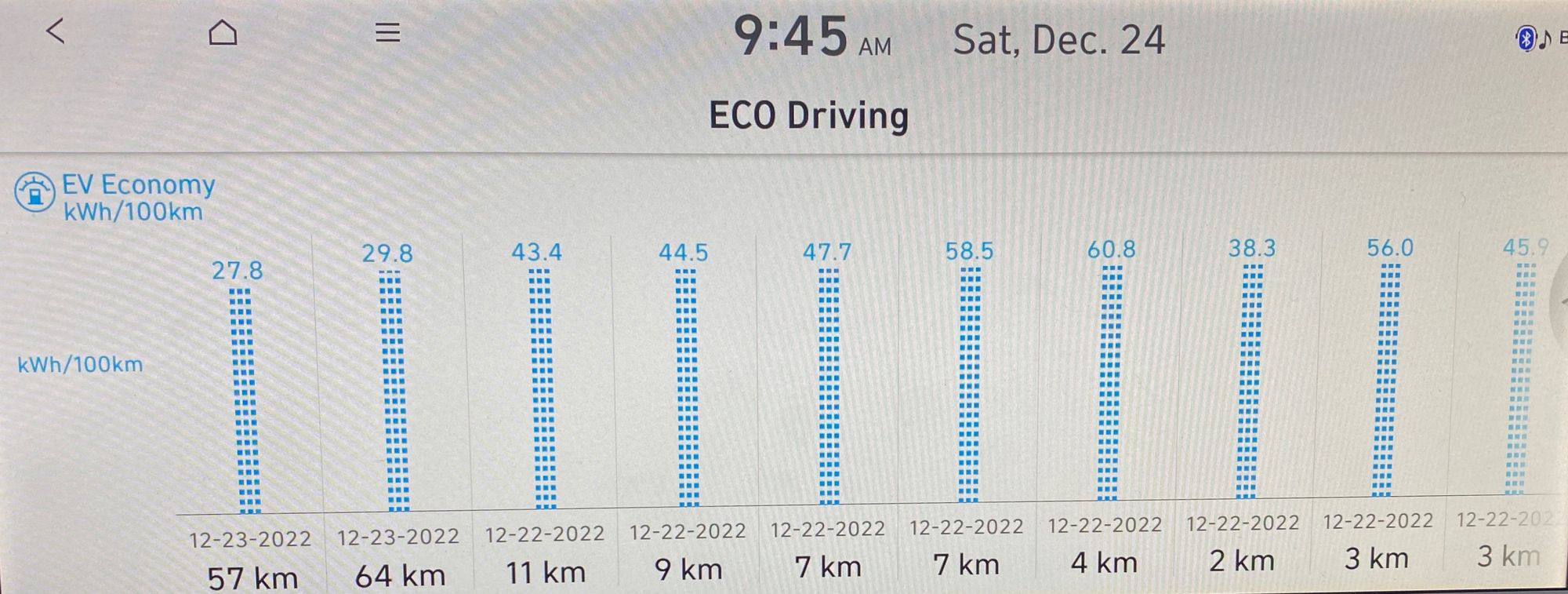 With our Ionic 5, anything over about 30kWh/100km consumption is due to the car warming the battery. Our car is parked outside and charged by a 7.5kW level 2 Grizzl-E EV charger. We set the pre-warming function and departure time so the cabin is warmed and the windows defrosted while it is plugged in. Presumably it warms the battery somewhat, but judging by the power the car diverts to the battery pack for the first 20 minutes of driving, not by that much. If the car were to be stored indoors, we could expect to avoid the excessive electrical consumption for the first trip in the morning at least.