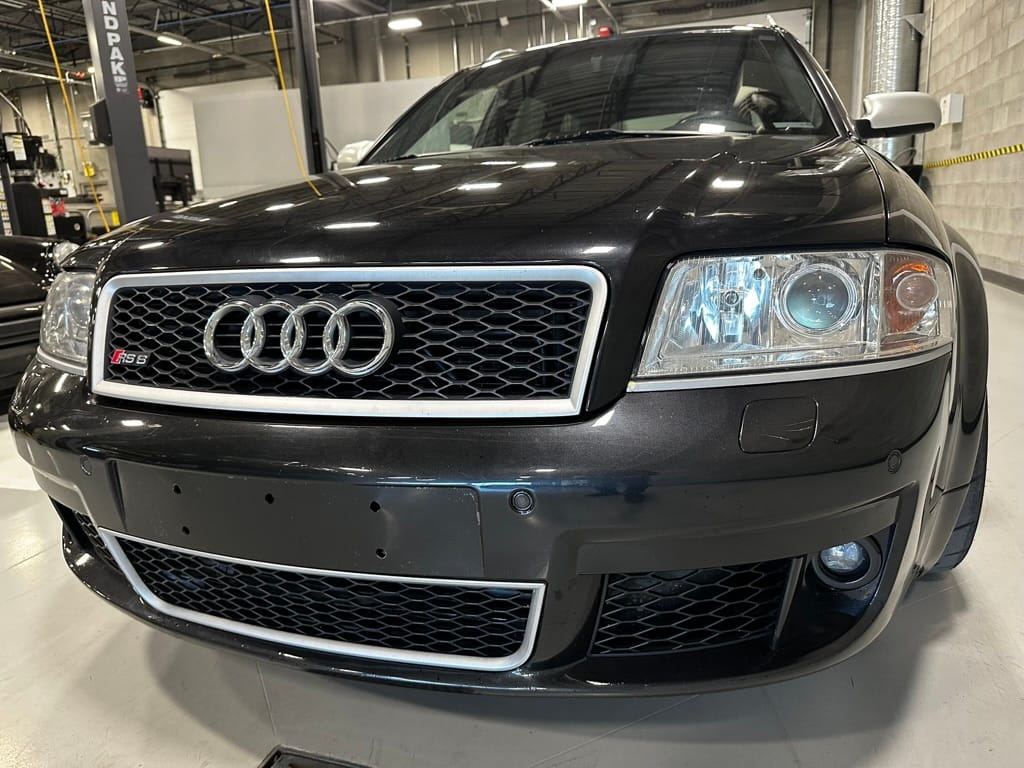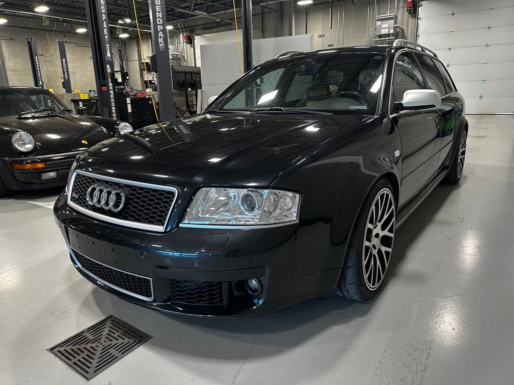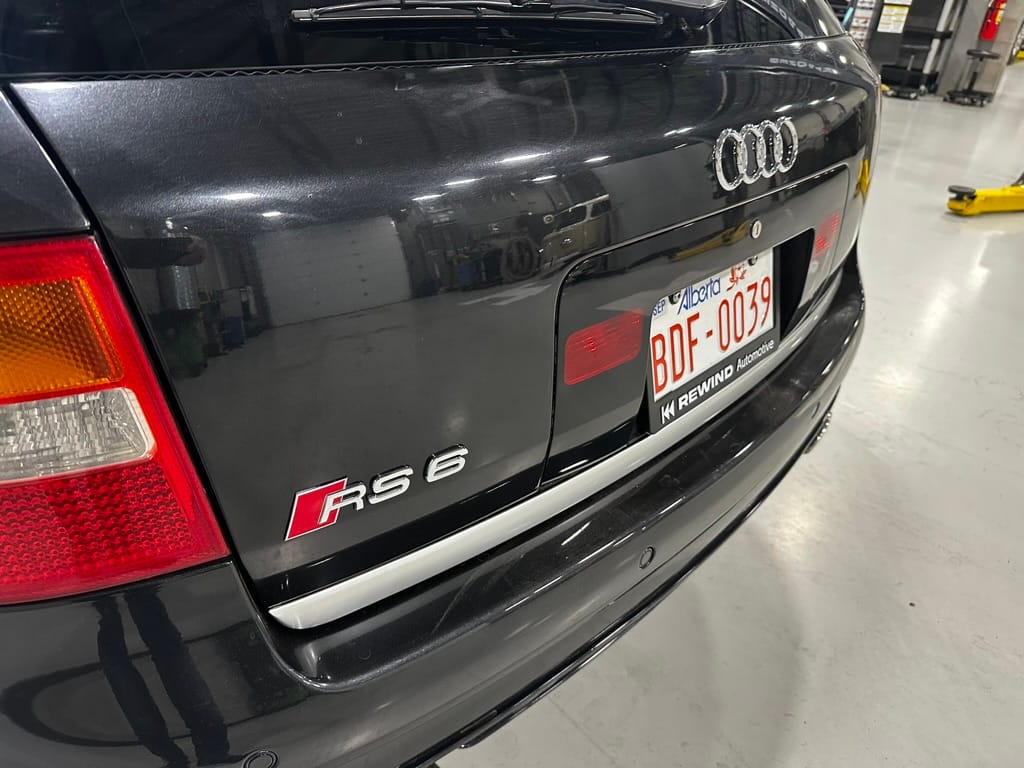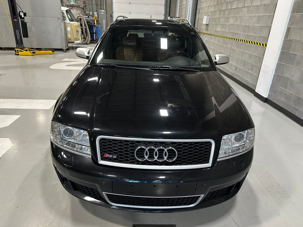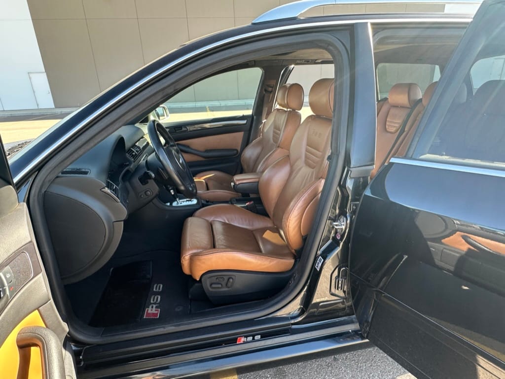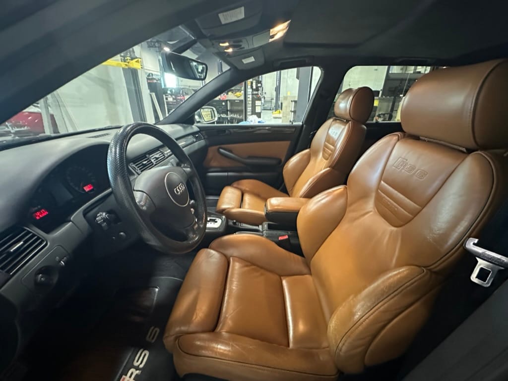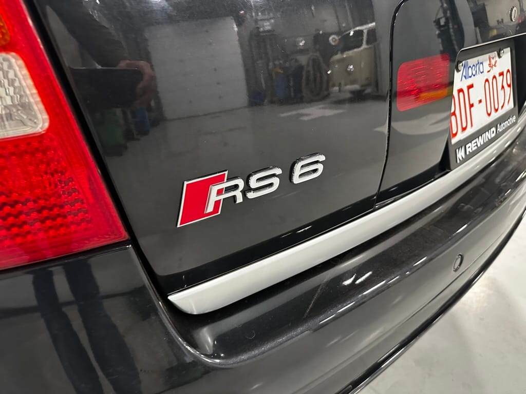 Built by then-Audi-owned Cosworth Technology, the 4.2-liter V8 engine is based on that of the standard RS6, but with bespoke BorgWarner K04 twin turbochargers, side-mounted intercoolers, auxiliary radiators, optimized combustion chambers, ported heads, and a refined piston crown design. Producing up to 473 HP and 428 lb-ft of torque, the engine is paired with a 5-speed Tiptronic automatic transmission and a Quattro all-wheel drive system with a torque-sensing center differential. The RS6 Plus comes with a quicker steering ratio than a standard RS6 and features sport-tuned Dynamic Ride Control (DRC) suspension. Stopping is handled by massive 8-piston Brembo brakes with cross-drilled floating discs in front and single-piston calipers with cross-drilled discs at the rear. Service completed in 2021 at 177k kilometers included a new water pump, timing belts, cam tensioner seals, intake manifold gaskets, a left-front CV joint, transmission service, a rebuilt transmission cooler, a power steering and brake fluid flush, new rear differential fluid, and an oil change.