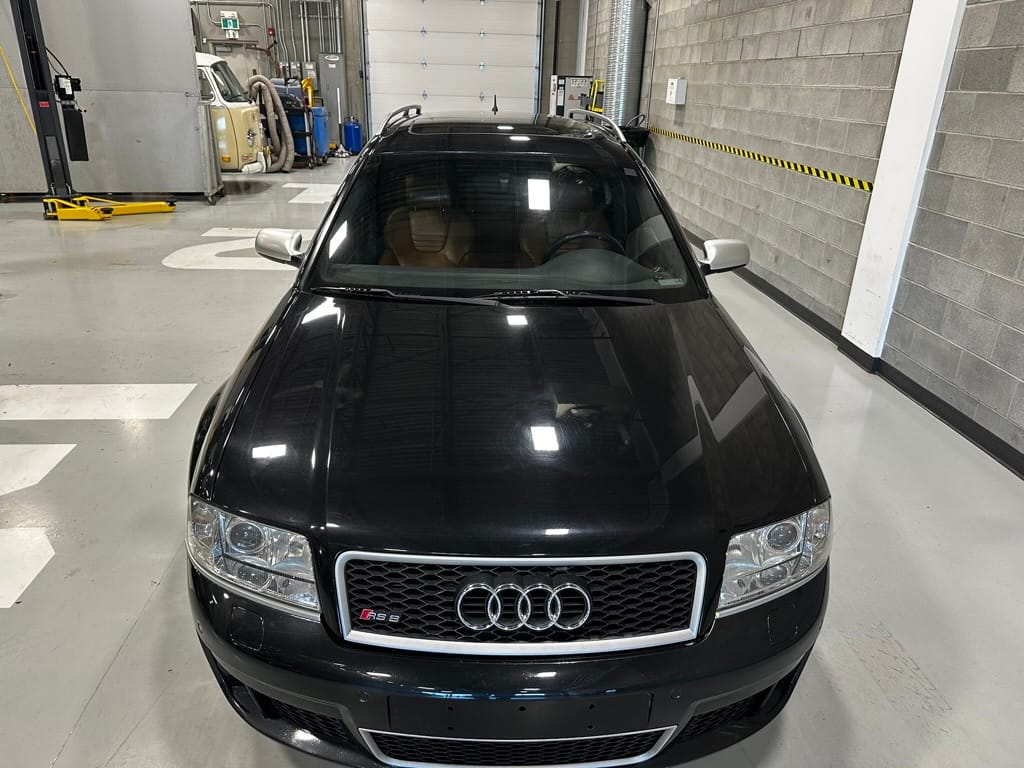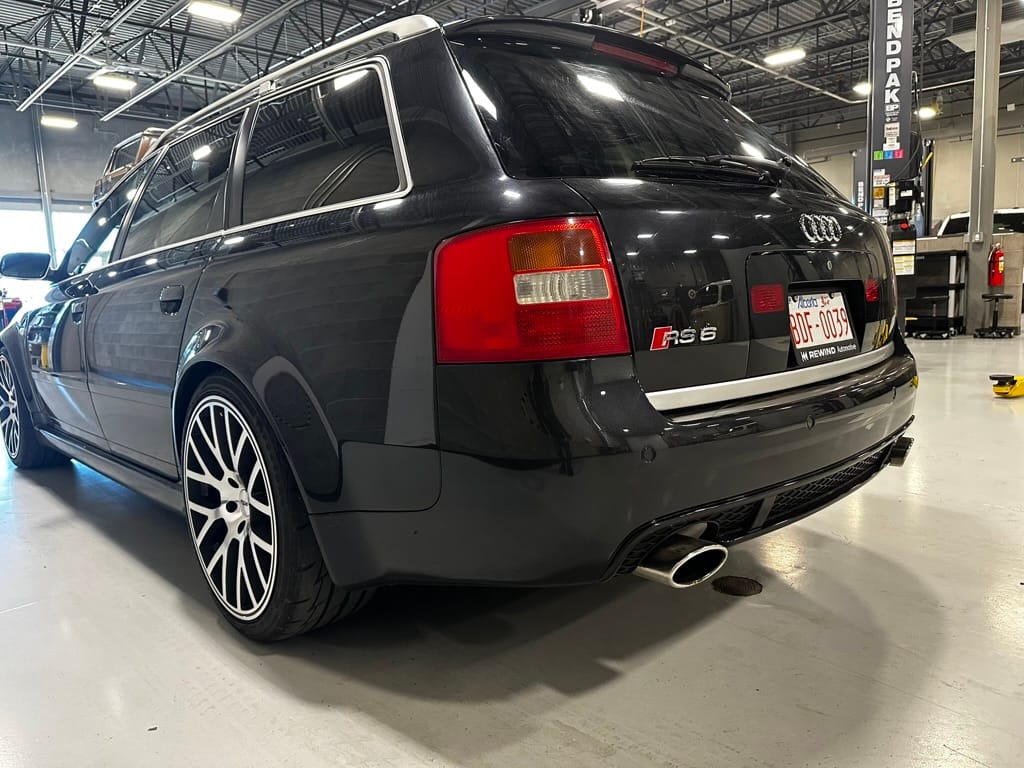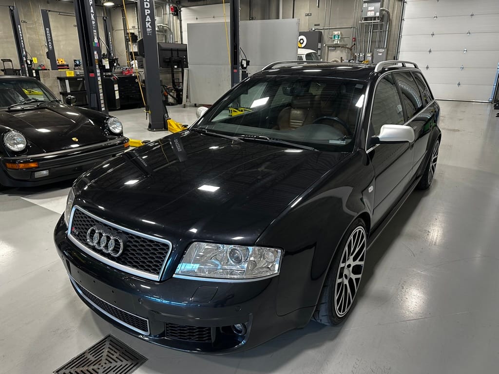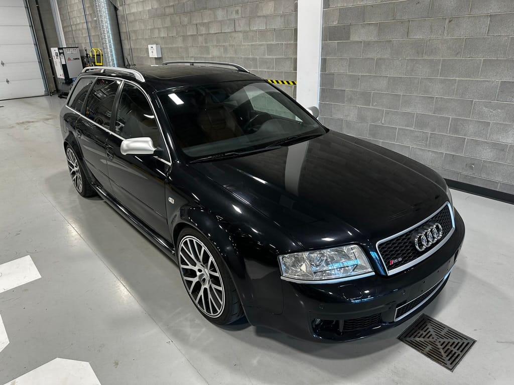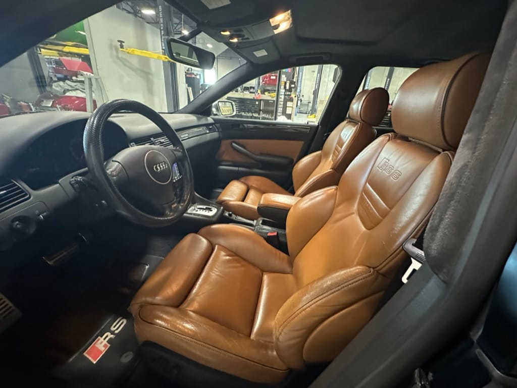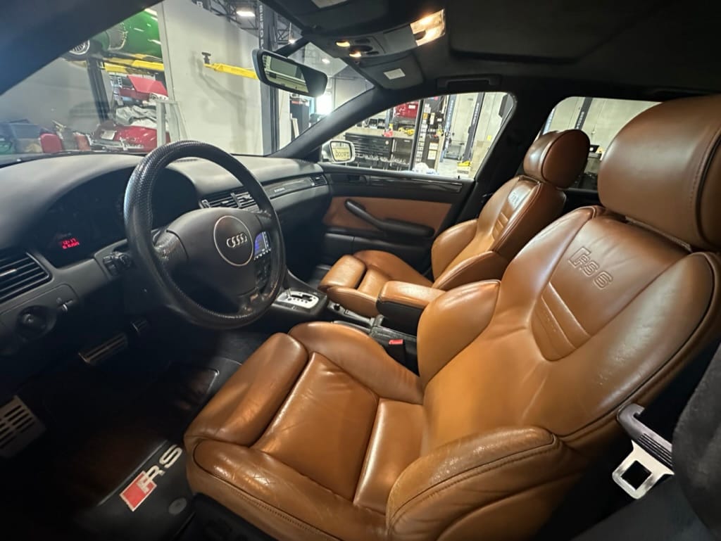 Built by then-Audi-owned Cosworth Technology, the 4.2-liter V8 engine is based on that of the standard RS6, but with bespoke BorgWarner K04 twin turbochargers, side-mounted intercoolers, auxiliary radiators, optimized combustion chambers, ported heads, and a refined piston crown design. Producing up to 473 HP and 428 lb-ft of torque, the engine is paired with a 5-speed Tiptronic automatic transmission and a Quattro all-wheel drive system with a torque-sensing center differential. The RS6 Plus comes with a quicker steering ratio than a standard RS6 and features sport-tuned Dynamic Ride Control (DRC) suspension. Stopping is handled by massive 8-piston Brembo brakes with cross-drilled floating discs in front and single-piston calipers with cross-drilled discs at the rear. Service completed in 2021 at 177k kilometers included a new water pump, timing belts, cam tensioner seals, intake manifold gaskets, a left-front CV joint, transmission service, a rebuilt transmission cooler, a power steering and brake fluid flush, new rear differential fluid, and an oil change.