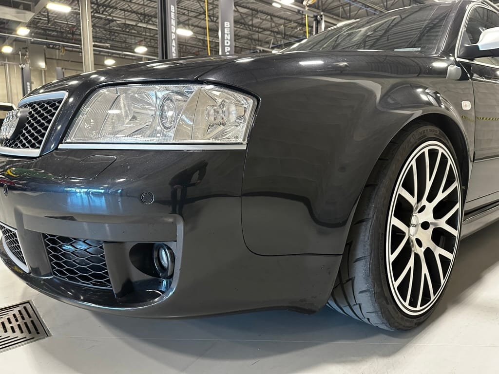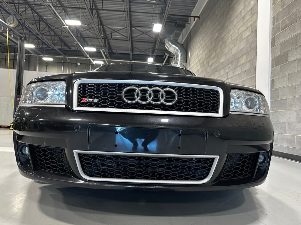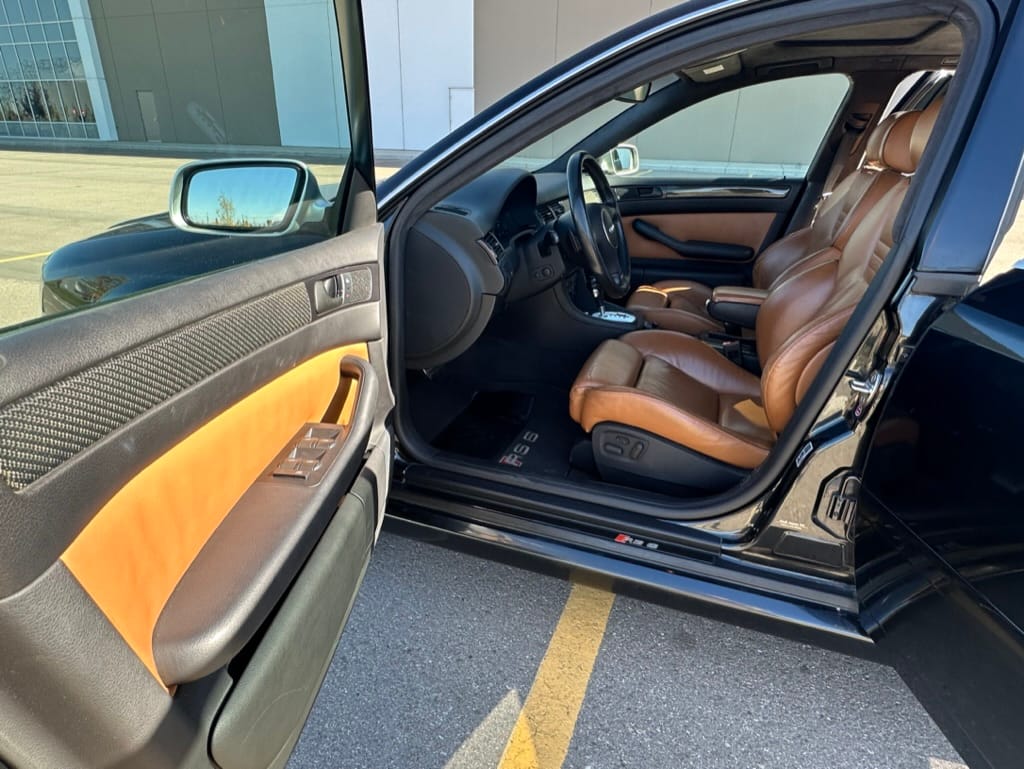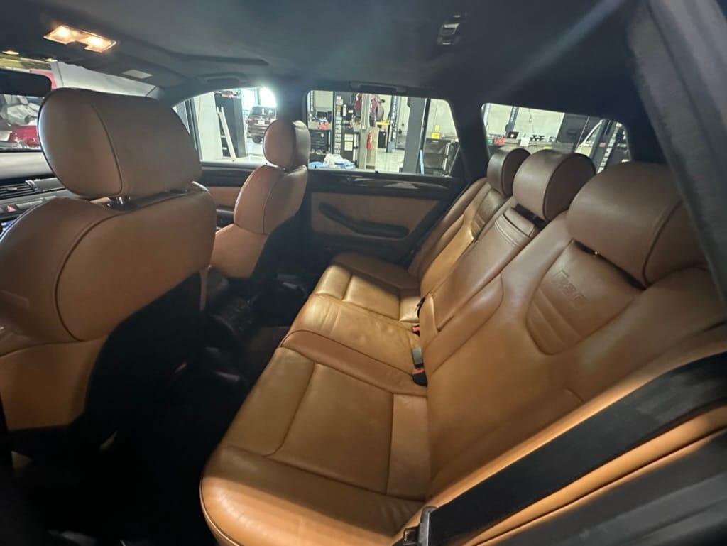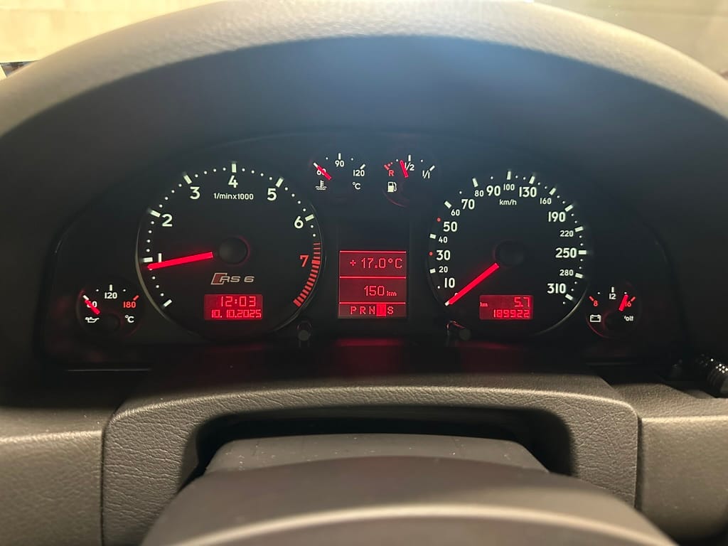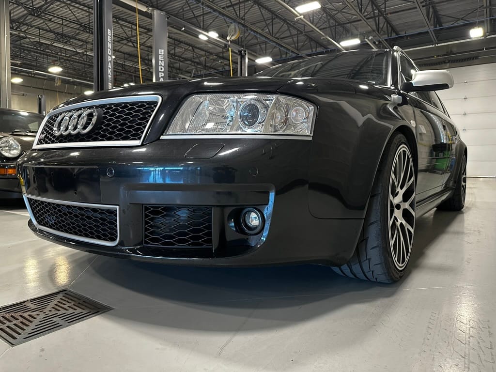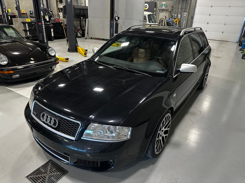 Built by then-Audi-owned Cosworth Technology, the 4.2-liter V8 engine is based on that of the standard RS6, but with bespoke BorgWarner K04 twin turbochargers, side-mounted intercoolers, auxiliary radiators, optimized combustion chambers, ported heads, and a refined piston crown design. Producing up to 473 HP and 428 lb-ft of torque, the engine is paired with a 5-speed Tiptronic automatic transmission and a Quattro all-wheel drive system with a torque-sensing center differential. The RS6 Plus comes with a quicker steering ratio than a standard RS6 and features sport-tuned Dynamic Ride Control (DRC) suspension. Stopping is handled by massive 8-piston Brembo brakes with cross-drilled floating discs in front and single-piston calipers with cross-drilled discs at the rear. Service completed in 2021 at 177k kilometers included a new water pump, timing belts, cam tensioner seals, intake manifold gaskets, a left-front CV joint, transmission service, a rebuilt transmission cooler, a power steering and brake fluid flush, new rear differential fluid, and an oil change.