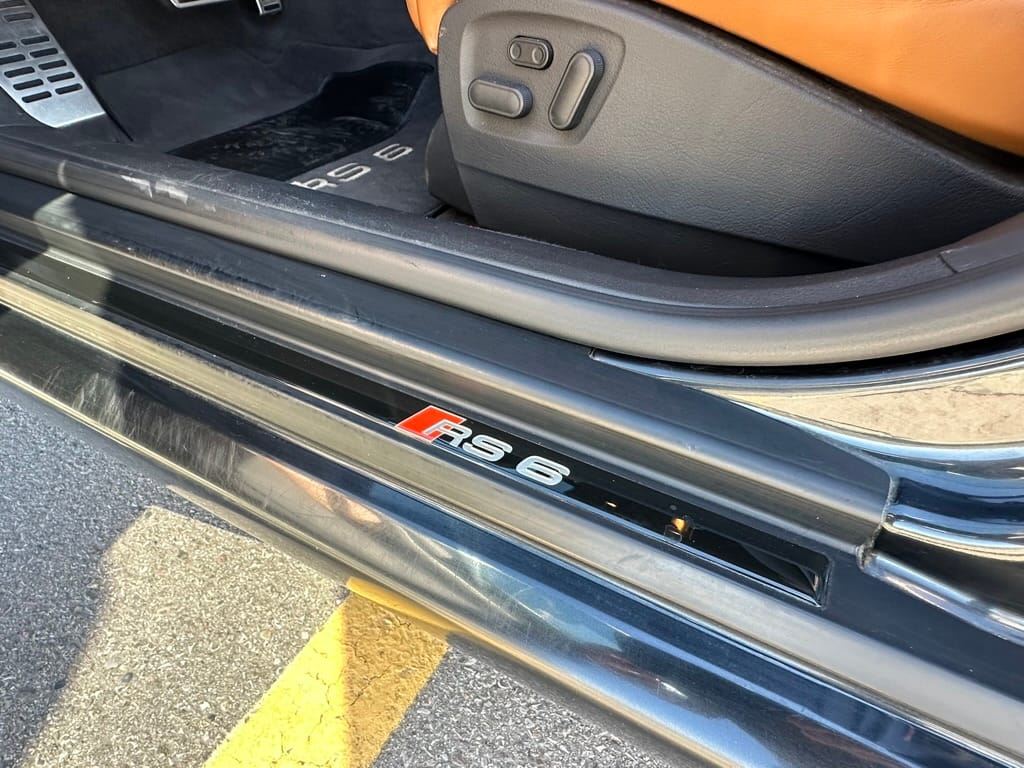 This RS6 Plus is finished in Ebony Black Pearl (LZ9W) and features unique aluminum exterior trim, unlike European-market examples, which came with the Black-Optic Package. Details include an RS6-specific fascia, flared fenders, side skirts, aluminum mirror caps, roof rails, an electric sunroof, a rear window wiper, parking sensors, polished dual exhaust tips, and RS-branded brake calipers. The car rides on 19” TSW wheels dressed with 2022 Firehawk Indy tires, and the original Anthracite-painted 19” 5-arm alloy wheels have been refinished and are included in the sale. The seller describes the car as being in excellent condition for its age and mileage, noting small, touched-up stone chips on the front bumper. Detailed images are provided in the gallery along with a clean CARFAX report.