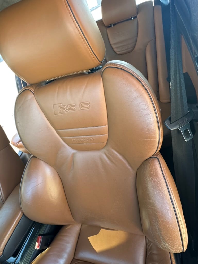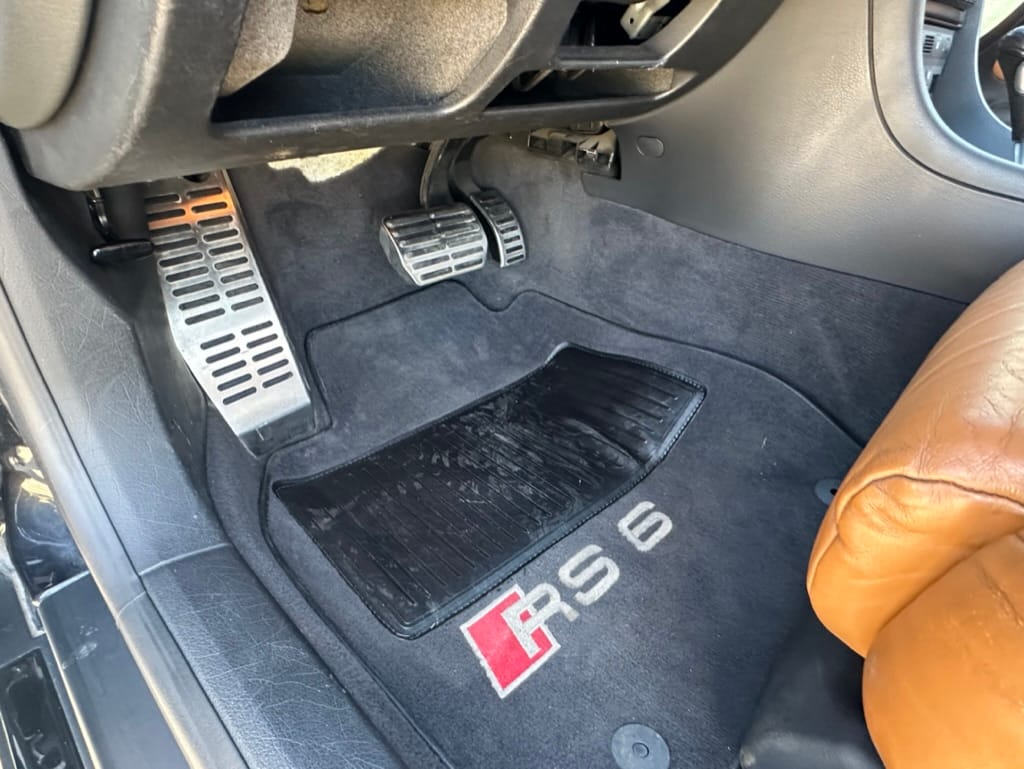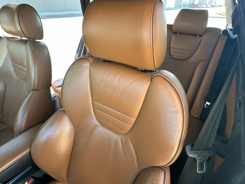 The black interior features saddle brown leather Recaro sport seats and door panel inserts, carbon fiber trim pieces, and a black Alcantara headliner. Other accessories include RS6-embossed seatbacks, RS6 door sill logos, RS-branded floor mats, a three-spoke RS sport steering wheel, paddle shifters, aluminum pedal covers, automatic climate control, a digital trip computer, and an aftermarket Kenwood multimedia head unit. The leather is said to be in good condition with gentle patina.